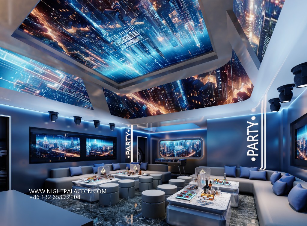 Night Palace KTV is a high-end party venue that integrates modern design, technological atmosphere and entertainment experience, dedicated to creating an immersive singing space for each customer. Our environment is characterized by avant-garde decoration, with corridors and boxes in main colors such as black, purple and blue, combined with wavy ceiling light strips, arched lamps and cool screen lighting to create a multi-atmosphere that is either mysterious and dreamy or technological dynamic.