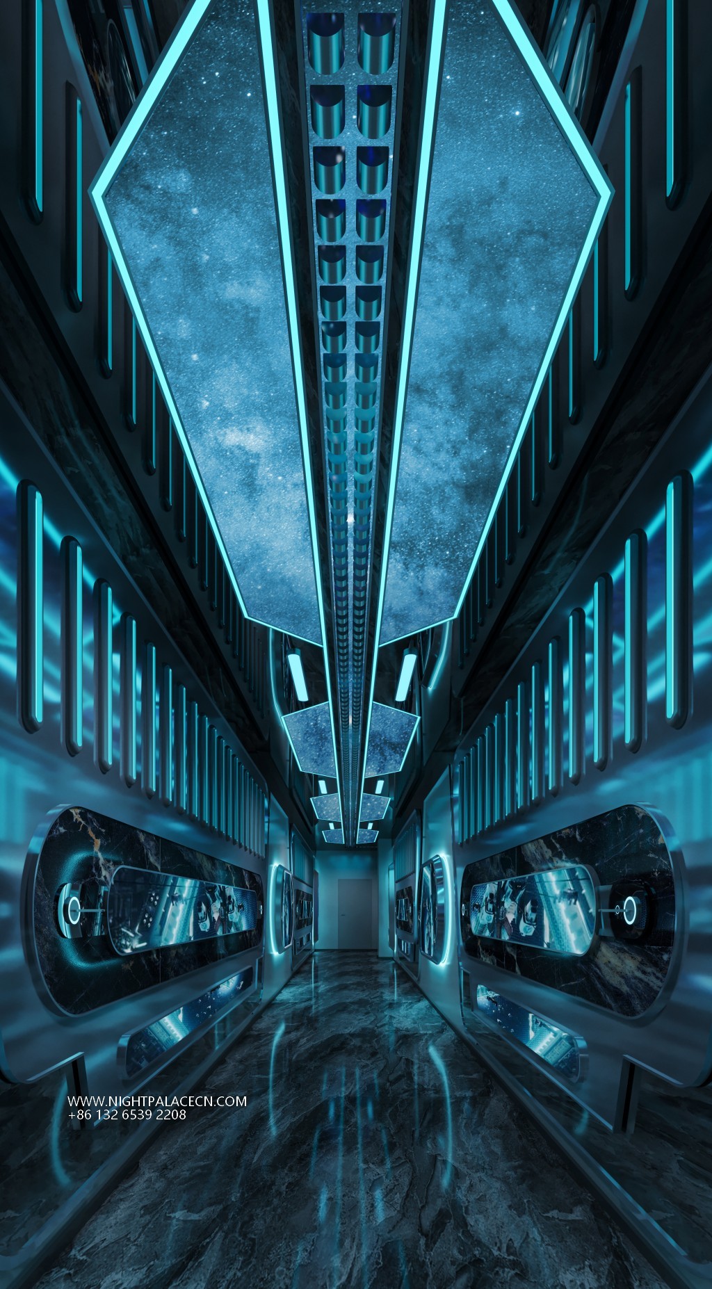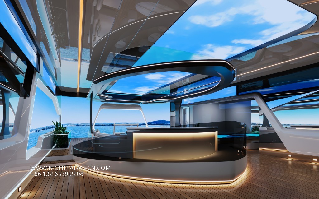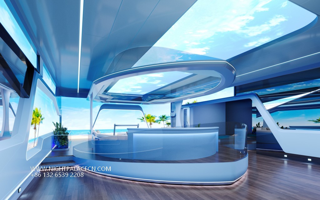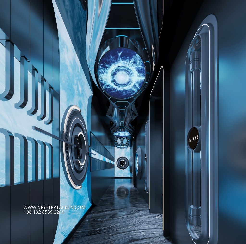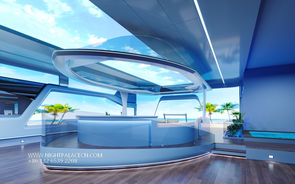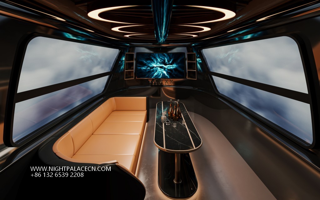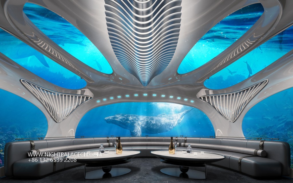 Its appearance is very visual impact. The giant curved screen dynamically displays cool pictures such as surfing, and the unique robot device above shows the charm of technology. The interior space design is even more stunning: the blue curved light strip in the box is surrounded by flowing, professional audio and multi-screen display system to create an immersive audio-visual feast; the top of the corridor is like a starry sky whirlpool, and the geometric light and shadow on both sides create a time-space tunnel-like fantasy experience; there is also a characteristic underwater theme area. The ring sofa is located on the blue "bottom of the sea", and the giant whale cruises outside the window. The atmosphere is dreamy and unique.