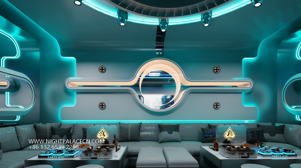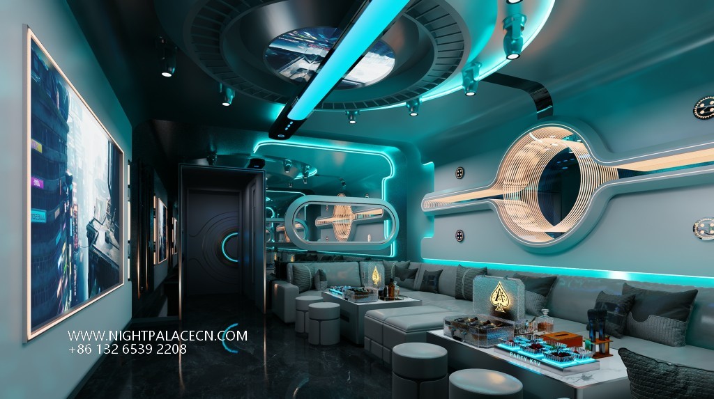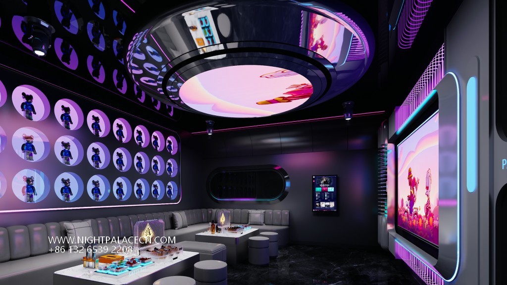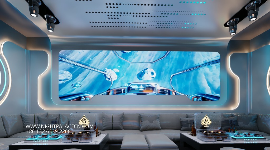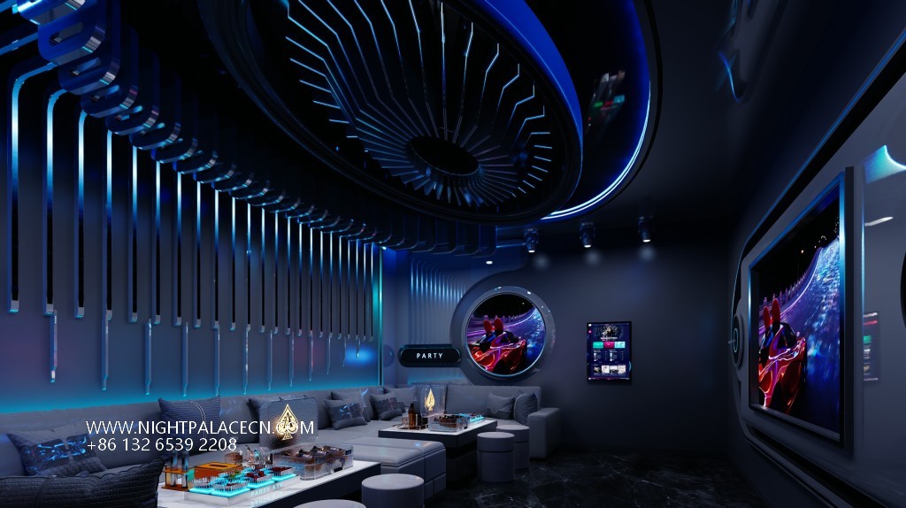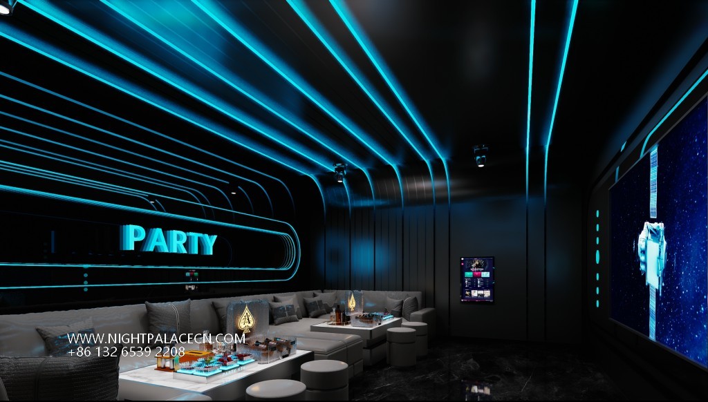The box space is the essence of the design: the circular light matrix interweaves into bright galaxies in the ceiling, and the giant screen wall synchronizes the interstellar navigation animation or cyberpunk theme pictures, forming a multi-level visual impact with the flowing blue-purple light strips on the wall. The details show the ultimate ingenuity: the circular porthole design enhances the immersion of the space capsule, the gray leather sofa is paired with a luminous marble coffee table, and the "PARTY" neon signs, cartoon bear pattern decorative lights, and even the luminous wine sets carefully placed on the coffee table all reflect the fashionable and energetic party atmosphere.