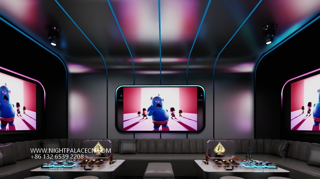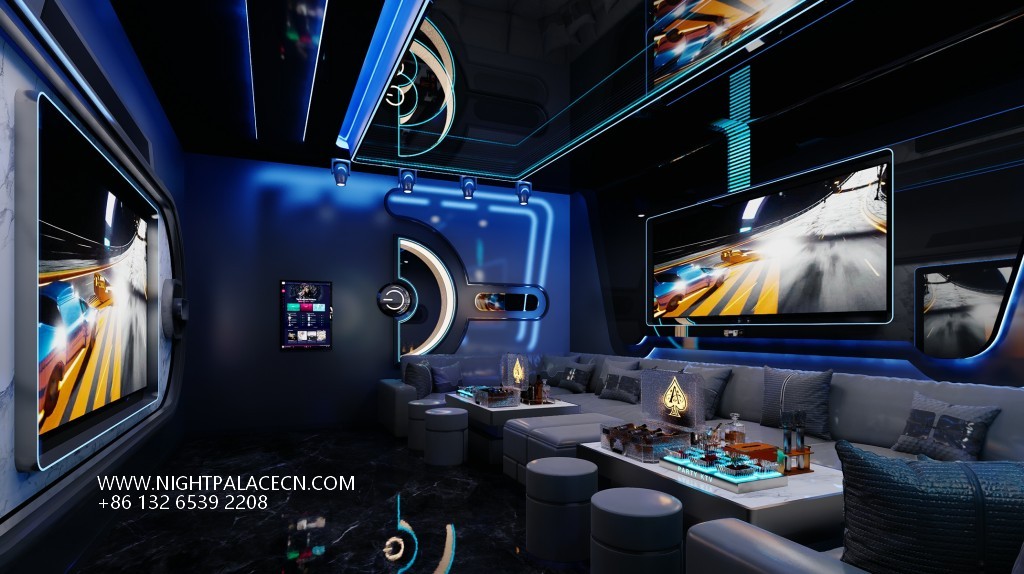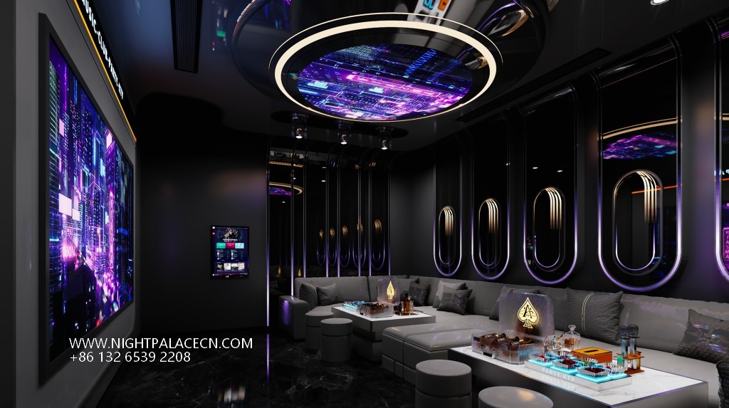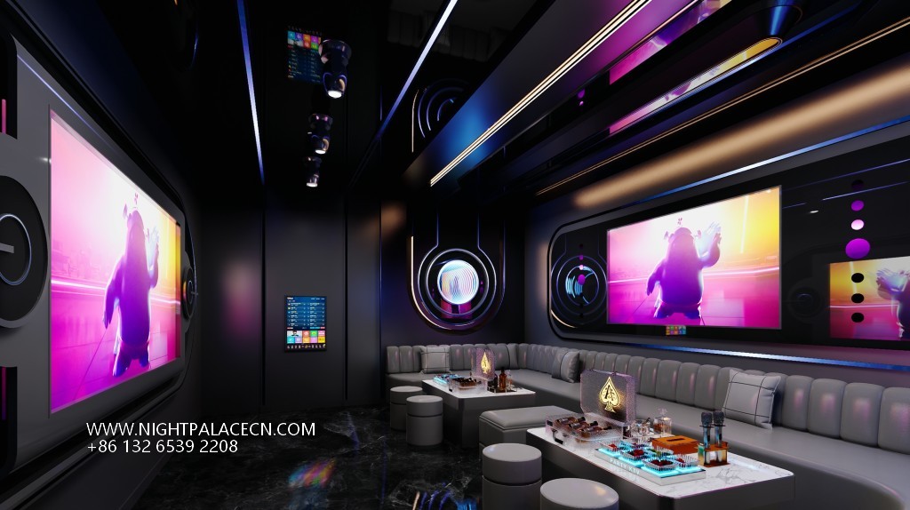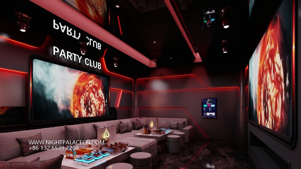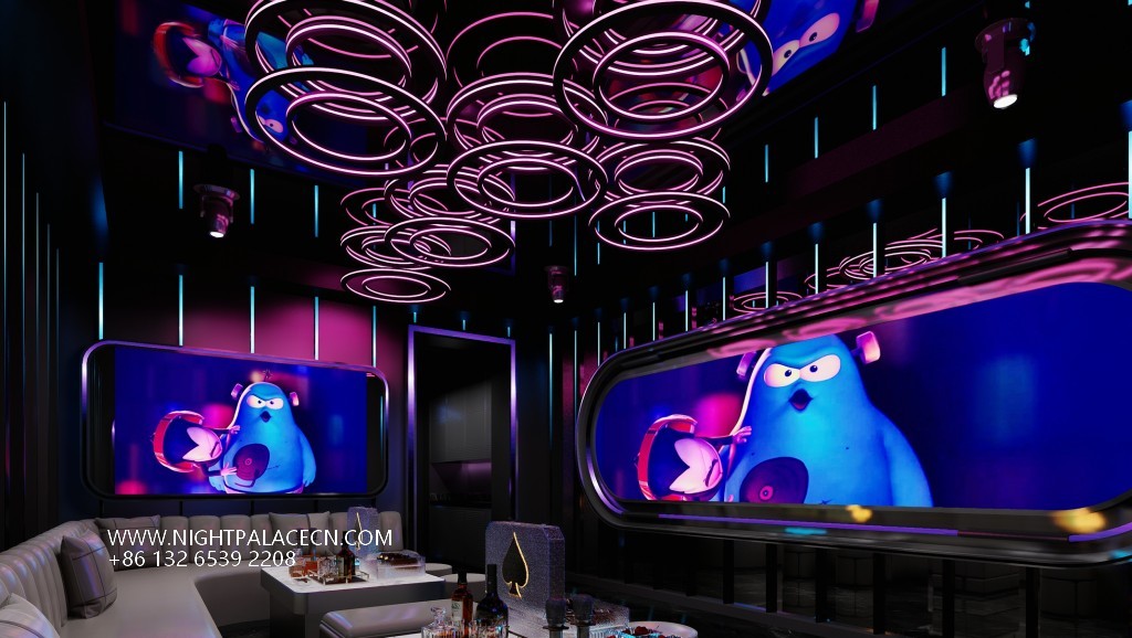 The box space is the essence of the design: the circular light matrix interweaves into bright galaxies in the ceiling, and the giant screen wall synchronizes the interstellar navigation animation or cyberpunk theme pictures, forming a multi-level visual impact with the flowing blue-purple light strips on the wall. The details show the ultimate ingenuity: the circular porthole design enhances the immersion of the space capsule, the gray leather sofa is paired with a luminous marble coffee table, and the "PARTY" neon signs, cartoon bear pattern decorative lights, and even the luminous wine sets carefully placed on the coffee table all reflect the fashionable and energetic party atmosphere.