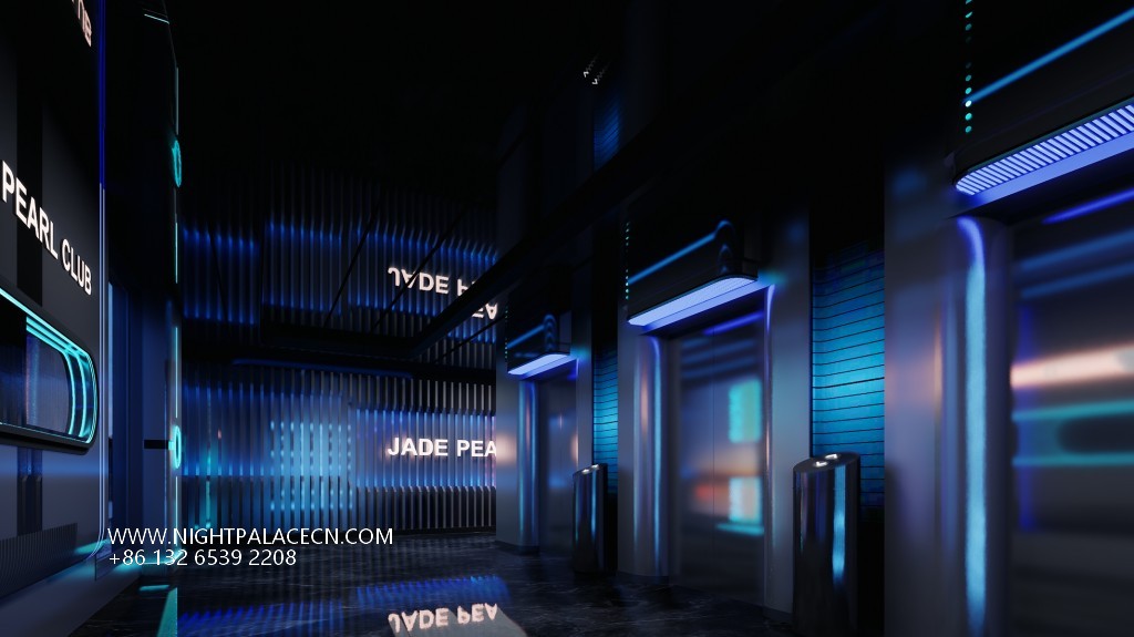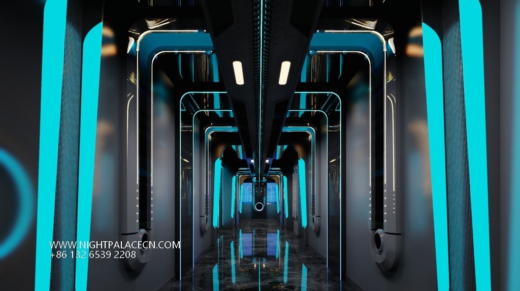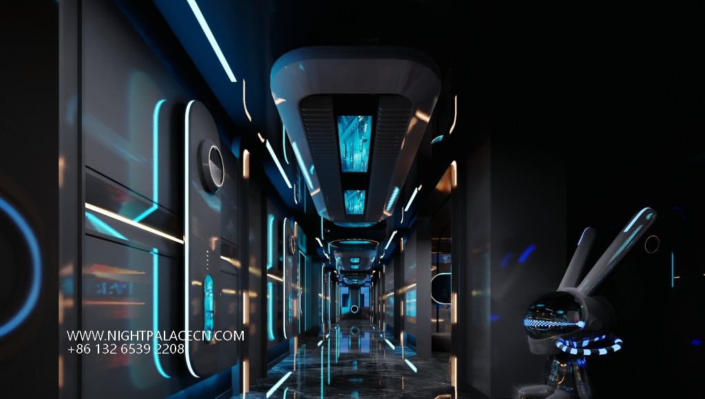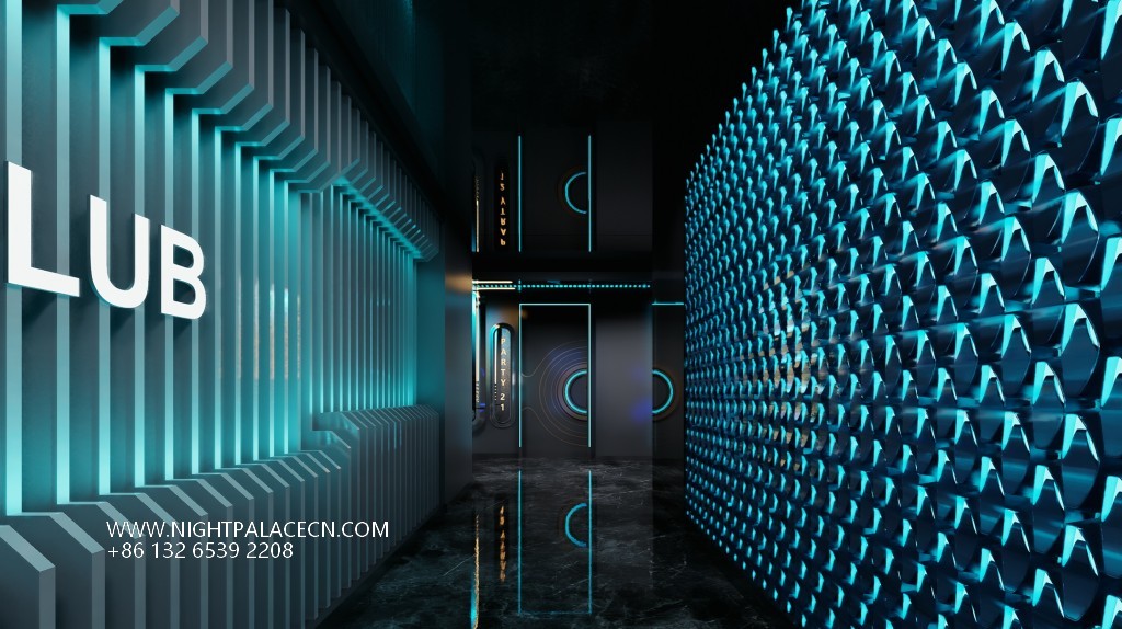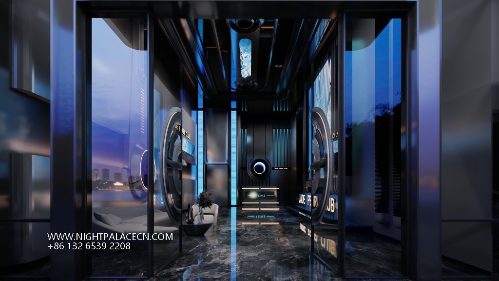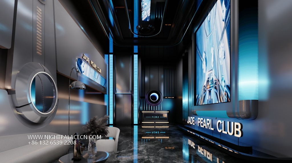 Guangdong Lufeng Jade Pearl KTV takes "futuristic aesthetics" as the core, combining interstellar travel, light and shadow art and immersive entertainment to create a unique high-end entertainment hall in eastern Guangdong. From the moment you step into the venue, guests step into a sci-fi world beyond reality - the entrance corridor extends to the end of the field with a deep blue-green arc of light, and the black mirror ground reflects the starry sky ceiling, as if leading a journey into the future.