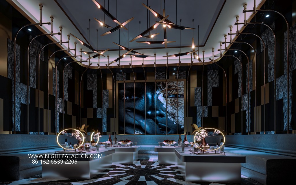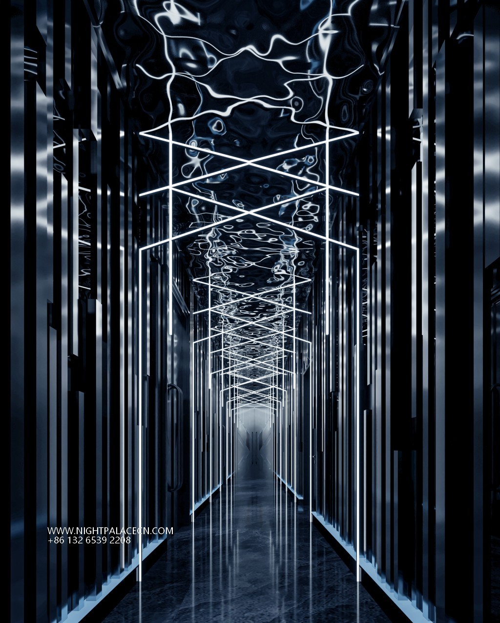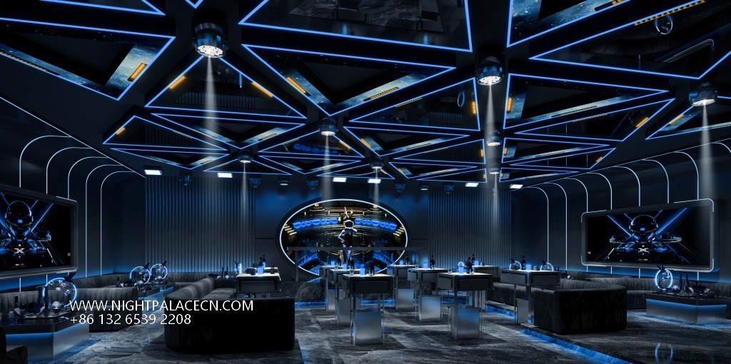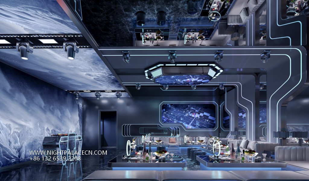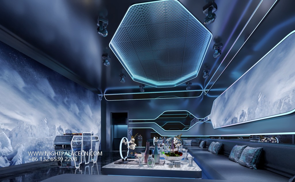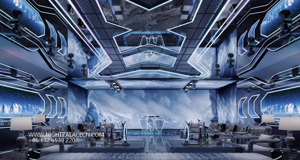 Entering the venue is as if you have traveled to the future city. The metal columns on both sides of the channel and the white light strips interlaced at the top form a time-space tunnel to guide guests into the core area. The main space is dark blue and black as the main colors, with flowing blue-purple neon strips, and multiple giant screens are embedded in the wall. Dynamic pictures such as interstellar navigation and cyber cities are broadcast in rotation, forming a three-dimensional visual impact with the geometric light matrix on the ceiling (such as hexagonal installations and starry sky roofs). The details show ingenuity: the glacier-textured wall, the luminous coffee table in the ring sofa area, the embellished "PARTY" neon signs, and even the colorful lighting on the transparent wine table create a cold and energetic atmosphere.