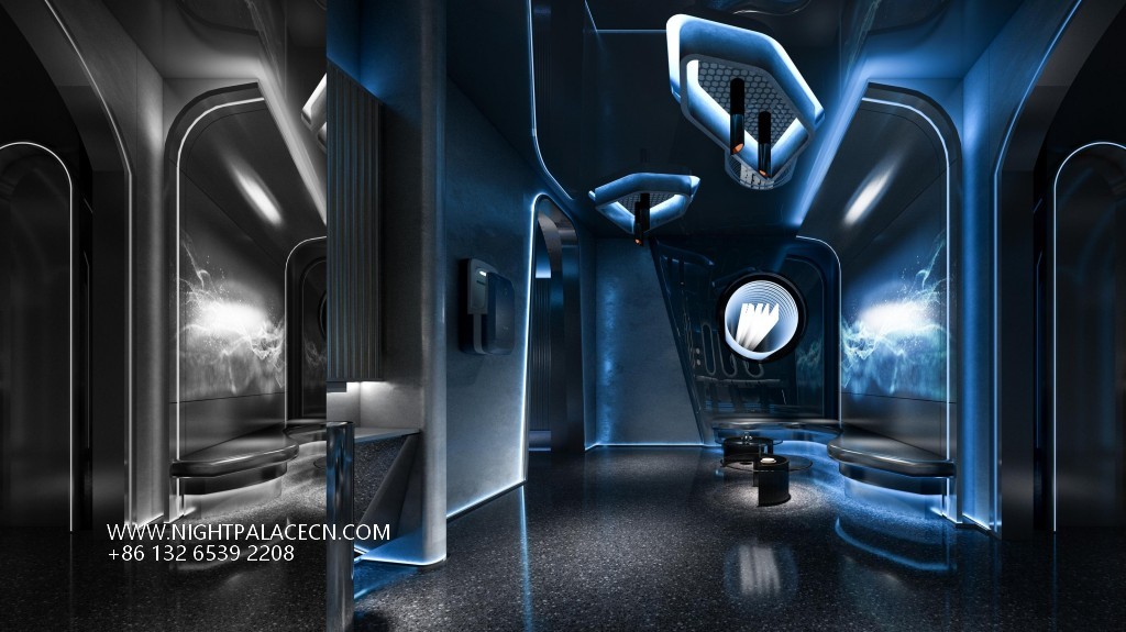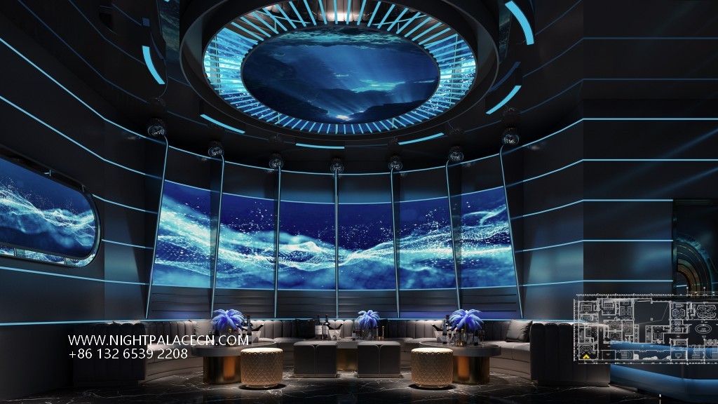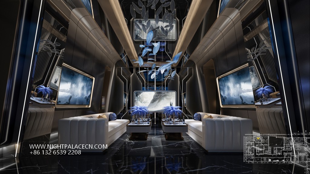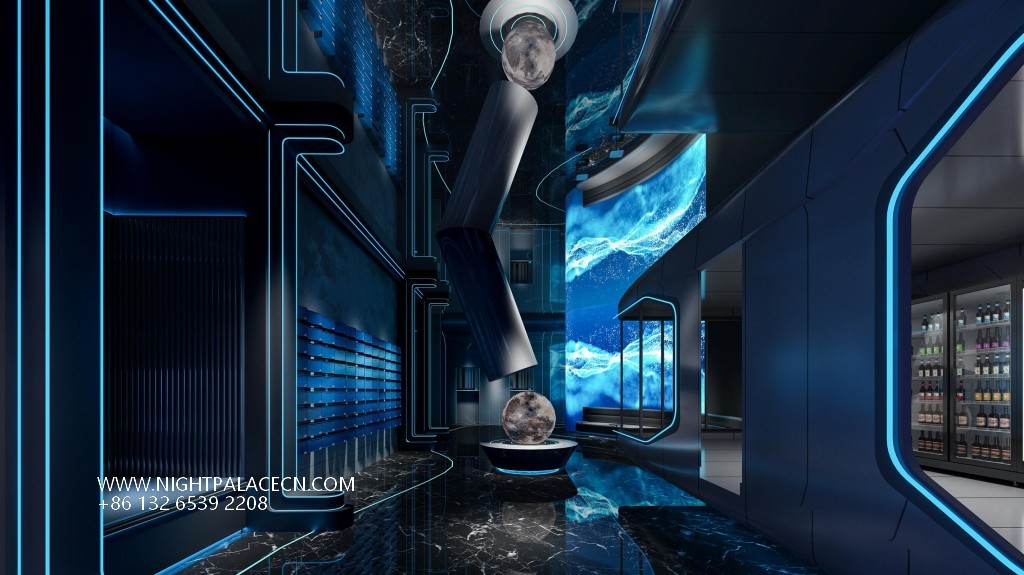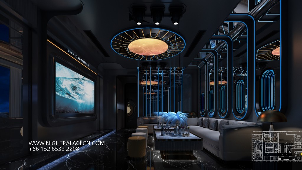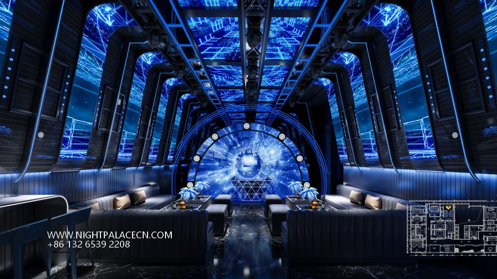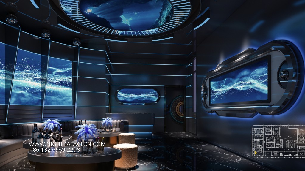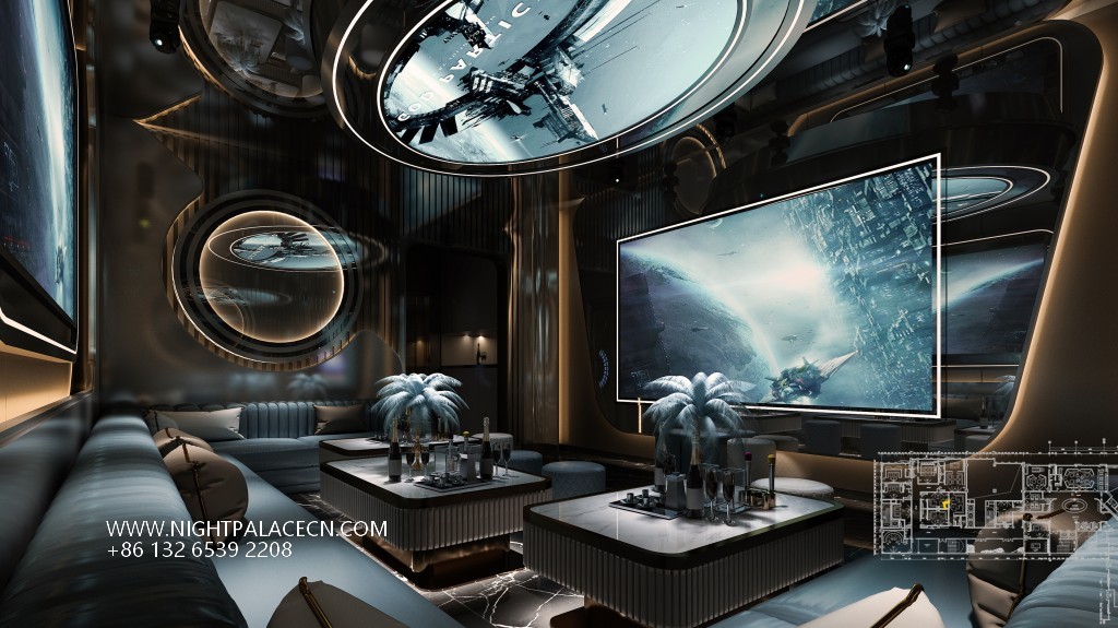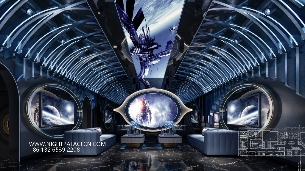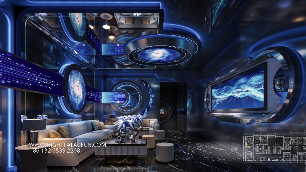 The club is dominated by deep blue and black, incorporating metallic texture and streamer elements to create a mysterious and cool atmosphere. The curved light strip corridor at the entrance is like a time and space tunnel, guiding guests into the core area. The main space presents a multi-level visual impact: a giant crystal chandelier is hung in the center, and the geometric light matrix staggered at the top forms a bright galaxy; the symmetrical giant screen on both sides broadcasts dynamic pictures such as interstellar navigation and cyber city, echoing the astronauts and planetary landscapes in the round porthole of the wall. The box shows more technological tension. The background wall creates an immersive scene with blue-purple energy vortex or digital matrix pattern. It is matched with gray curved sofa, luminous marble coffee table and blue robot decoration, which perfectly balances futurism and comfort.