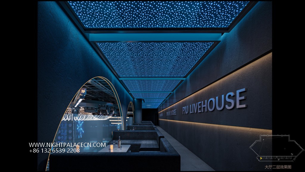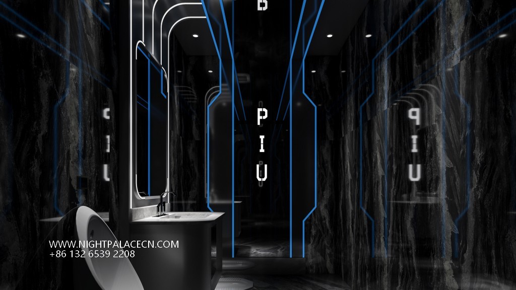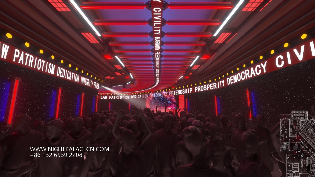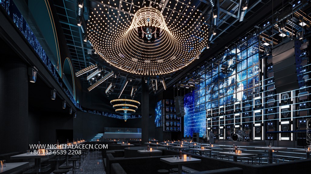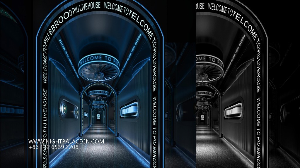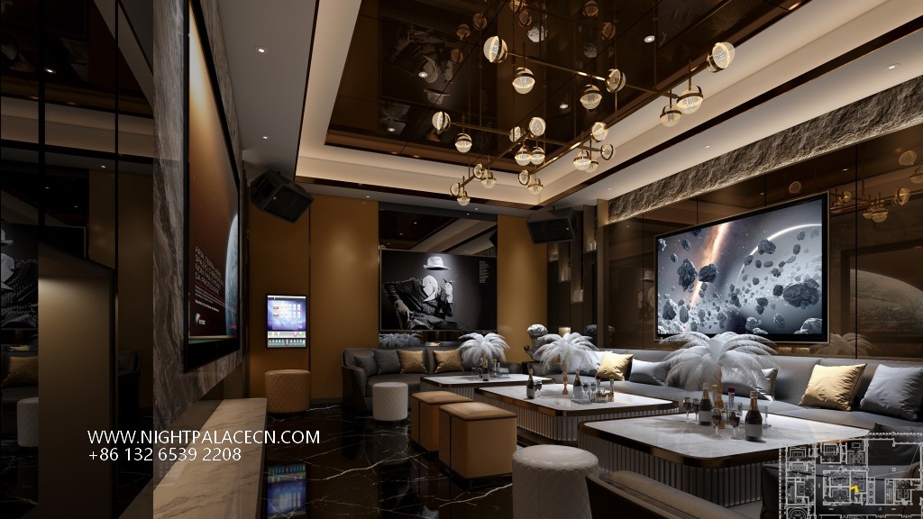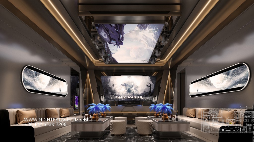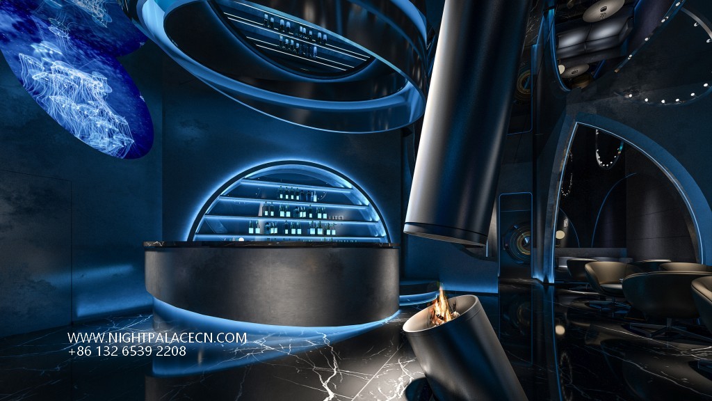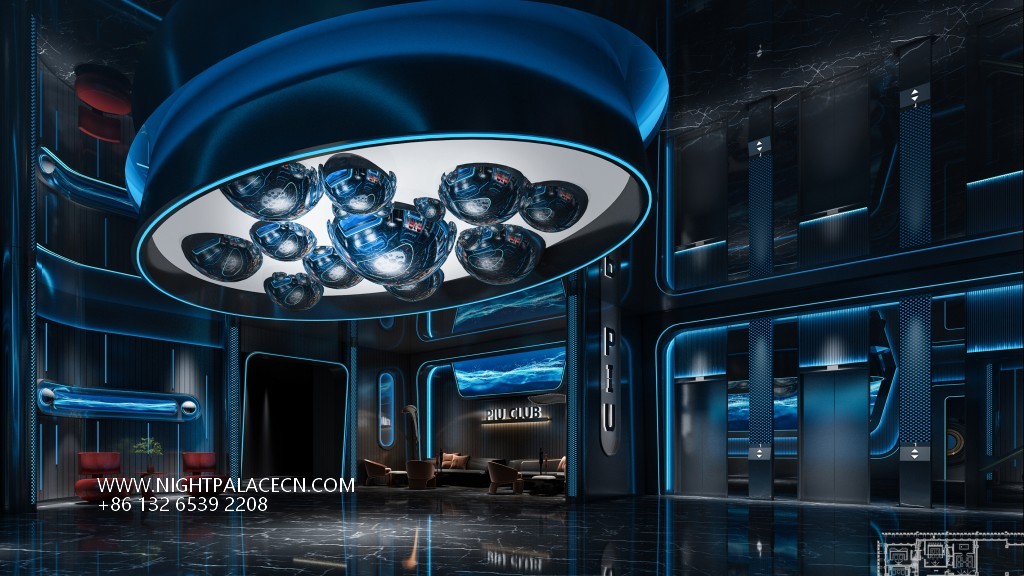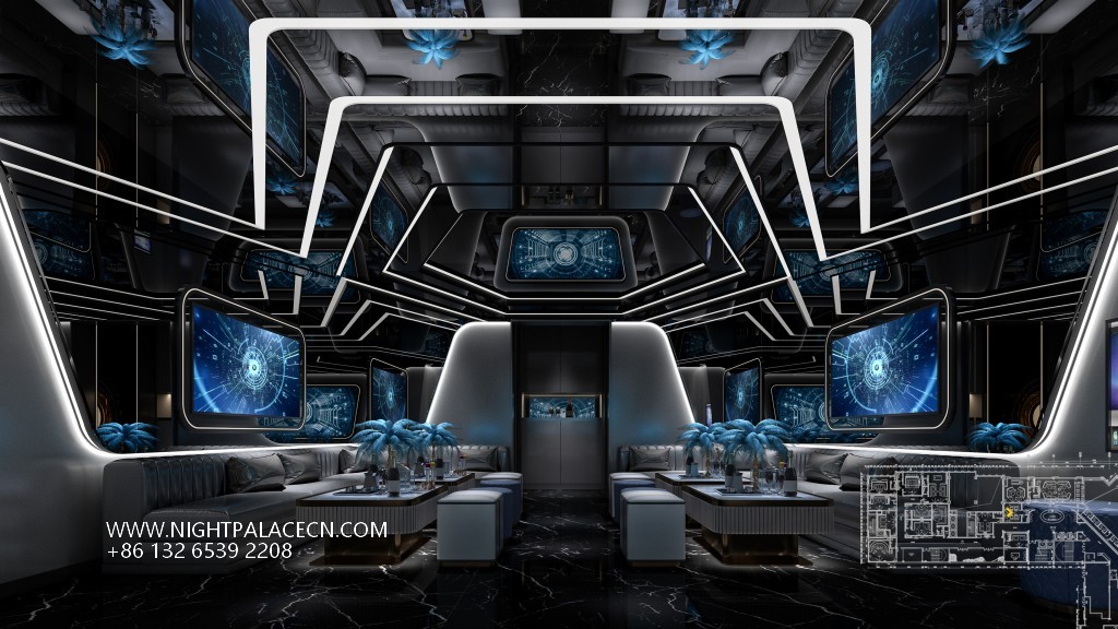 The club is dominated by deep blue and black, incorporating metallic texture and streamer elements to create a mysterious and cool atmosphere. The curved light strip corridor at the entrance is like a time and space tunnel, guiding guests into the core area. The main space presents a multi-level visual impact: a giant crystal chandelier is hung in the center, and the geometric light matrix staggered at the top forms a bright galaxy; the symmetrical giant screen on both sides broadcasts dynamic pictures such as interstellar navigation and cyber city, echoing the astronauts and planetary landscapes in the round porthole of the wall. The box shows more technological tension. The background wall creates an immersive scene with blue-purple energy vortex or digital matrix pattern. It is matched with gray curved sofa, luminous marble coffee table and blue robot decoration, which perfectly balances futurism and comfort.
