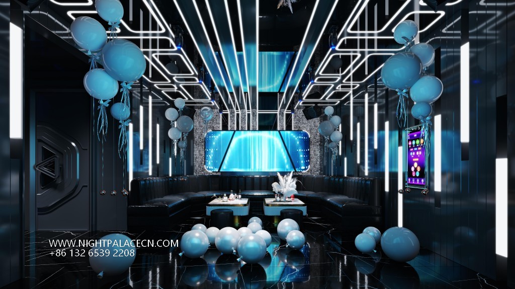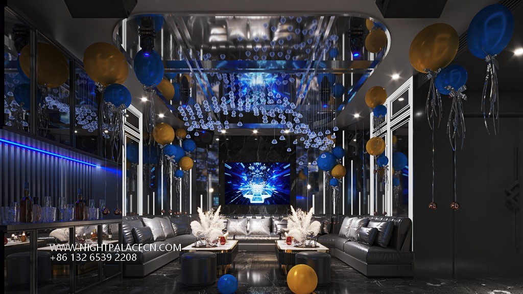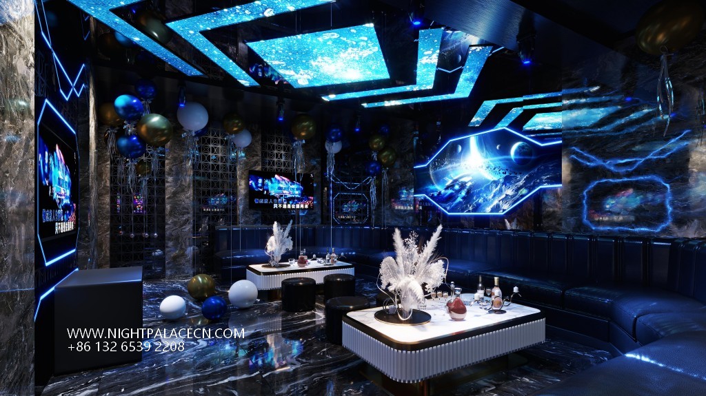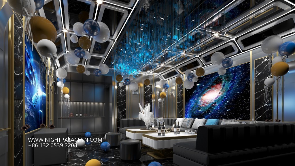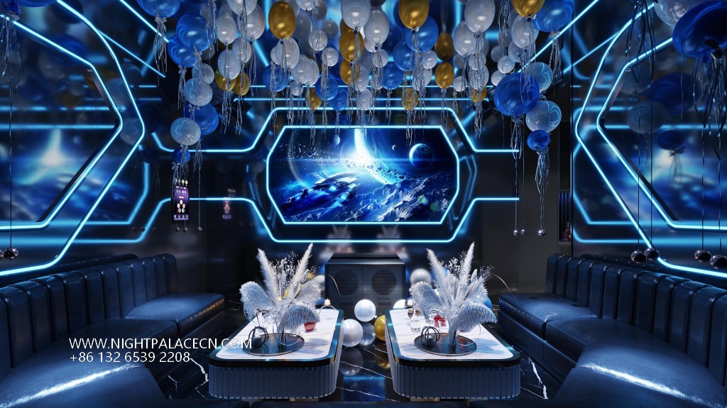 The venue is dominated by deep blue and black, and clever use of lighting technology to create immersive scenes. The corridor extended by the blue light band at the entrance is like a time-space tunnel, guiding guests into the core area. The box presents a strong sense of futurism: the hexagonal geometric wall is embedded with a dynamic starry sky giant screen, and the fantasy images such as planets and galaxies are rotated; the ceiling creates a bright starry sky effect with a staggered matrix of light bands and hanging crystal pendants, and is matched with suspended silver and blue balloons to add a dreamy atmosphere. The furniture is made of black leather sofa and marble coffee table, with blue and white throw pillows and feather ornaments, injecting light luxury and comfort into the cold technology.