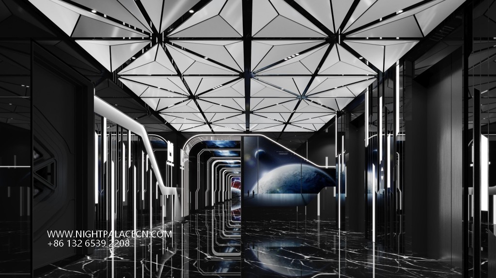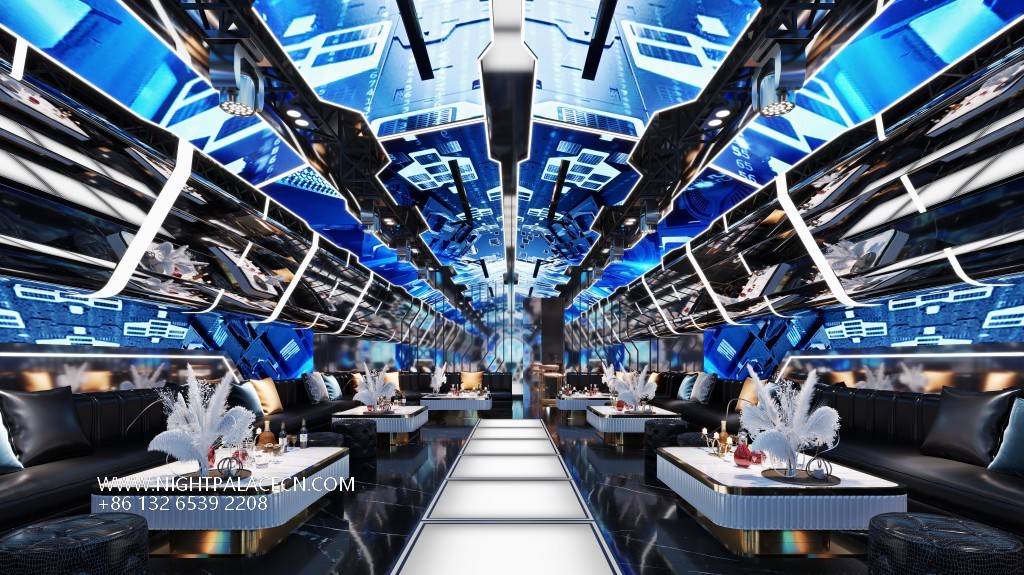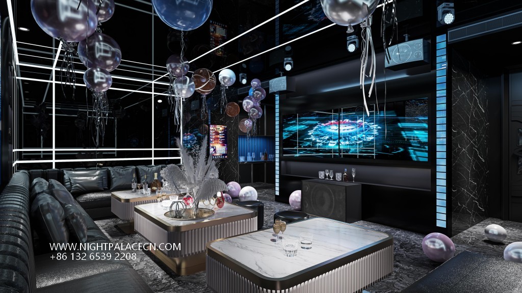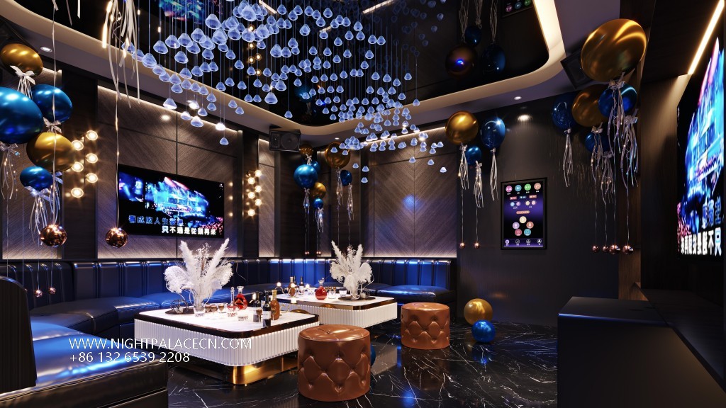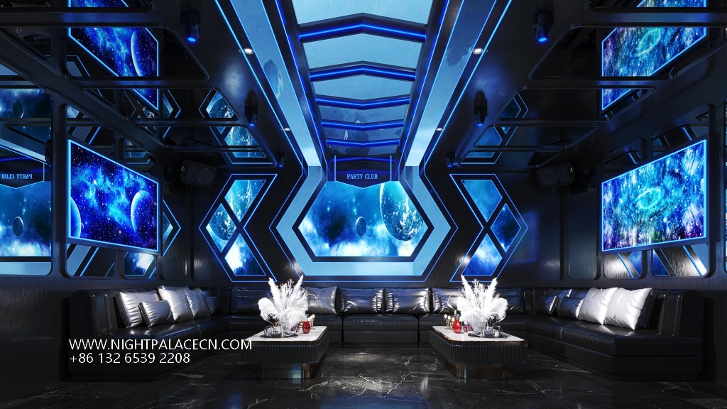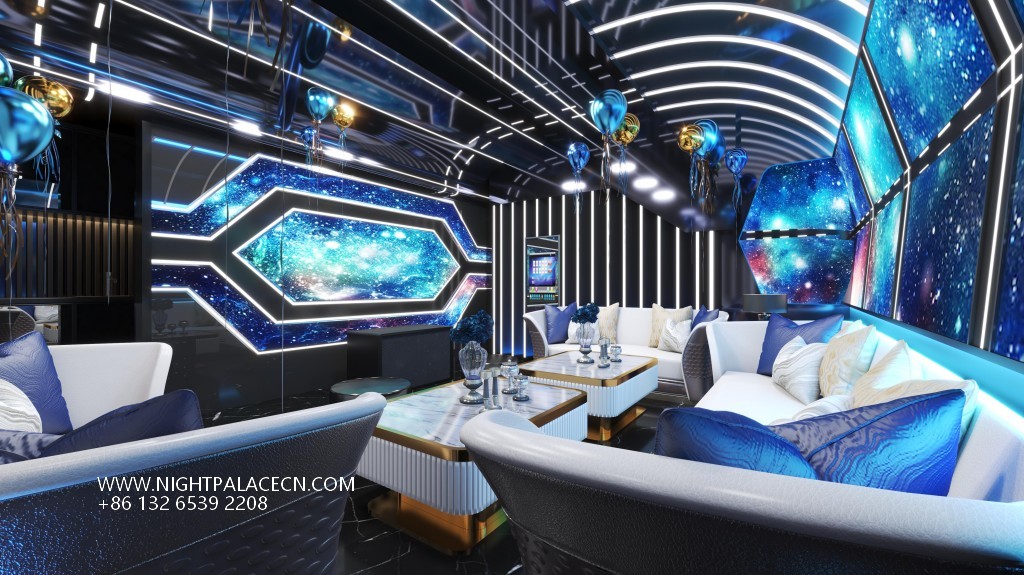 The venue is dominated by deep blue and black, and clever use of lighting technology to create immersive scenes. The corridor extended by the blue light band at the entrance is like a time-space tunnel, guiding guests into the core area. The box presents a strong sense of futurism: the hexagonal geometric wall is embedded with a dynamic starry sky giant screen, and the fantasy images such as planets and galaxies are rotated; the ceiling creates a bright starry sky effect with a staggered matrix of light bands and hanging crystal pendants, and is matched with suspended silver and blue balloons to add a dreamy atmosphere. The furniture is made of black leather sofa and marble coffee table, with blue and white throw pillows and feather ornaments, injecting light luxury and comfort into the cold technology.