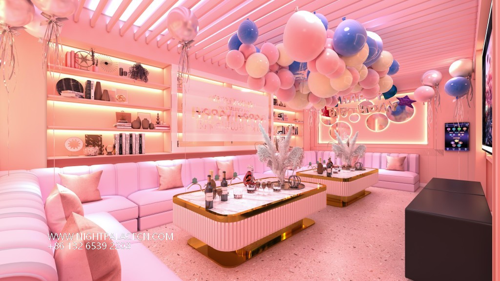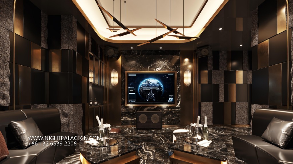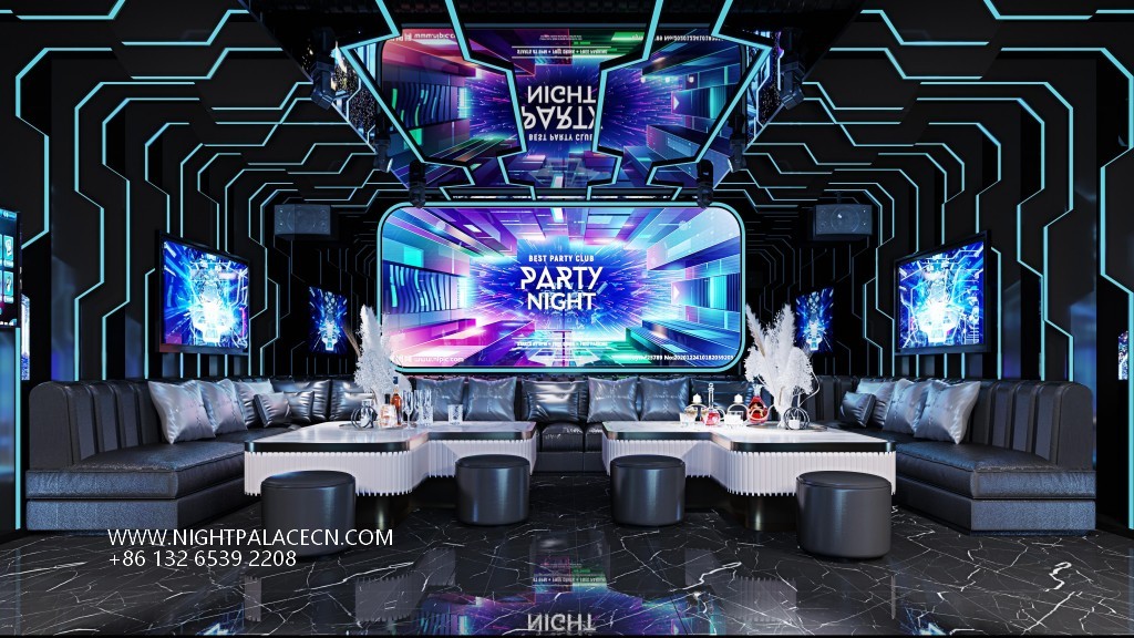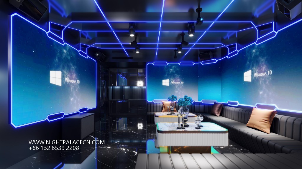 Space functions are accurately divided to meet different needs: open card seat area with symmetrical layout to promote social interaction, private box is equipped with multi-screen linkage system (such as curved main screen, auxiliary display screen), support Karaoke, audio and video, and e-sports free switching. The details show ingenuity: the neon sign "PARTY NIGHT" on the wall, the interactive interface of the song-ordering screen, and the luminous bar displaying wine sets all reinforce the theme of the party. Top-of-the-line audio equipment ensures that the sound field is surrounded by shock, and the clever integration of the Windows system screen expands the diversity of entertainment content.