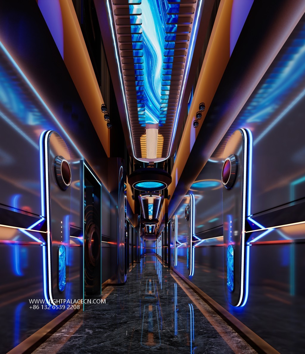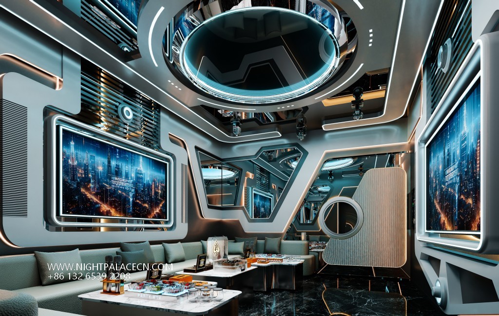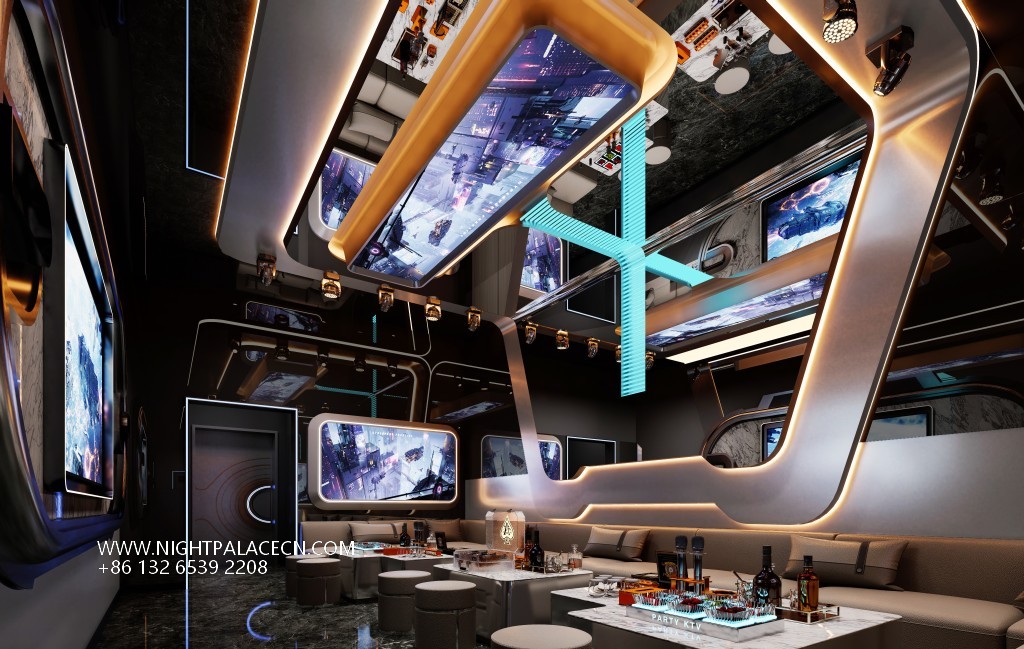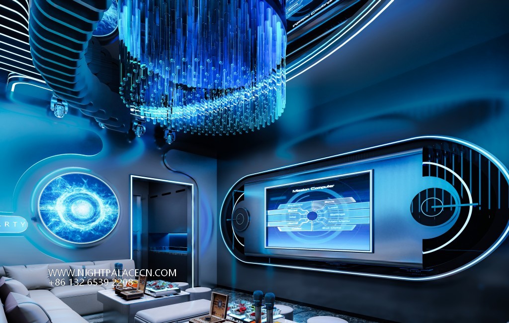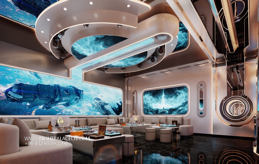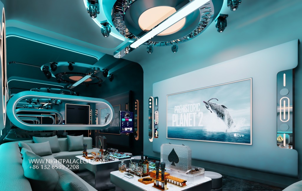 From the moment you step into the venue, the guests step into a visual feast. The entrance corridor is outlined with blue streamer light strips to outline the depth of time and space tunnels, and the two side box doors are inlaid with circular portholes to enhance the theme of interstellar navigation. The interior of the box is more ingenious: some are set against the background of the cosmic starry sky, and the blue swirl chandelier is contrasted with the nebula pattern on the wall; some are immersed in deep-sea fantasies, and the giant screen plays dynamic pictures of whales swimming and jellyfish glowing. With the wavy light strip on the ceiling, it is as if you are in a secret place under the The furniture is made of gray L-shaped sofas and marble coffee tables, embellished with neon "PARTY" light signs, feather ornaments and other fashionable elements, injecting vitality into the cold technology.