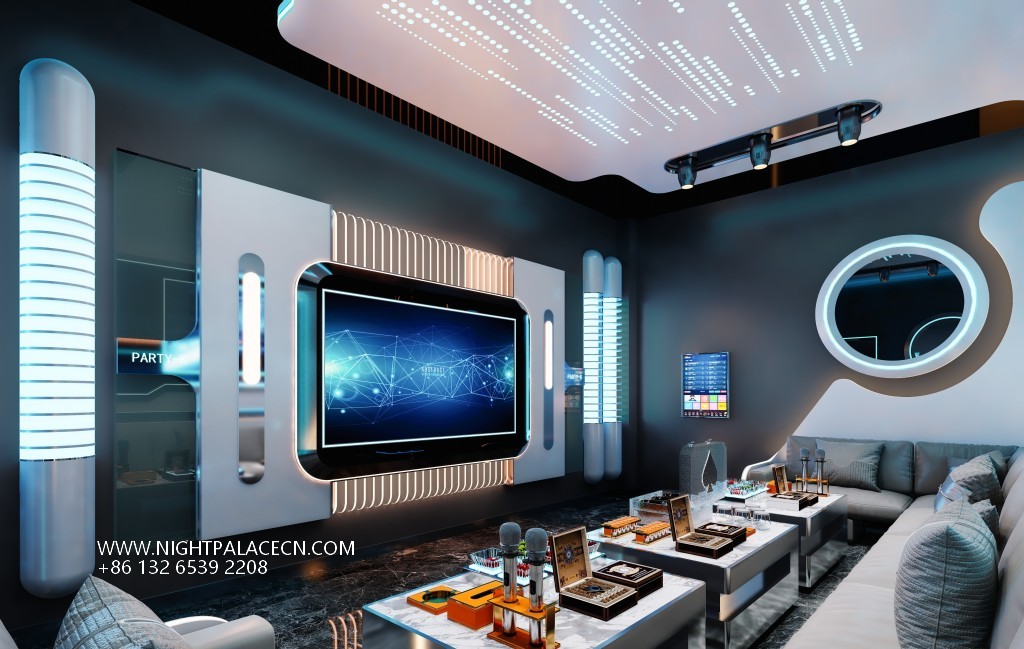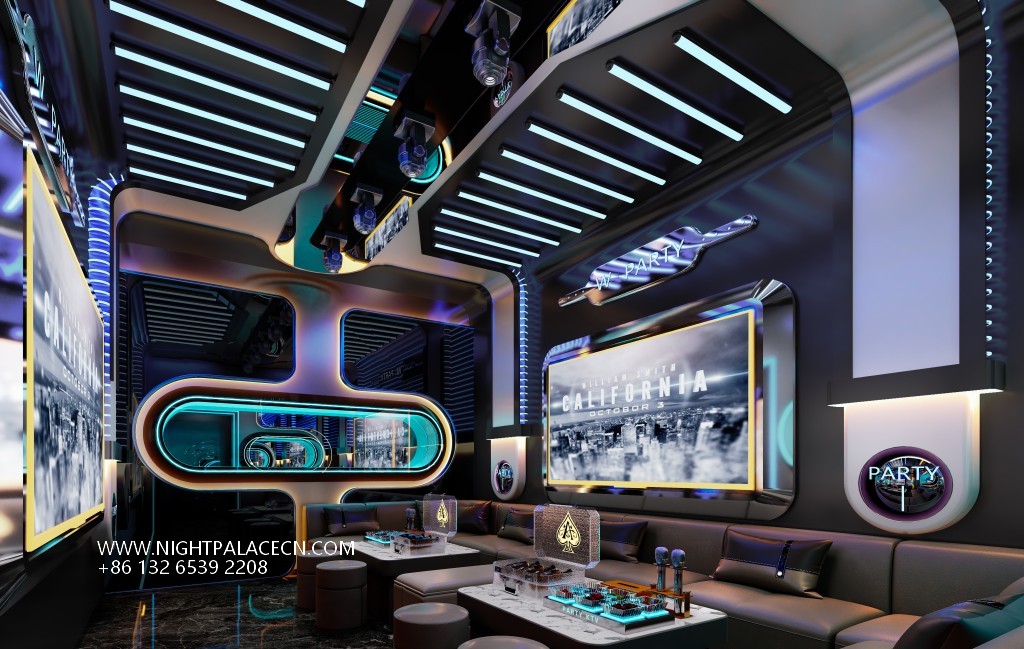 Space functions are accurately divided to meet different entertainment needs. The open card seat area promotes social interaction with a symmetrical layout, and the private box is equipped with a multi-screen linkage system (such as curved main screen, auxiliary display screen), which supports free switching of Karaoke, audio and video games. The details highlight the quality: the "WELCOME" light band at the front desk welcomes guests, the "CALIFORNIA" theme interface of the song screen, and the exquisite wine set display on the coffee table all highlight the high-end style. Top-of-the-line audio equipment ensures that the sound field is surrounded and shocking, while the ingenious integration of the Windows system screen expands the diversity of entertainment content.