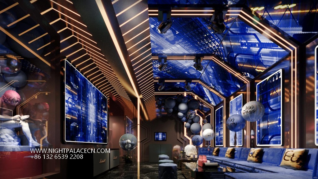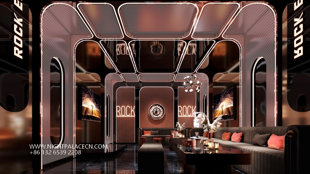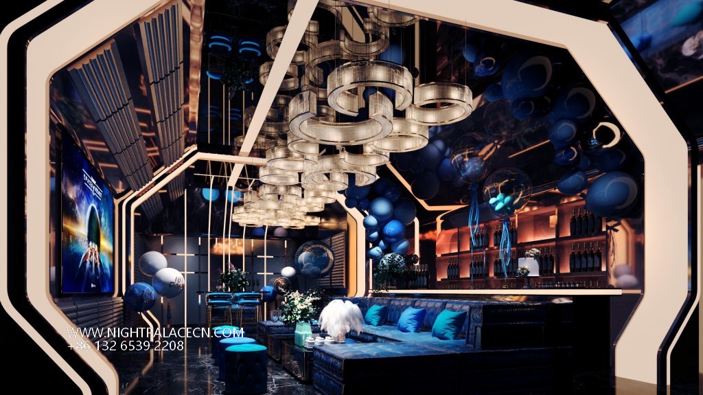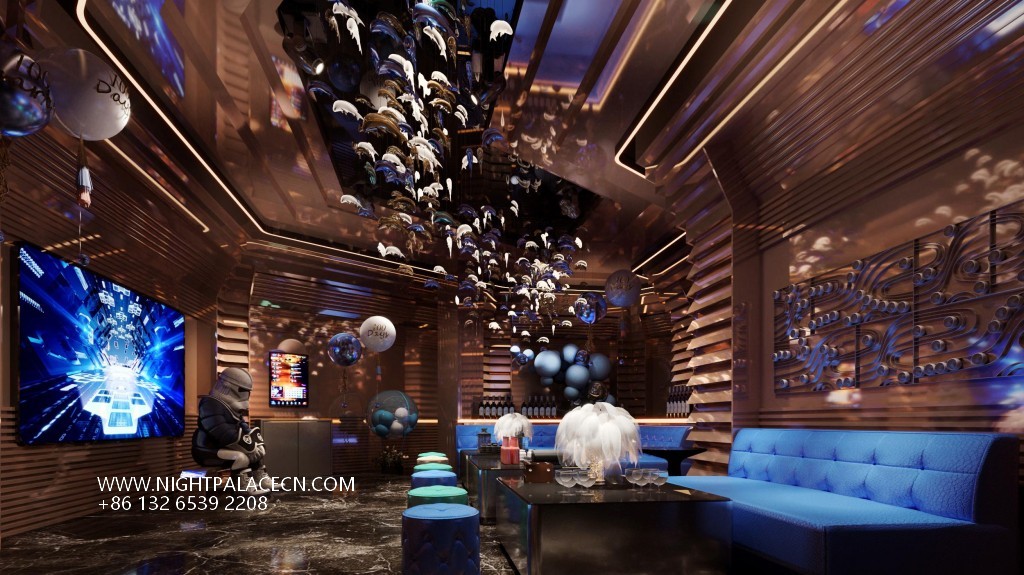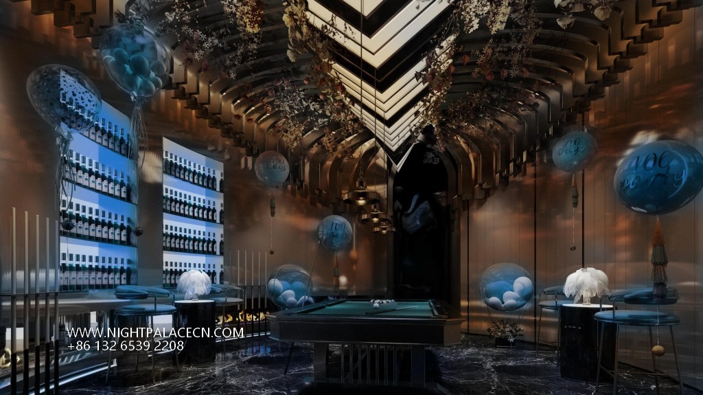 The venue uses dark blue, black and gold as the main colors, and uses lighting technology to create an immersive experience. The streamlined front desk and wavy textured columns at the entrance create a futuristic sense, and the blue light band of the corridor extends the depth of time and space tunnels. The boxes have their own unique features: the rock-themed area sets off a dynamic atmosphere with "ROCK" neon signs and fireworks background walls; the starry sky-themed box creates a cosmic fantasy through ceiling geometric light strips and planet patterns; while the billiard lounge area fuses dark green billiard tables, entire wine walls and blue sofas to balance retro and fashion. The details show quality: feather chandeliers, balloon groups (marked with "100 Days" commemorative words), embossed walls and other elements, all reflect the careful carving of the scene narrative.