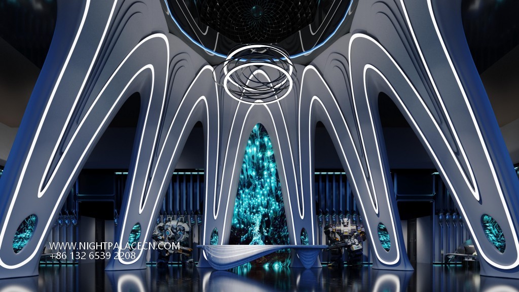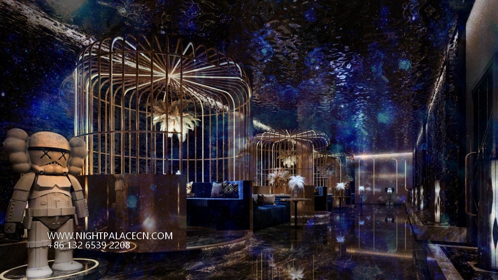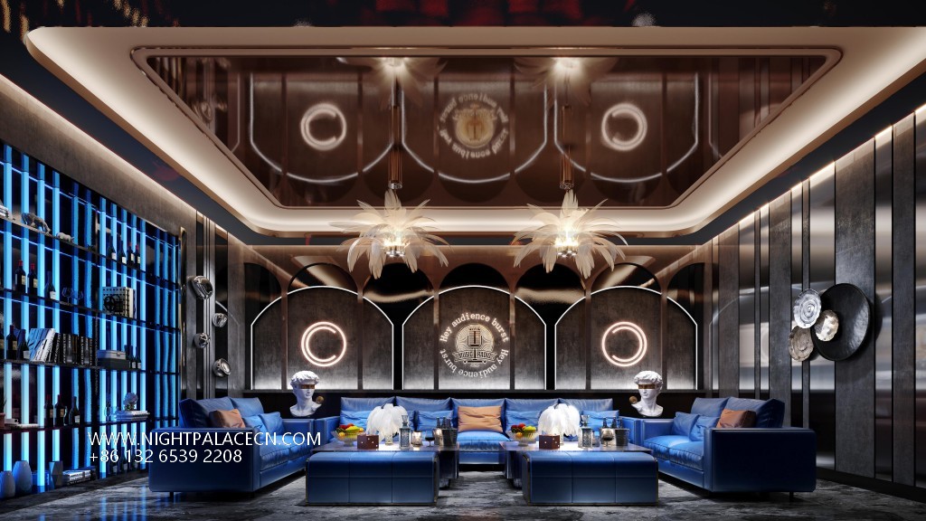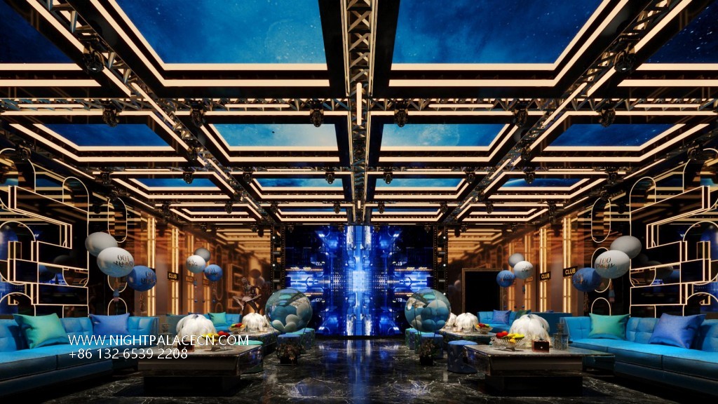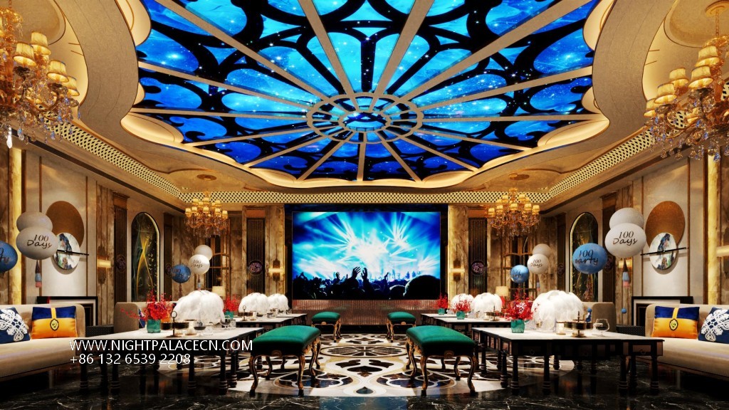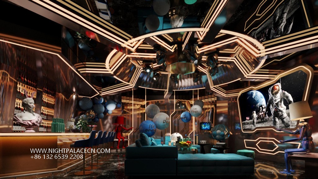 The venue uses dark blue, black and gold as the main colors, and uses lighting technology to create an immersive experience. The streamlined front desk and wavy textured columns at the entrance create a futuristic sense, and the blue light band of the corridor extends the depth of time and space tunnels. The boxes have their own unique features: the rock-themed area sets off a dynamic atmosphere with "ROCK" neon signs and fireworks background walls; the starry sky-themed box creates a cosmic fantasy through ceiling geometric light strips and planet patterns; while the billiard lounge area fuses dark green billiard tables, entire wine walls and blue sofas to balance retro and fashion. The details show quality: feather chandeliers, balloon groups (marked with "100 Days" commemorative words), embossed walls and other elements, all reflect the careful carving of the scene narrative.