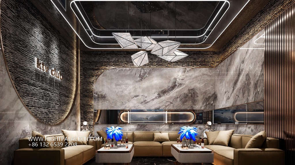 The venue is dominated by deep blue and black, creating a futuristic interstellar scene. The red light corridor and geometric lines at the entrance create a mysterious atmosphere, and the interior of the box is more visual impact: curved sofas surround marble coffee tables, and the background wall giant screen rotates dynamic pictures such as planets and nebulae, interweaving with the ceiling wave light strip and ring chandelier to form a bright galaxy. The details show ingenuity: the wall is inlaid with multiple auxiliary screens to enhance the sense of immersion, and the blue feather decoration, wine display and "LOGO KTV" logo on the coffee table inject fashion vitality into the cold technology.