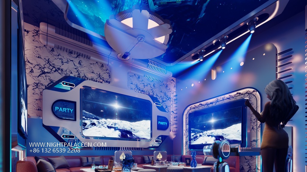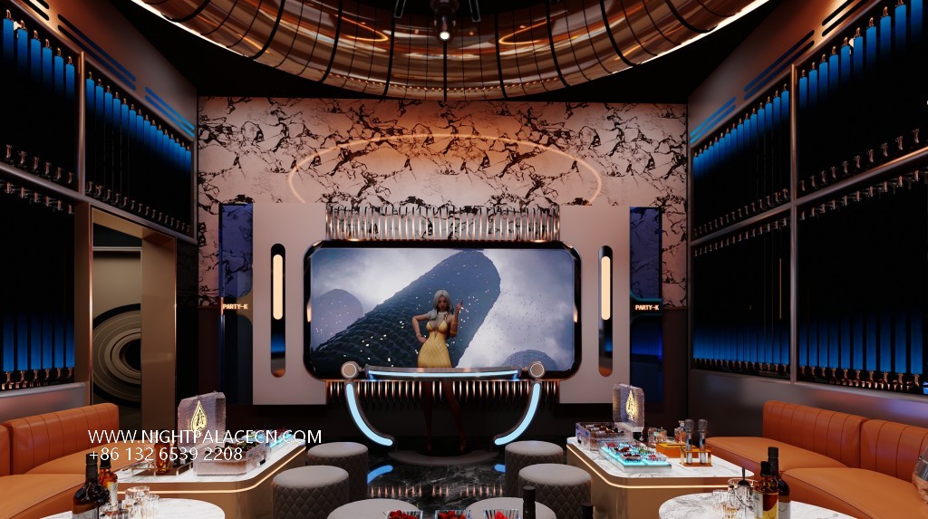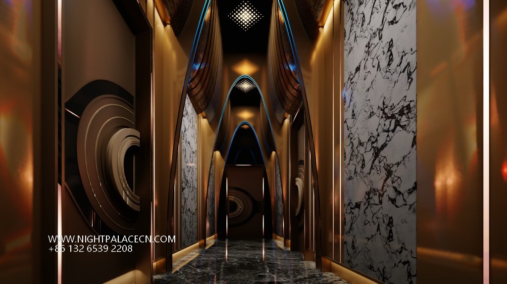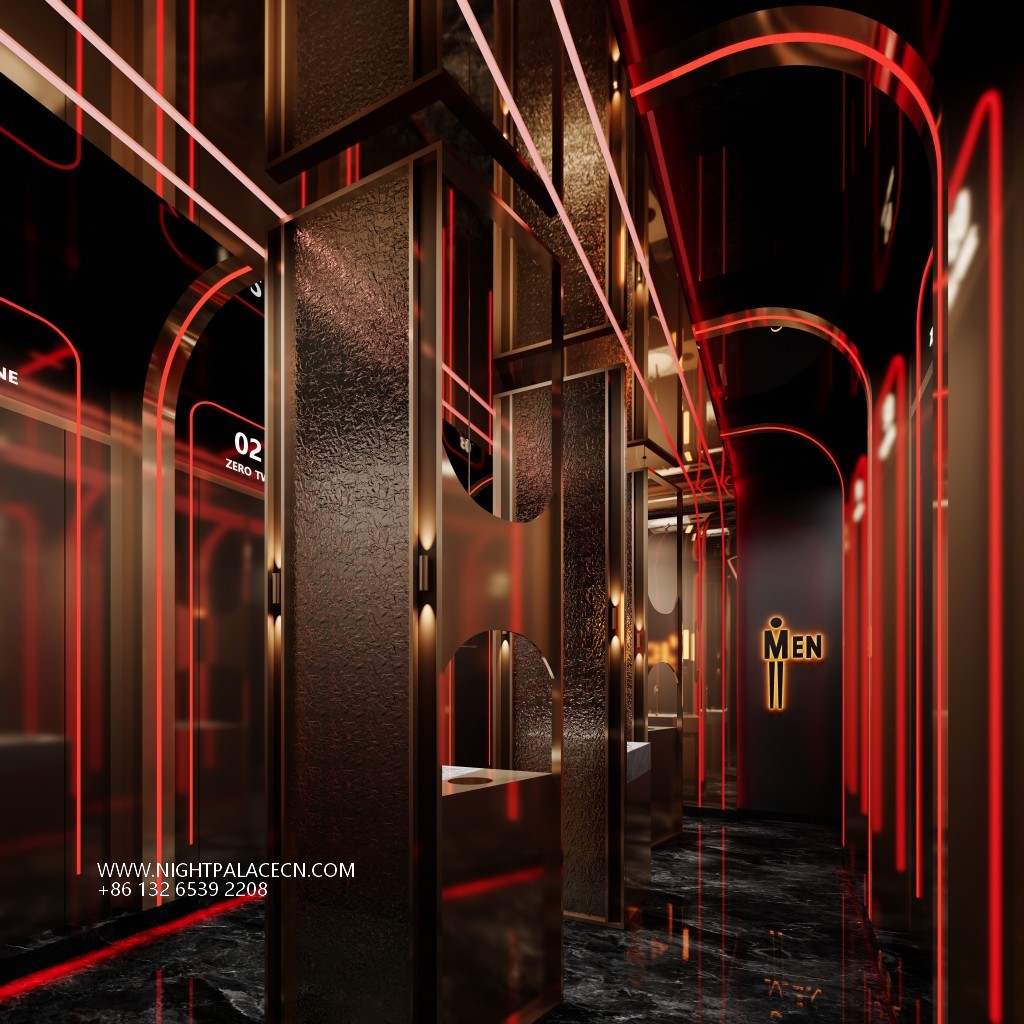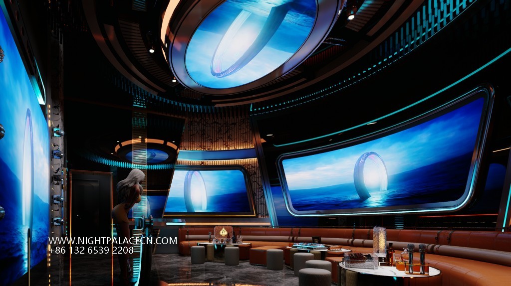 Space covers open party areas, private boxes and leisure corridors to meet different needs. The central stage area is equipped with a circular light matrix, suitable for performances and interaction; the KTV box adopts a multi-screen linkage system, which supports the free switching of audio and video entertainment; the characteristic corridor creates an Internet celebrity clock in arched ceiling, blue light band and metal decoration. Technology empowers the experience: top sound system, Windows song ordering interface and "ZERO TV" interactive screen to ensure the cutting-edge and diversity of entertainment content.
