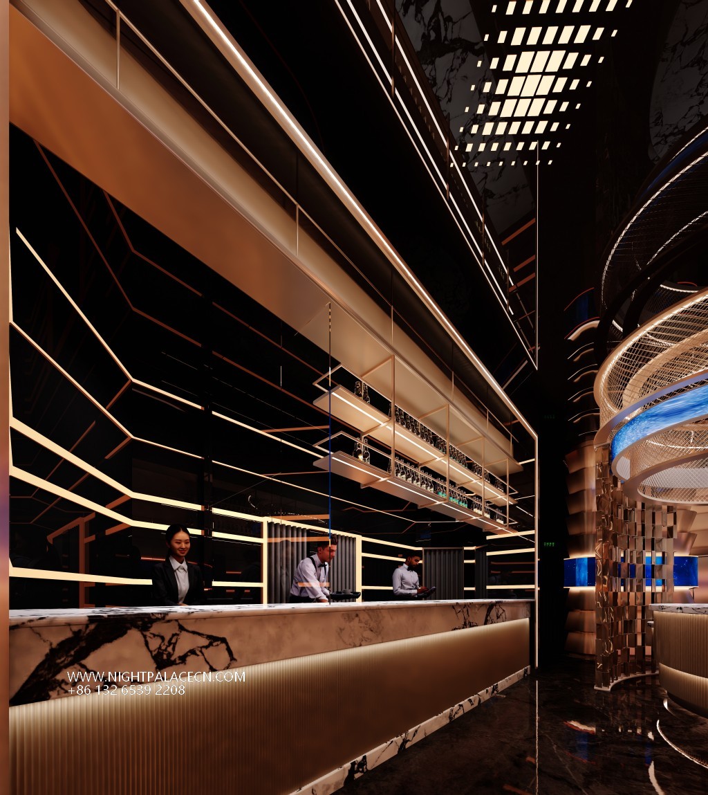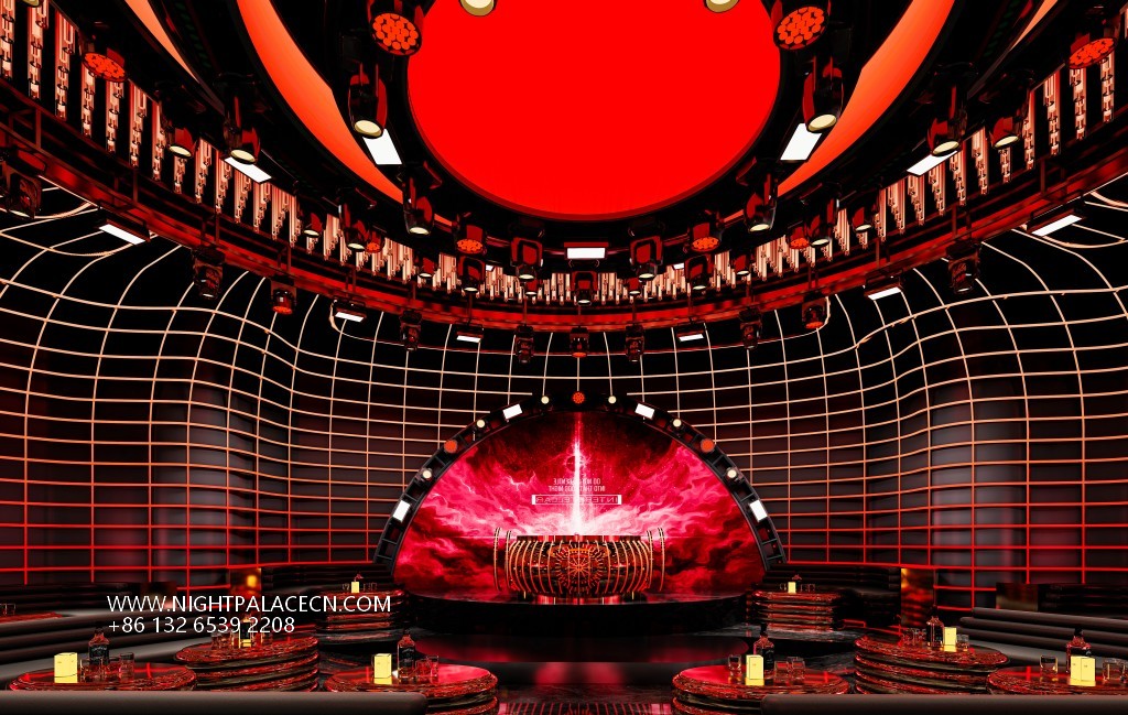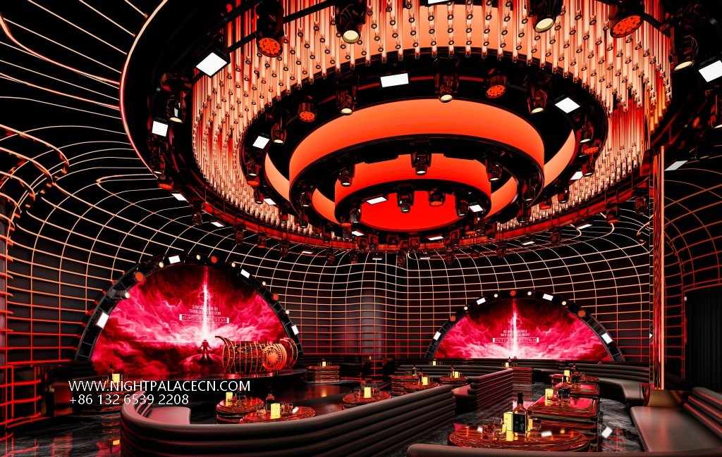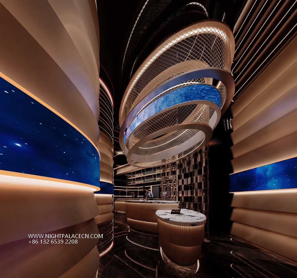 The venue uses deep blue and black and fiery red as the main colors to create a future scene full of tension. The red light belt corridor and geometric structure at the entrance create a sense of time and space travel, and the interior space is even more shocking: the curved booth area is outlined by red lights, and the background giant screen rotates the dynamic picture of interstellar navigation and flames; the box creates an immersive cosmic fantasy through circular screens, starry sky ceilings and wavy light strips. The details show ingenuity: metal dancer sculptures, marble wall textures, leather sofas and feather ornaments, blending artistic light luxury in the cold of technology.