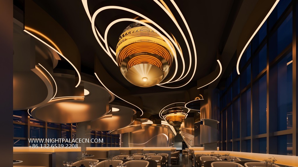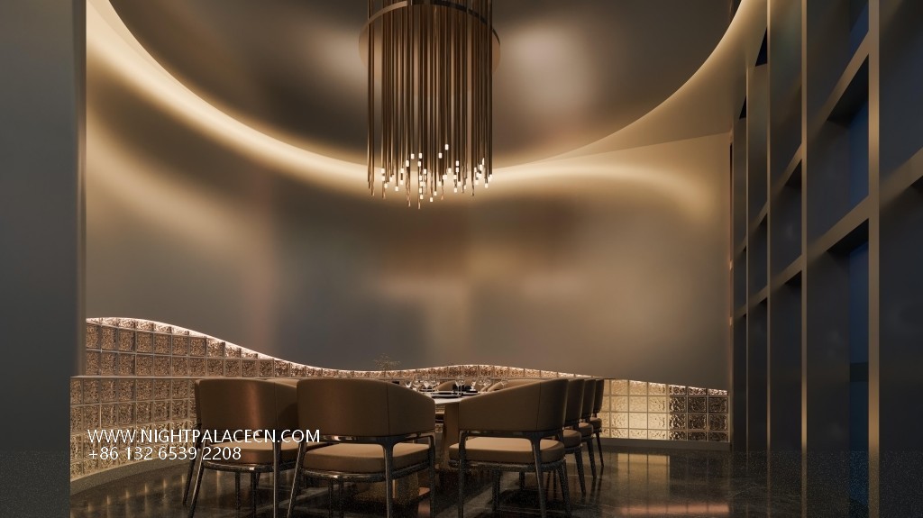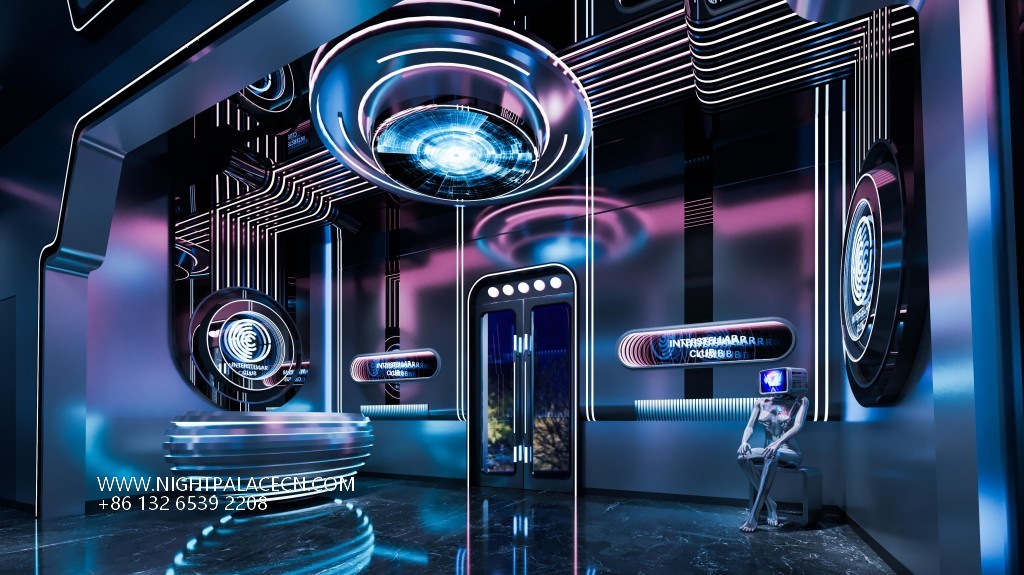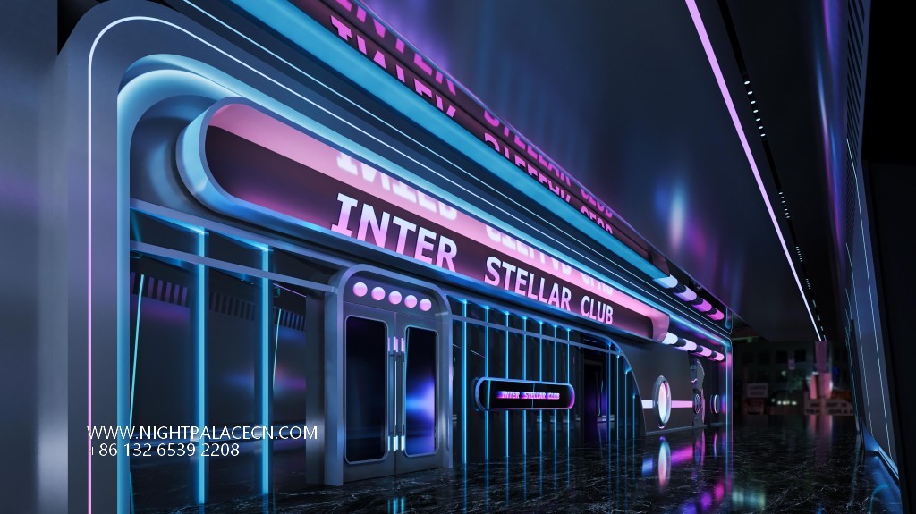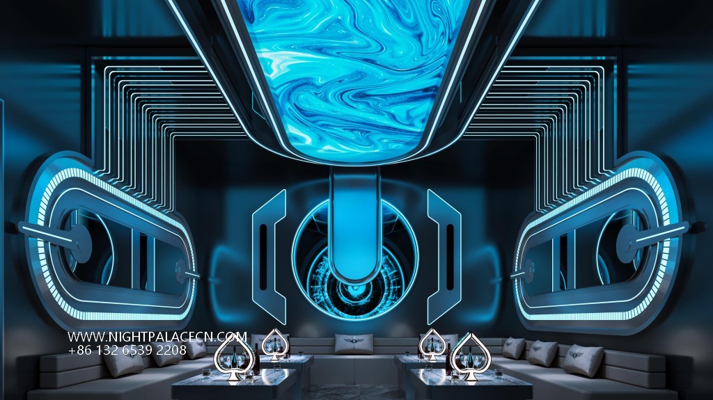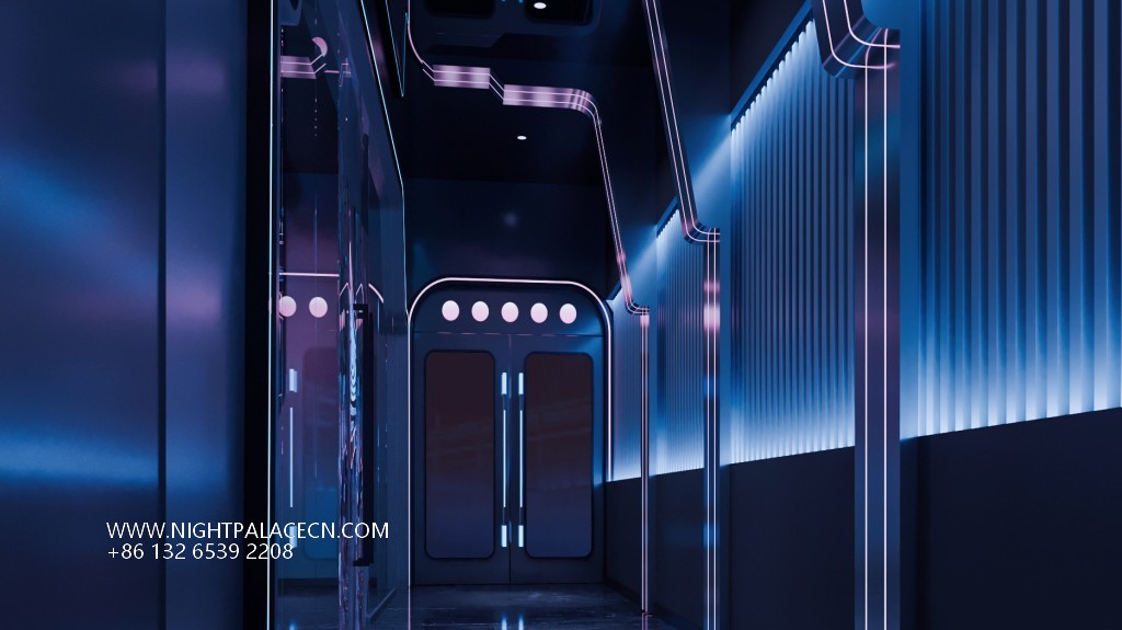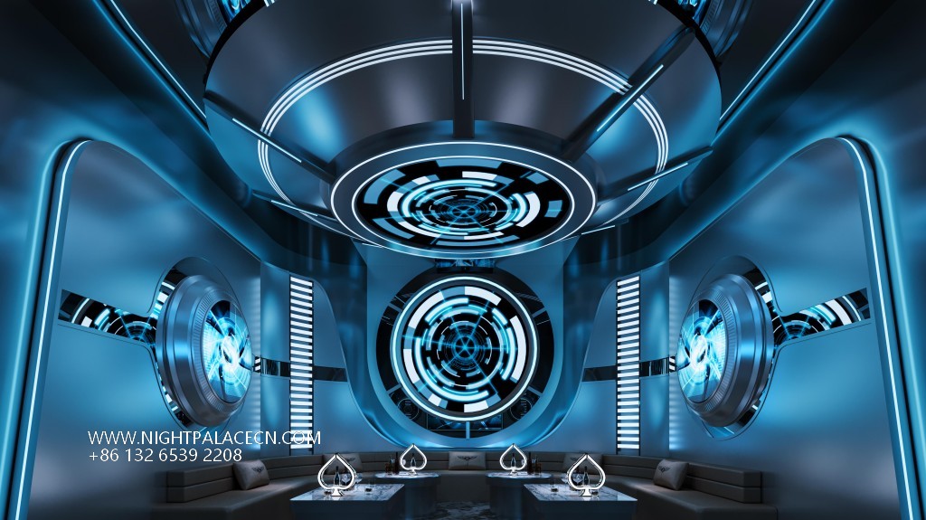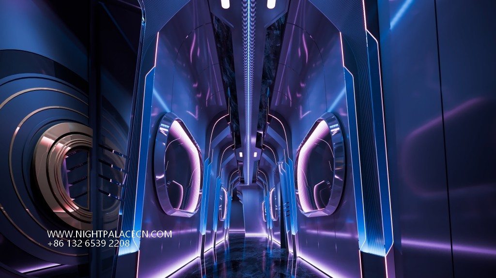 Space covers open card seats, private boxes and Internet celebrity clock in area. The central stage area is equipped with flying saucer-shaped lighting and holographic projection equipment, suitable for theme parties; the KTV box adopts a multi-screen linkage system, which supports free switching of audio and video entertainment; the channel area is built with purple light strips, mirror walls and geometric lights to build a science fiction corridor. Technology configuration ensures immersion experience: top-level sound system, Windows song ordering interface and synchronous lighting control, to achieve simultaneous shock of sound and painting.