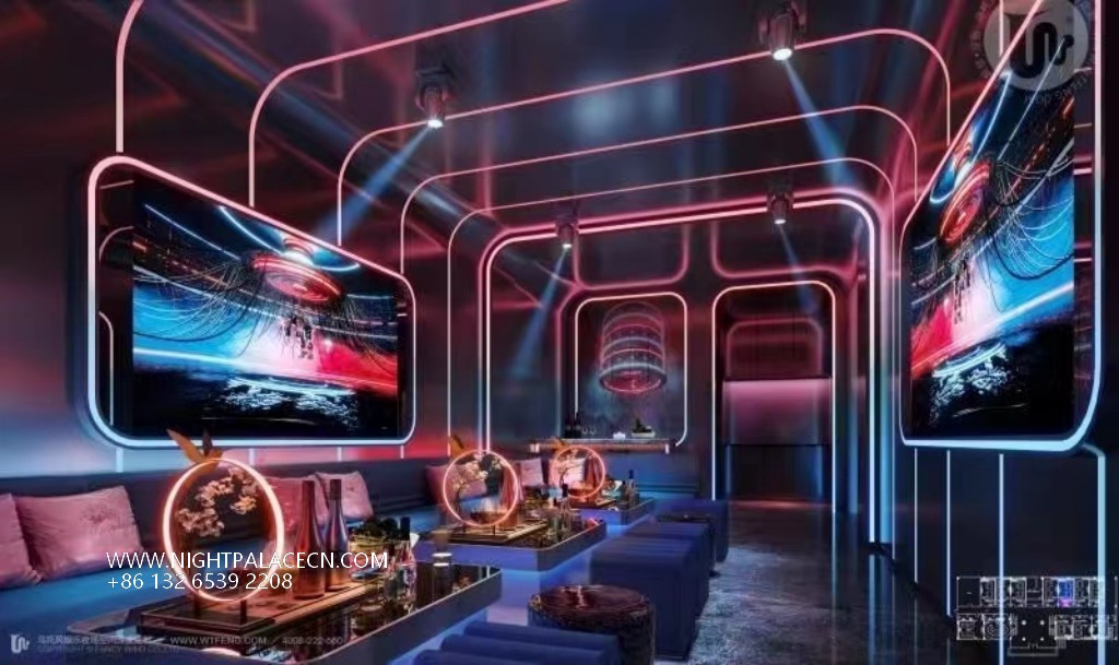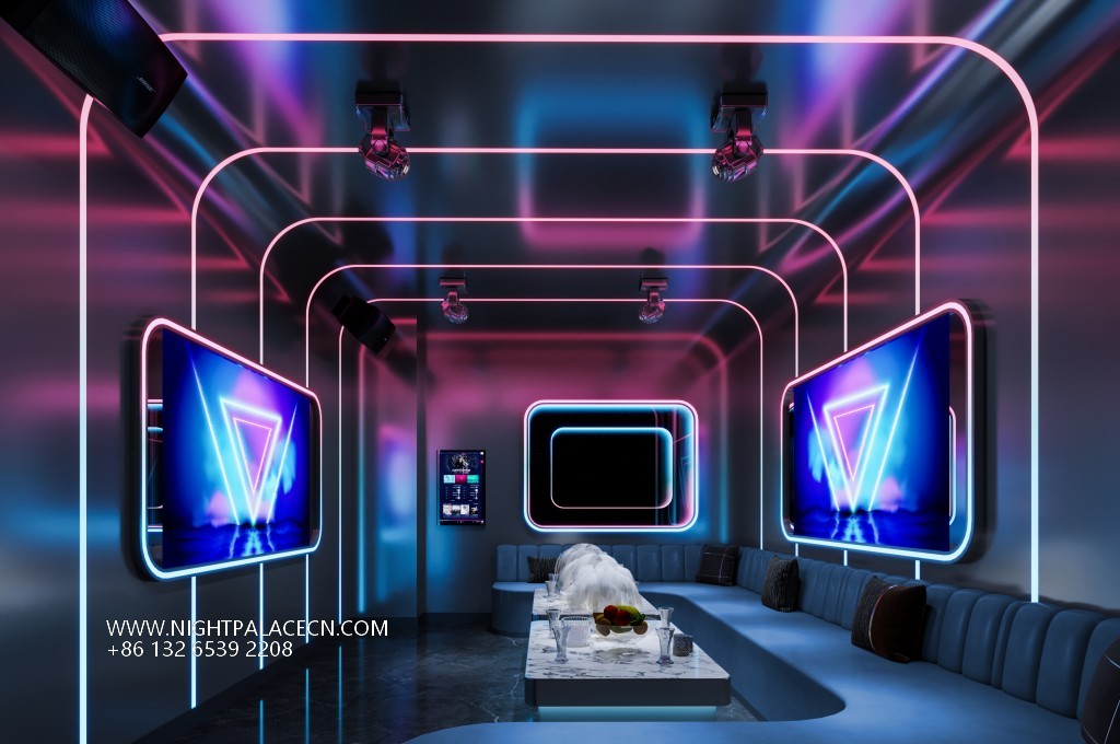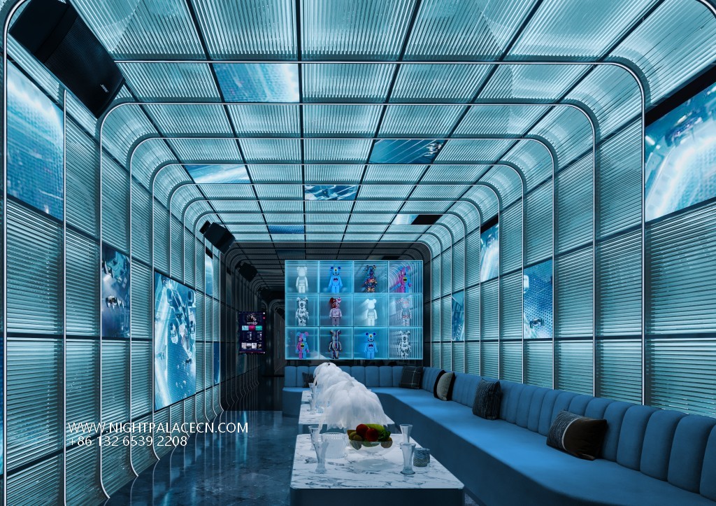 The private rooms are dominated by blue and silver to create a cold and vivid future scene. The walls are decorated with metallic stripes, which outline geometric contours with curved light lines; the ceiling design is ingenious: the transparent material is embedded with starry sky lighting effects, like a bright river on a tropical night. The furniture is made of dark leather sofas with marble coffee tables, embellished with gold letter cushions, tropical fruit plates and glass wine sets, injecting South East Asia enthusiasm into the technological atmosphere. The visual focus is multiple linkage screens: the main screen rotates dynamic pictures such as color dolls and geometric patterns, and the side screen assists to enhance the sense of immersion and show the fantasy vision of the "technological rainforest".