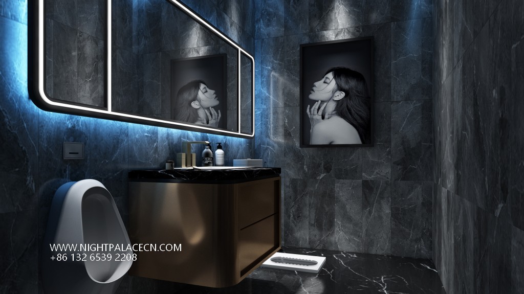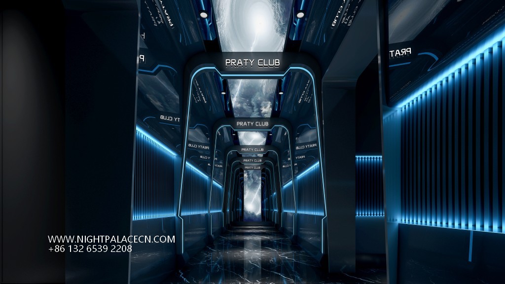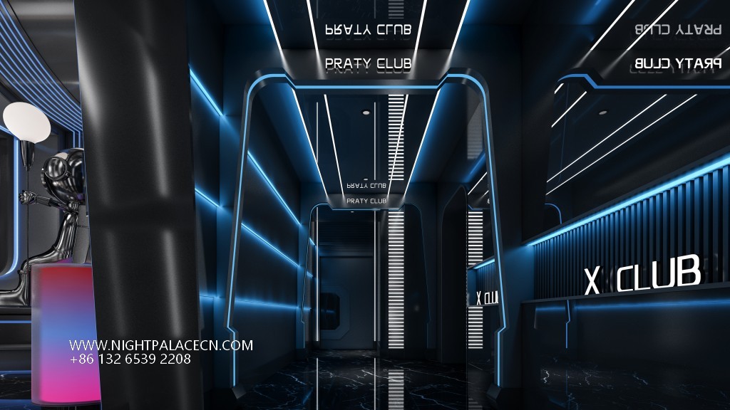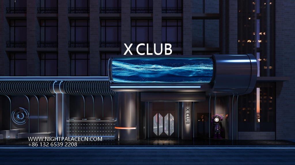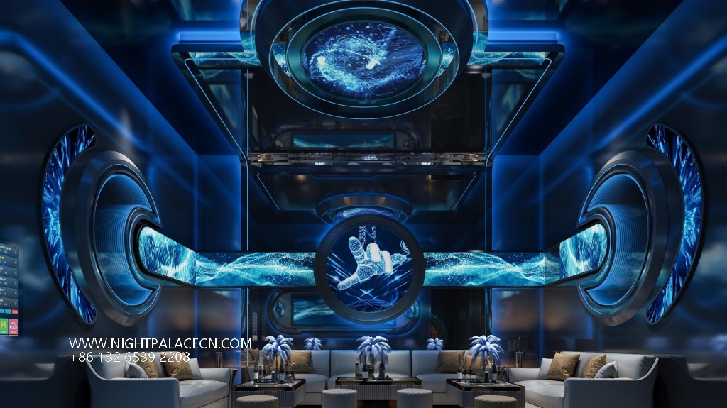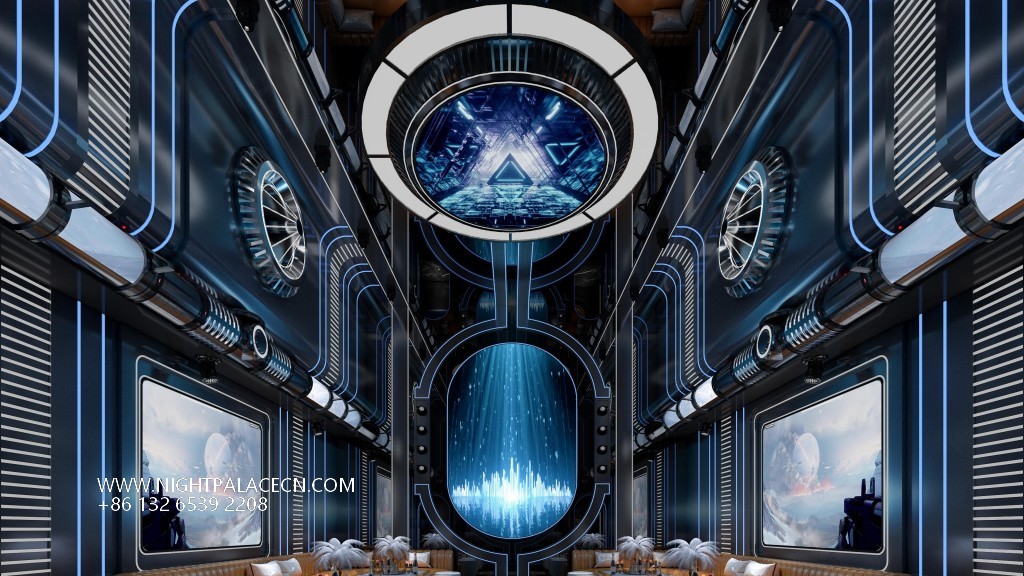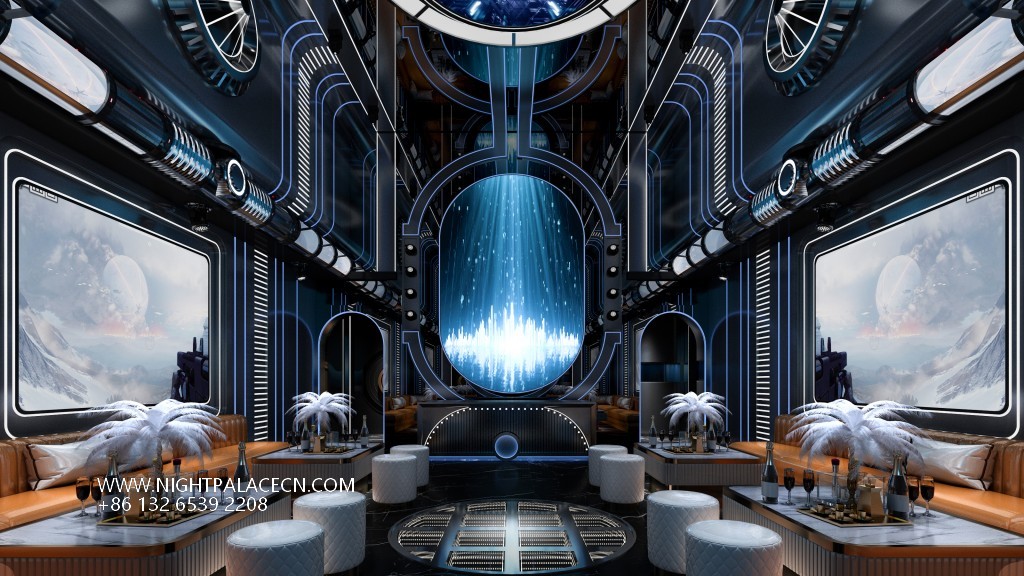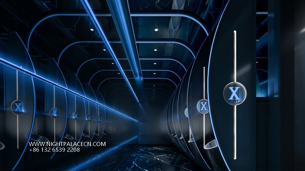 The venue is dominated by deep blue and black, creating a tense future scene. The cylindrical transparent screen at the entrance displays the flowing wave picture, setting the technical tone with the luminous logo "X-CLUB"; the internal channel extends the depth of time and space with blue light bands, and the box door with the luminous "X" logo on the wall is like an interstellar cabin. The core area is even more shocking: the circular light matrix simulates the vortex of the universe, and the curved giant screen rotates the dynamic pictures of the starry sky and mountains, interweaving with metal pipes and robot devices to form a multi-dimensional fantasy. The details show the trend gene: the mirror blue light strip of the bathroom, the art hanging paintings and the feather ornaments inject a light luxury texture into the cold technology.