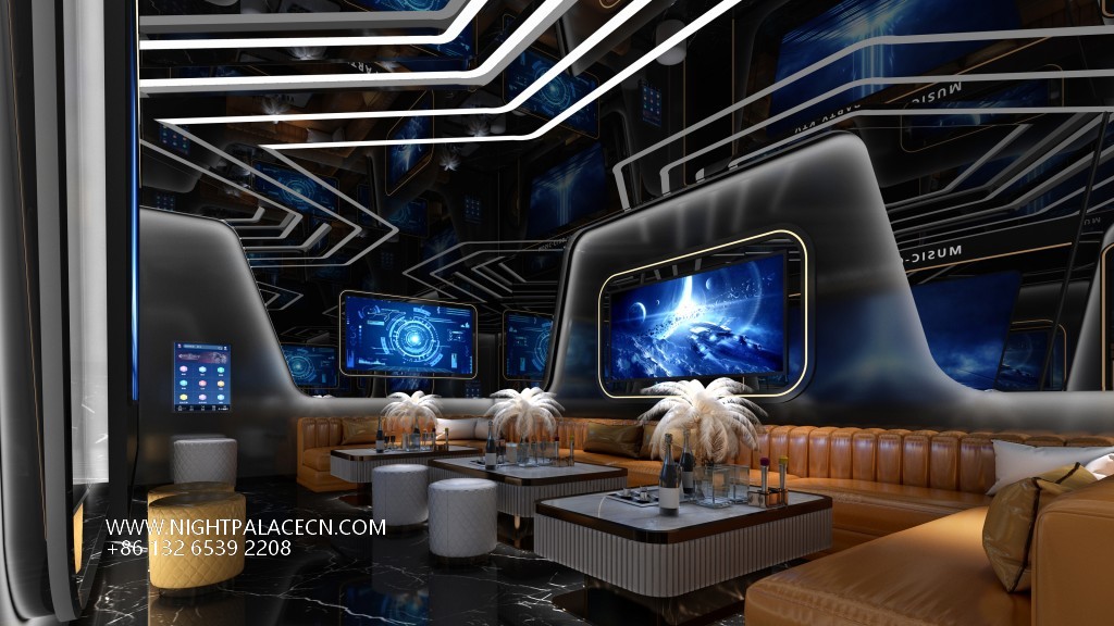The space covers the stage area, the booth, the private box and the Internet celebrity corridor. The central stage is equipped with ring lights and holographic projection to support party interaction; the multi-screen linkage system (main screen, auxiliary screen) in the box realizes free switching of Karaoke, audio and video; the brown sofa and marble coffee table in the seating area create a comfortable social atmosphere. Technology configuration ensures the ultimate experience: hidden sound system, Windows song ordering interface and synchronous programming lights to achieve simultaneous sound and painting shock.
