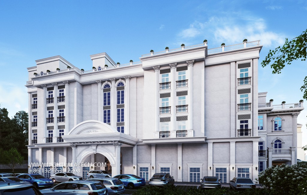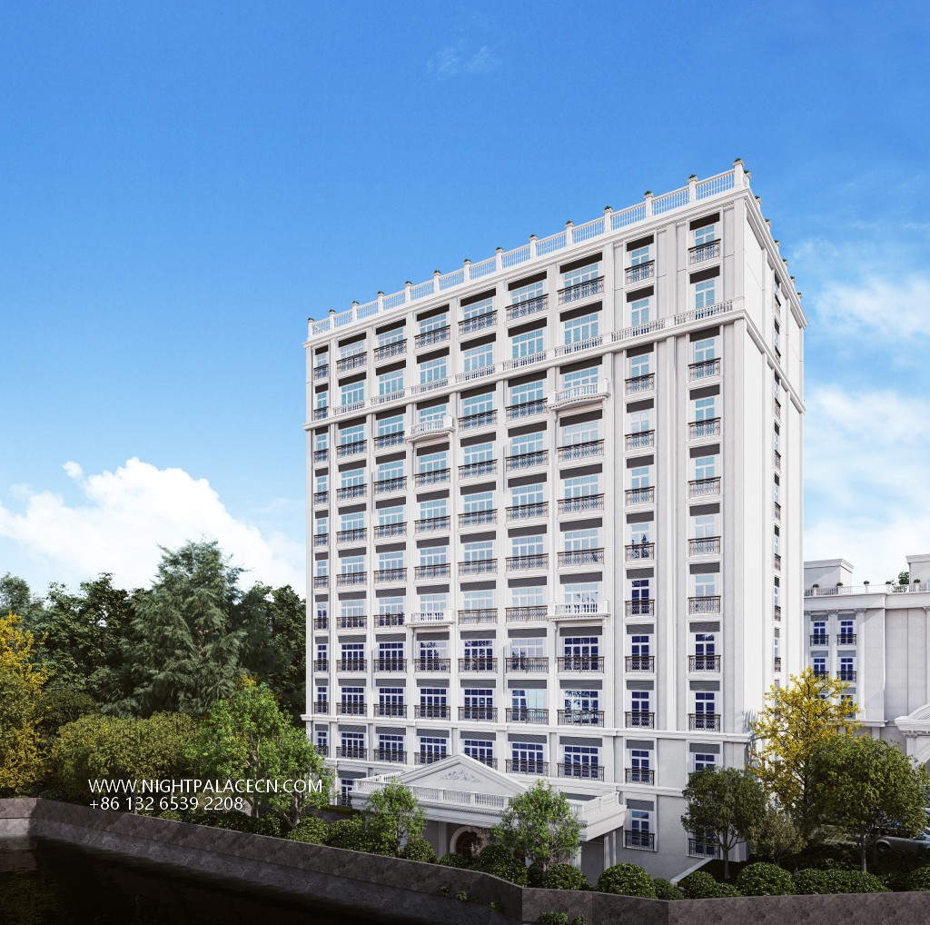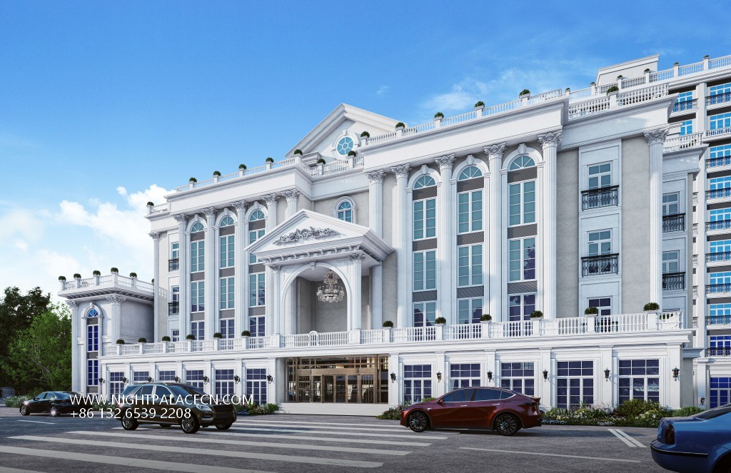 The exterior of the building is dominated by beige and light gray, highlighting the elegant temperament. The main building is seven stories high and adopts a symmetrical design. Arched doors and windows, carved columns and decorative fences show the essence of French style. Brown sloping roofs and small red spires dot the space, forming a harmonious dialogue with the surrounding green trees and waters. The details show the ingenuity: the entrance is the visual focus of crystal chandeliers, triangular mountain flowers and circular clocks, and the black wrought iron balustrades and neatly arranged blue-framed windows on the balcony are injected with agility.