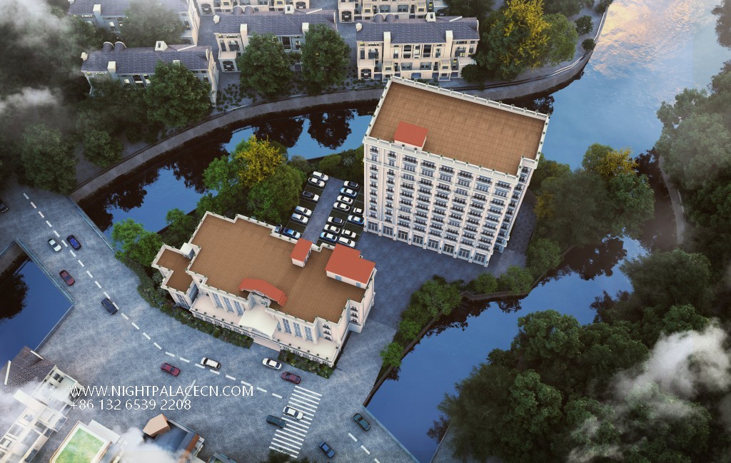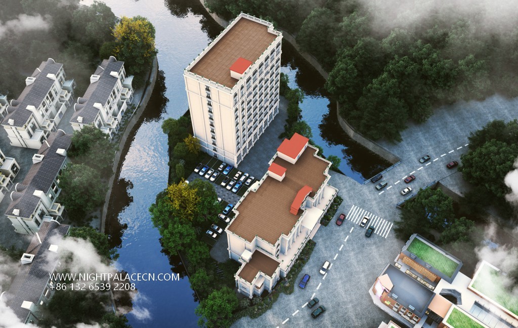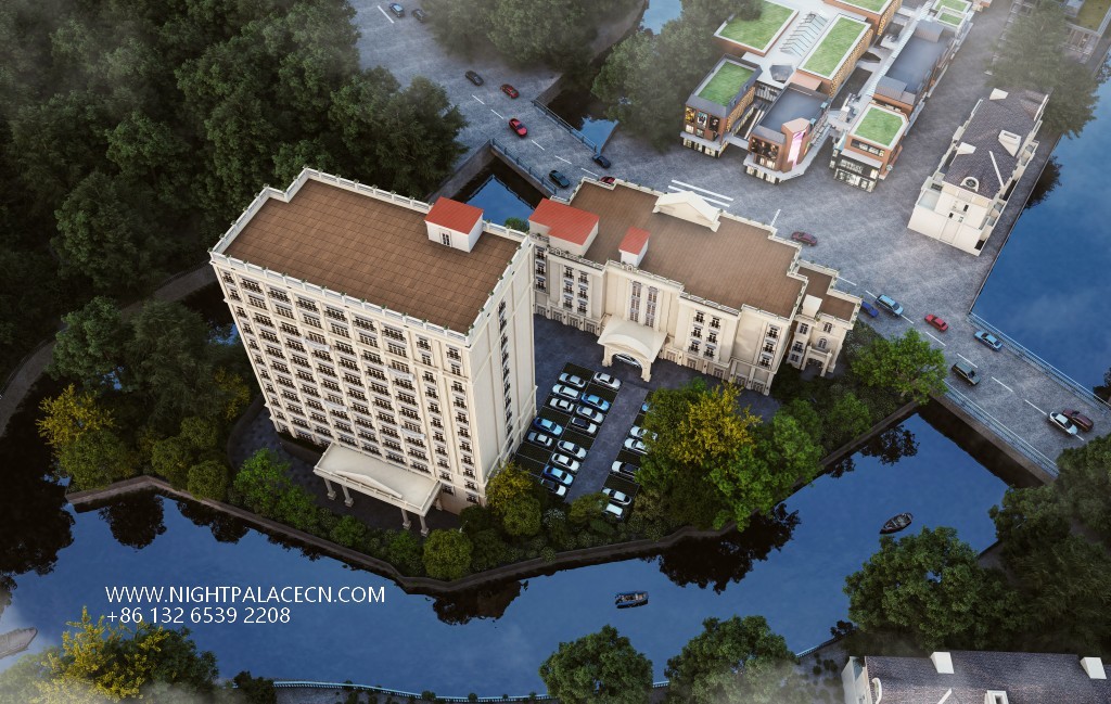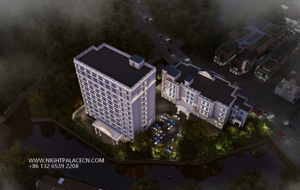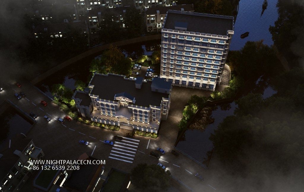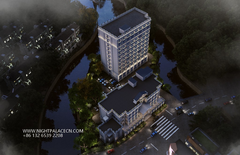 The building complex includes high-rise main buildings and podium buildings, which are well-proportioned. The upper floors meet the needs of accommodation and office, and the lower floors are equipped with arcade commercial spaces; parking lots, waterfront landscape belts and road systems realize the diversion of people and vehicles. The night lighting design is unique: the warm yellow halo outlines the building, interweaving with the starry sky and water reflections into a quiet picture.