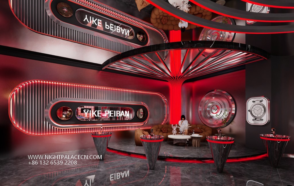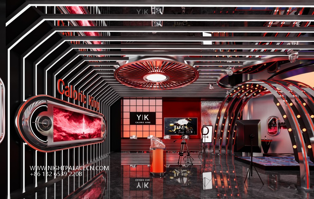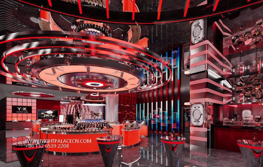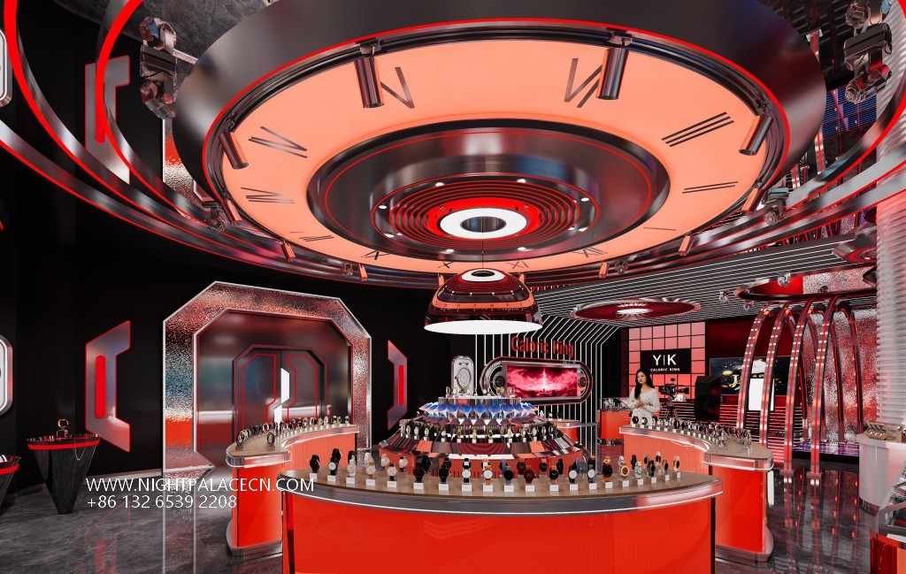 The live stream uses red and black as the main color to create a future scene full of tension. The central circular booth displays a variety of exquisite watches, and the suspended circular lighting installations (marked with Roman numerals) above, such as space-time instruments, form a visual focus with the "YIK" brand logo on the background wall. The space cleverly uses geometric language: arched light strip structure, three-dimensional square walls and specular reflections expand the depth of field, and red linear lights penetrate the space to enhance the dynamic sense of technology. The details show the quality: brown leather sofa, marble floor and display case metal texture, balancing cold technology and luxurious temperature.