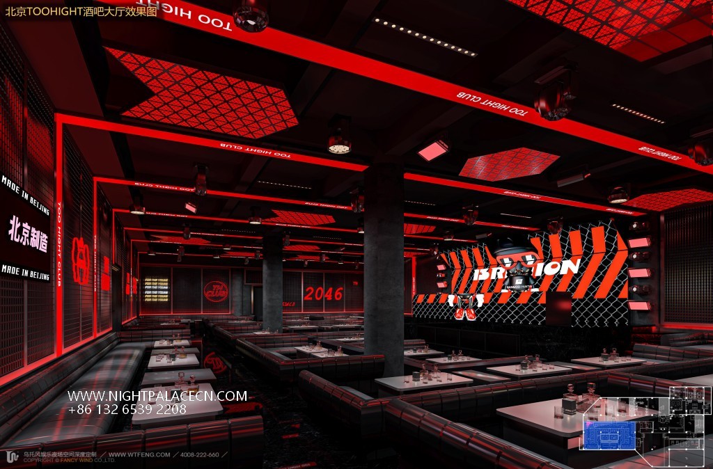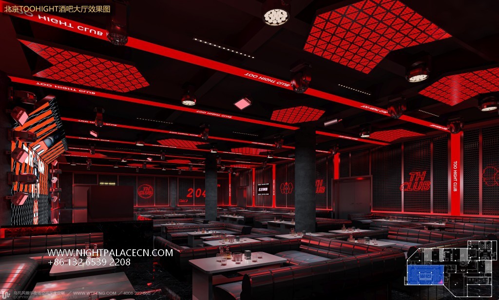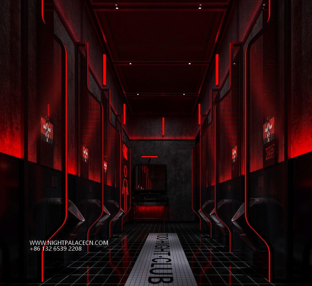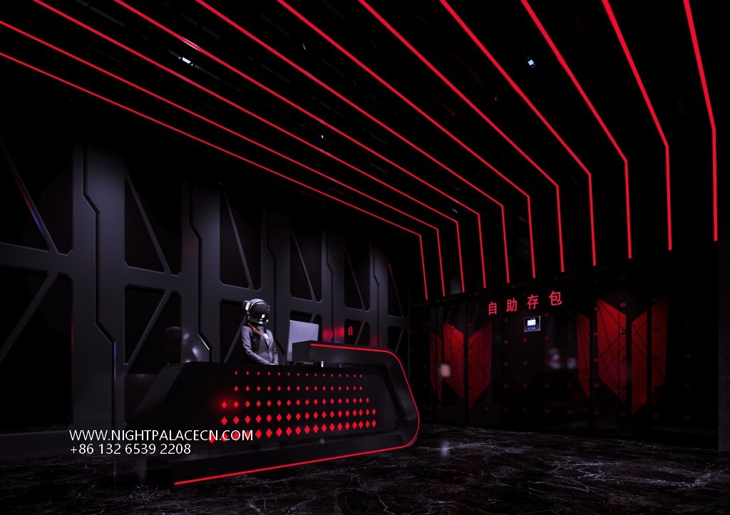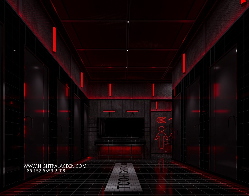 The bar creates a tension-filled atmosphere with its signature red and black color scheme. The entrance corridor is based on black checkered floor tiles, and the central white luminous landmark "TOO LIGHT CLUB" extends into the depth. The red linear light strips on both sides outline the outline of the booth, forming a strong visual guide. The ceiling of the hall presents a red grid light array and geometric ceiling, with black metal columns and grid walls to create a hardcore aesthetic of the industrial future. The details highlight the trend genes: the luminous logo of "TH CLUB" on the wall, the red slogan of the self-service deposit box, and the orange "BRITION" background wall in the stage area work together to create a virtual and real interlacing of the cyber world.