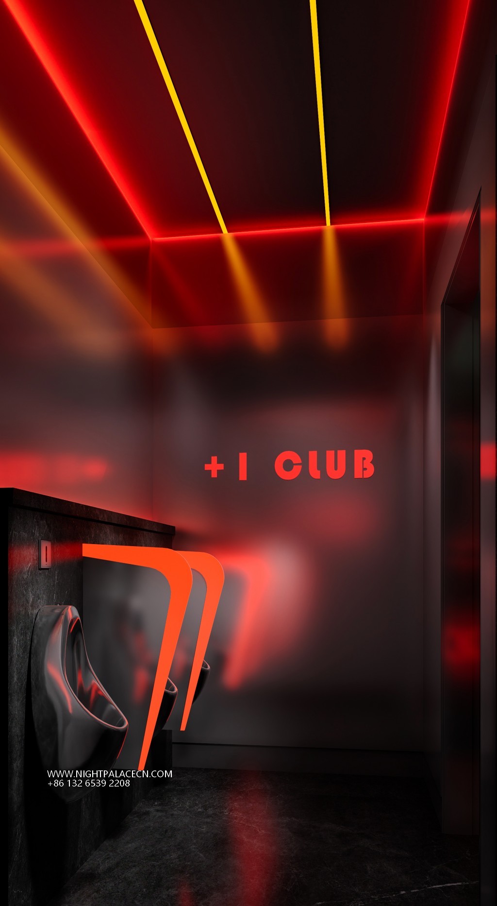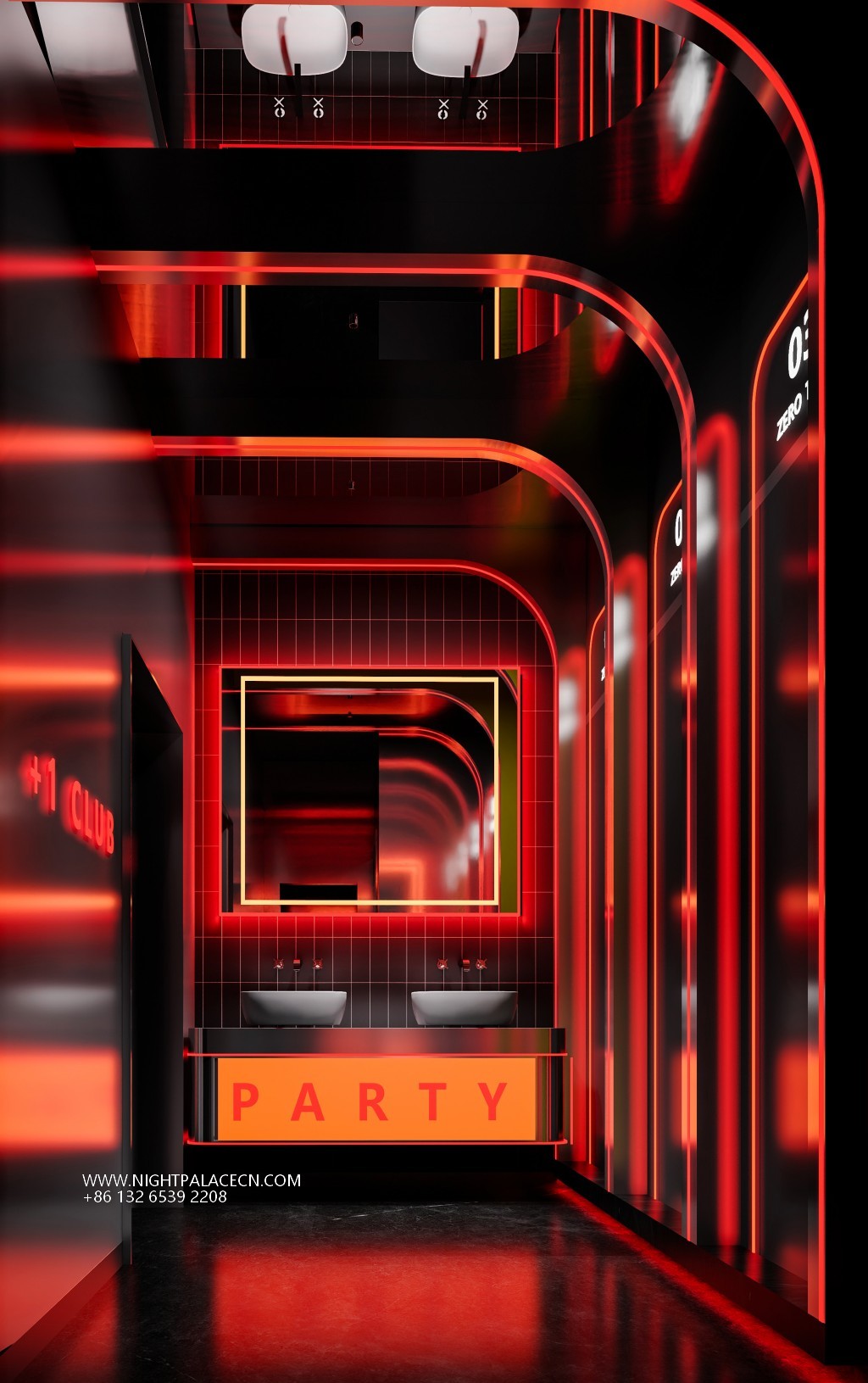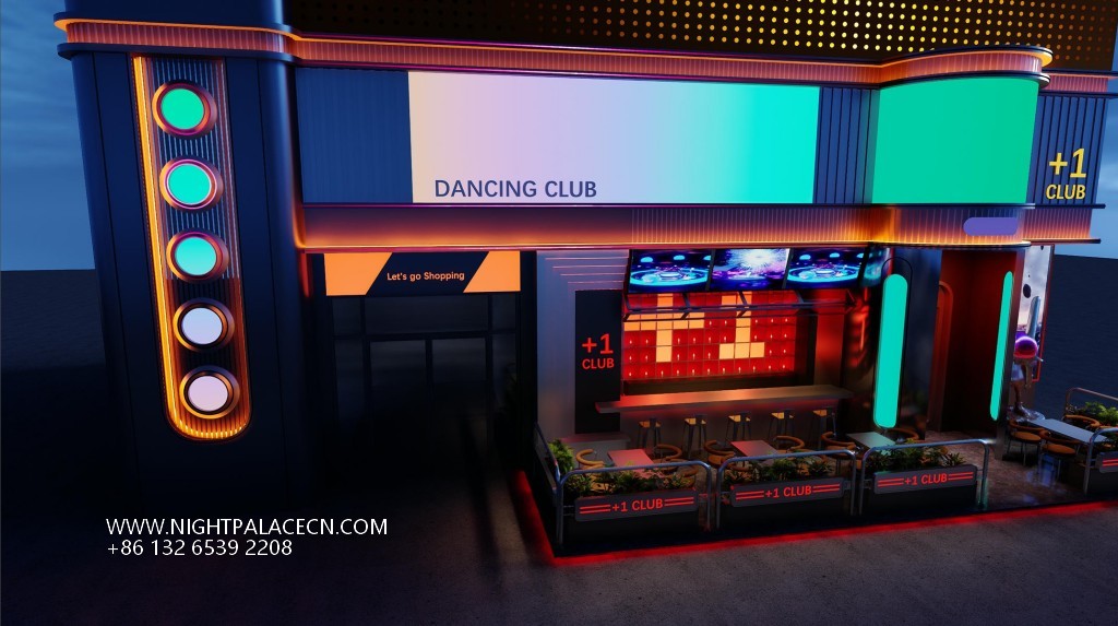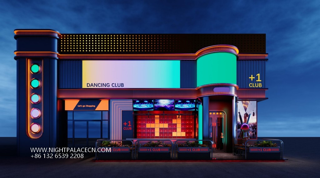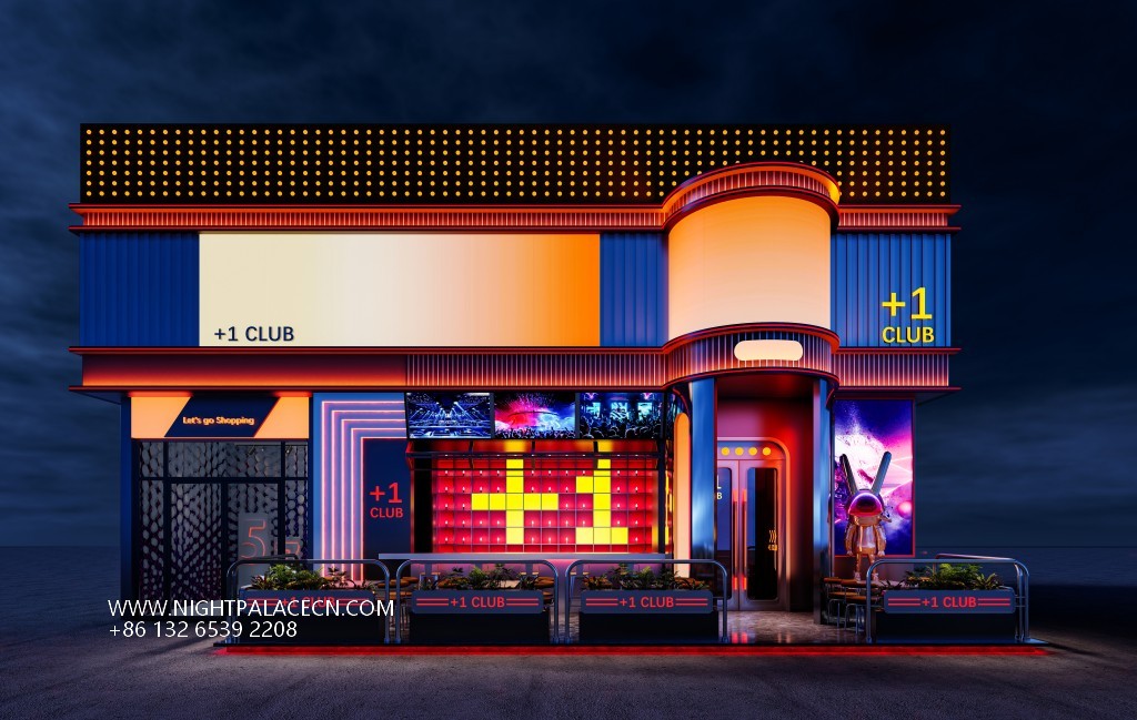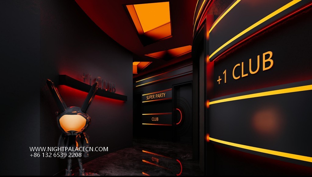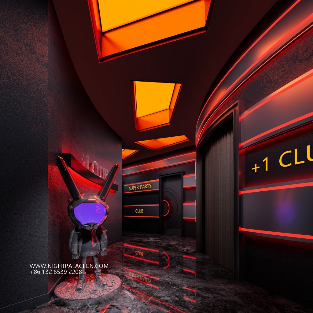 The club exterior creates a trendy impression in blue, red and yellow, and the "+ 1 CLUB" luminous logo at night forms a visual focal point with a colorful round light group. The interior space is more visually tense: the main hall is dominated by red, the ceiling square light array and the surround giant screen are interwoven into an immersive scene, and the screen rotates dynamic pictures such as astronauts and urban night scenes; the channel area is extended in depth with red neon lights, and the orange light sign of "PARTY" and the gold mirror washing table highlight the sense of details and rituals. The details highlight the trend genes: the luminous rabbit art installation, the pioneering DJ equipment at the bar, and the slogan "SUPER PARTY" on the wall, together to build a carnival narrative intertwined with virtual and real.