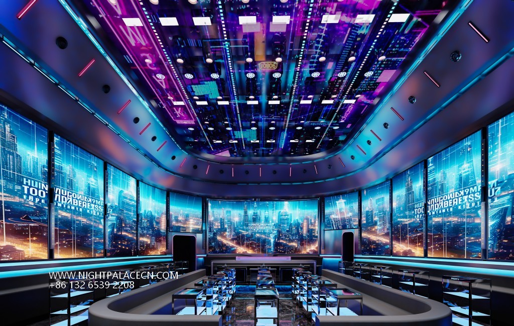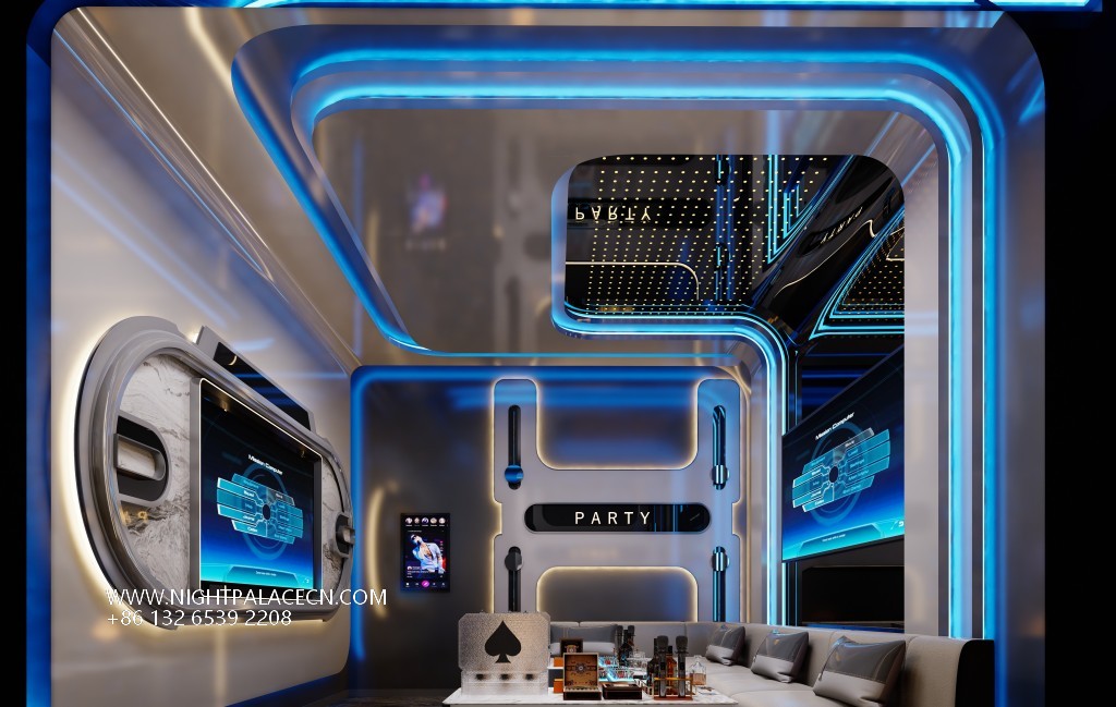 The space covers the main dance floor, booth area, technology corridor and interactive bar. The main dance floor is equipped with state-of-the-art sound and lighting systems, and the red grid frame and starry sky ceiling enhance the party atmosphere. The booth area balances comfort and style with light-colored sofas and marble coffee tables. The red backlit wine cabinet and professional equipment at the bar meet the needs of bartending performances. Technology is hidden in the details: a multi-screen linkage system, intelligent light control mode and a fun slogan "Let's go Shopping/Party", enabling a fun transition from shopping themes to party scenes.