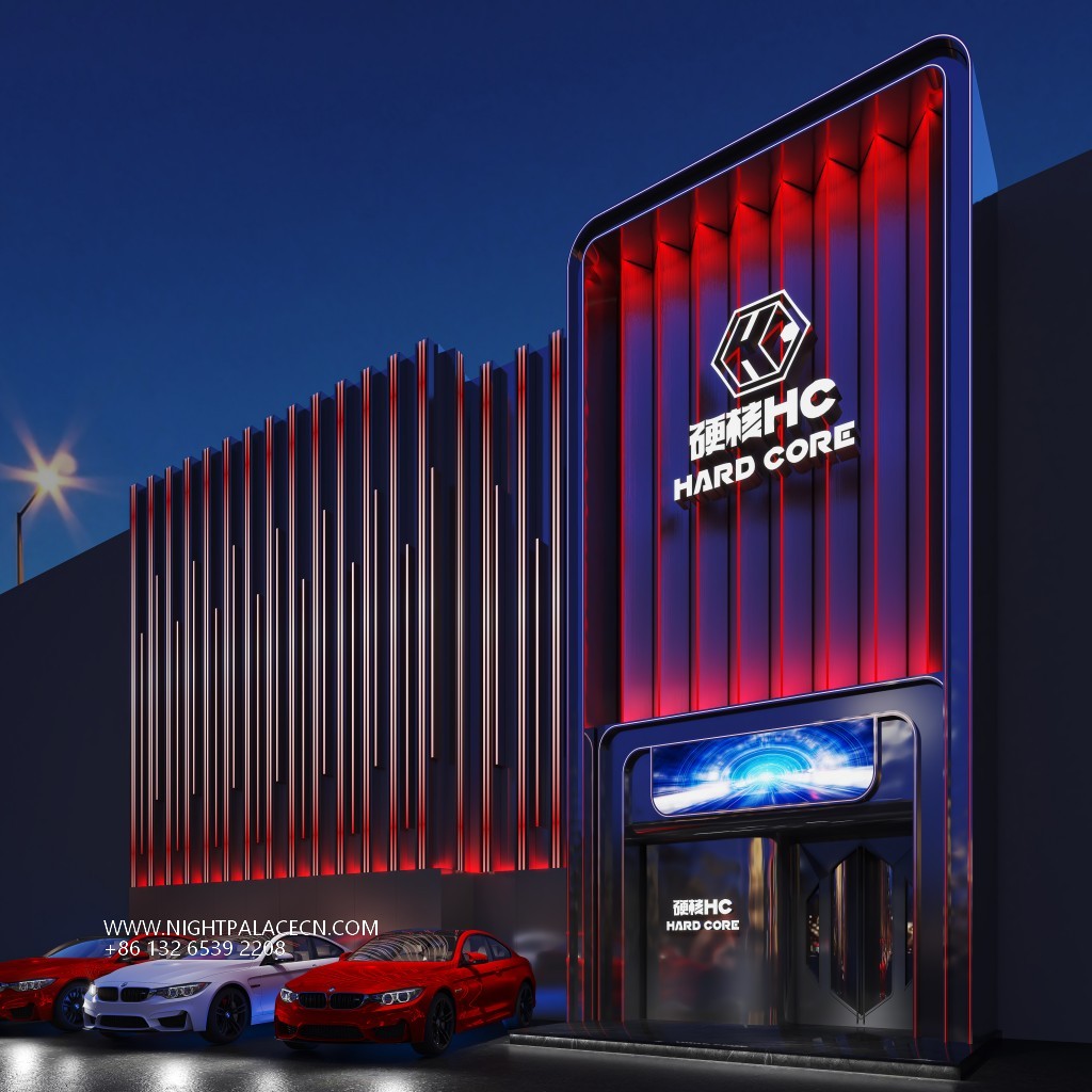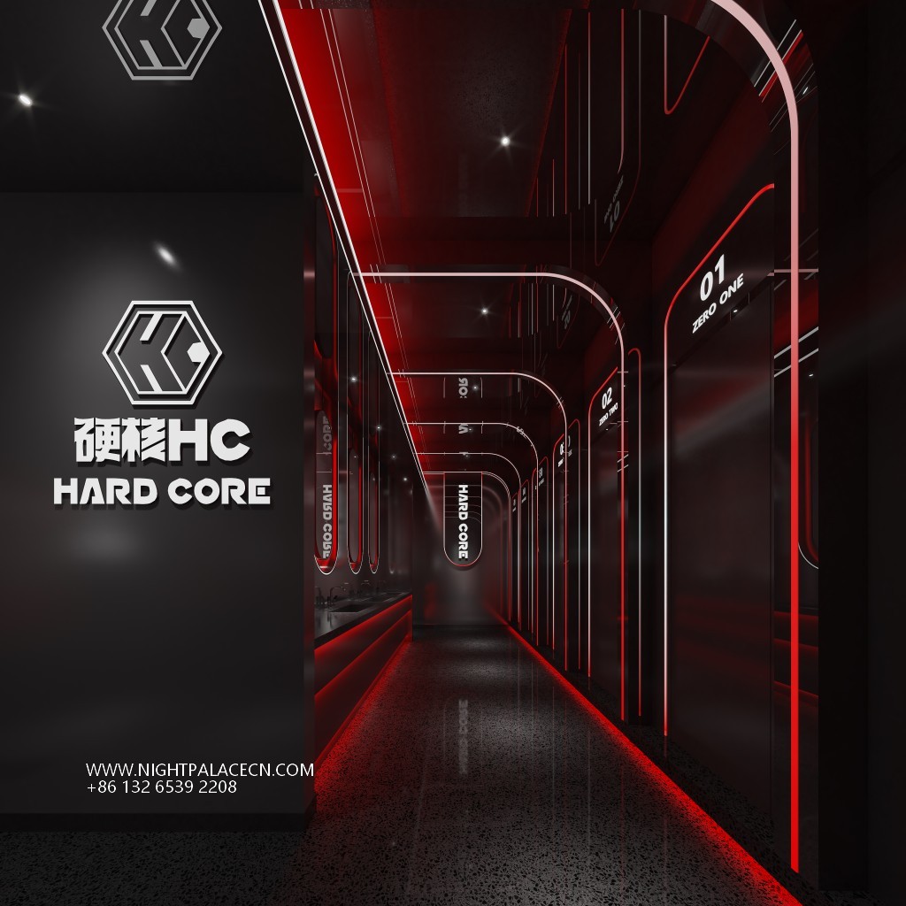 The exterior of the bar is based on a dark building. The vertical red light band and the luminous logo of "Hardcore HC" create a strong visual impact. The blue aperture at the entrance is like a time-space tunnel to attract exploration. The interior space is more layered: the main hall is dominated by black, the red booth area surrounds the central stage, the top geometric light array and the background giant screen rotate red energy ripples to create a fiery atmosphere; the channel area is outlined by red linear light strips, and the wall mechanical eye device, metal grid and numbered house plate strengthen the hard core gene. The details highlight the cyber narrative: the blue neon strips in the private room are interwoven into a geometric frame, and the red sofa and transparent flower arrangement embellish the cold space.