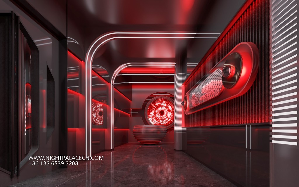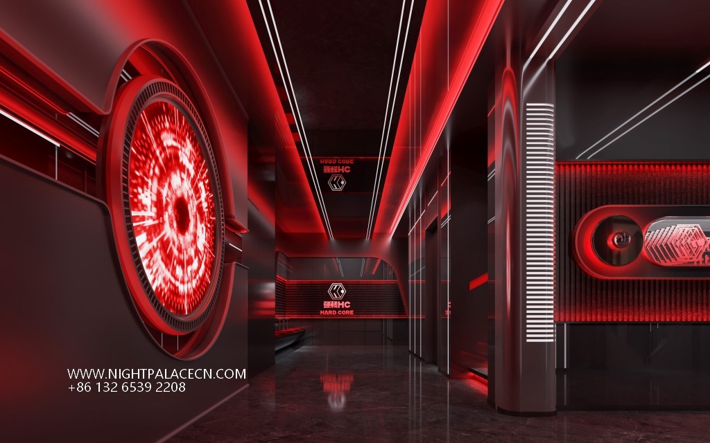 The space covers the main stage area, booth group, private room and technology corridor. The main stage is equipped with top-of-the-line sound and dynamic lighting system, and the red light and shadow respond to the rhythm of the music; the multi-screen linkage in the private room supports private parties; the mirror ground of the corridor reflects the light, extending the sense of space. Technology is hidden in the details: the intelligent light control system can switch modes, from the fiery red of the party to the quiet blue of the corridor, enhancing the rhythm narrative.