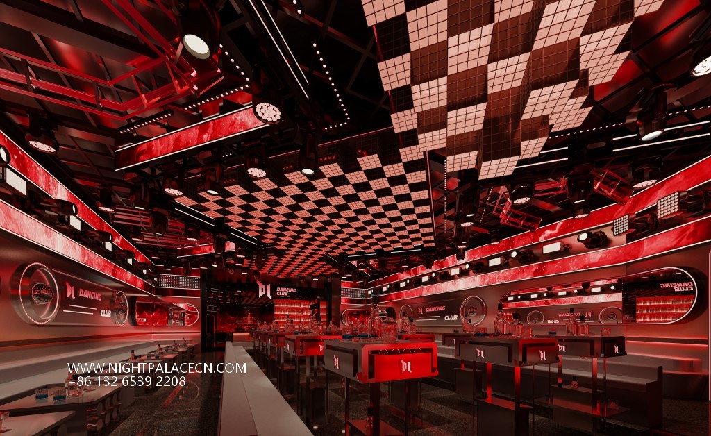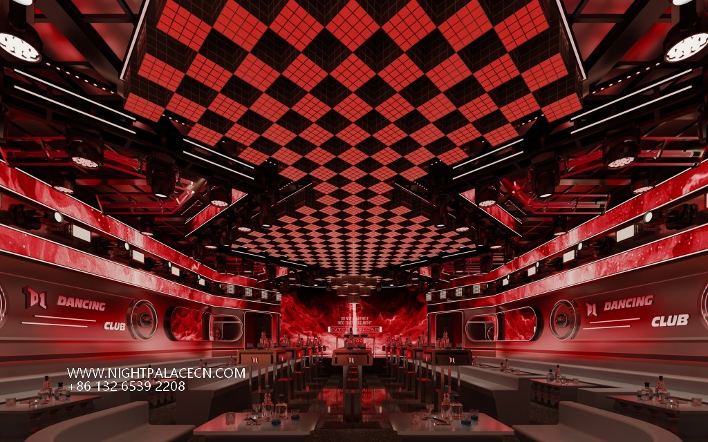 The club uses red and black as the main color to create a tense future scene. The ceiling is based on a black and white checkerboard pattern, embedded with a red linear light array and circular spotlights, simulating the dynamic rhythm of data flow; the repeated "D1 DANCING CLUB" luminous logo on the wall reinforces the brand symbol, forming a hard-core technological sense with the wavy metal decoration. The details highlight the trend genes: the central bar displays a glare wine cabinet, and the social area surrounded by high stools is embellished with candlelight to balance the cold and warm atmosphere.