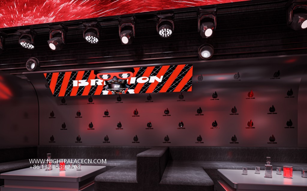 The bar creates a strong visual tension with the iconic red and black color scheme. Six sets of professional lighting equipment are hung on the ceiling of the main hall, and the top spotlight matrix projects dynamic light and shadow; the background wall is centered on a giant LED screen. The "BRITION" brand logo and cartoon image wearing red glasses are rotated, and the black flame pattern wall is matched to strengthen the cool gene. The details highlight the technological narrative: the booth area is contrasted with the dark gray sofa and the white coffee table, and the red linear light outlines the space to create an immersive atmosphere.