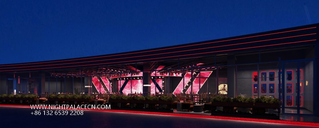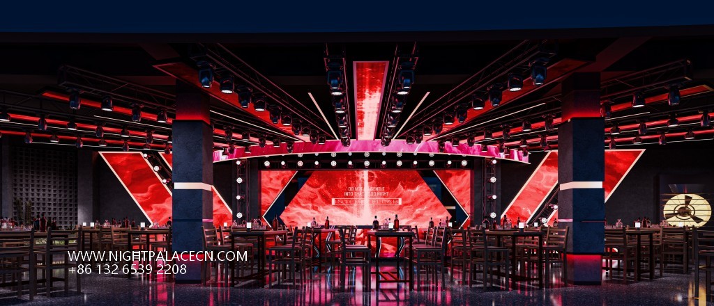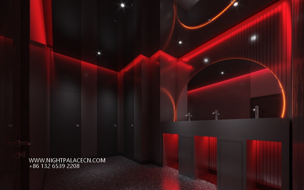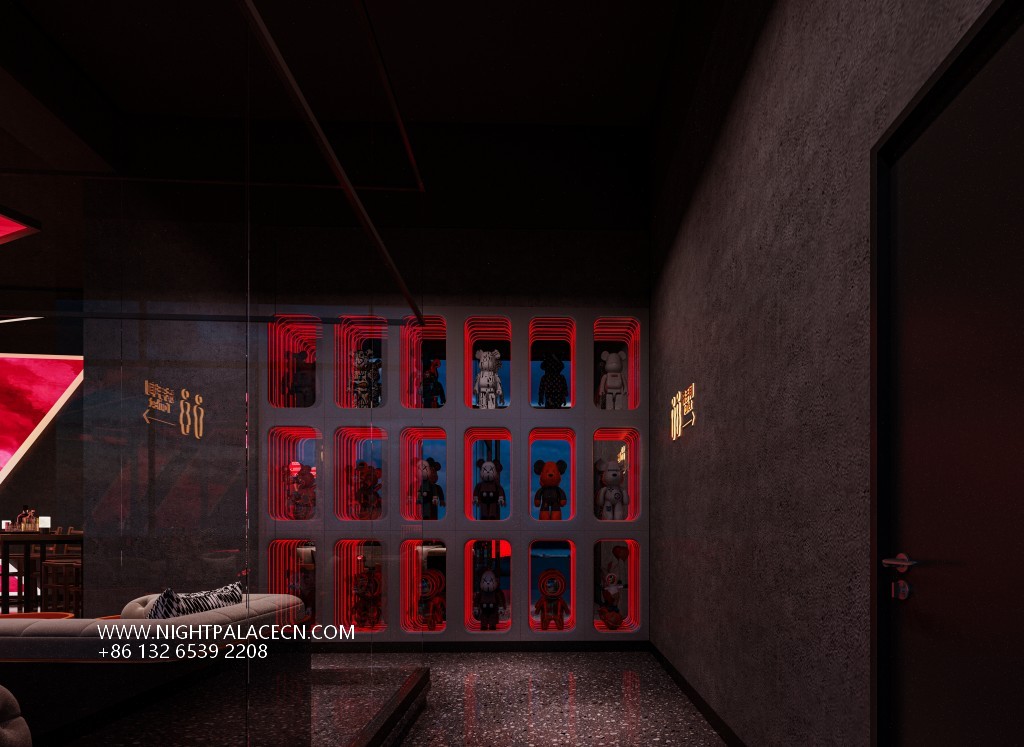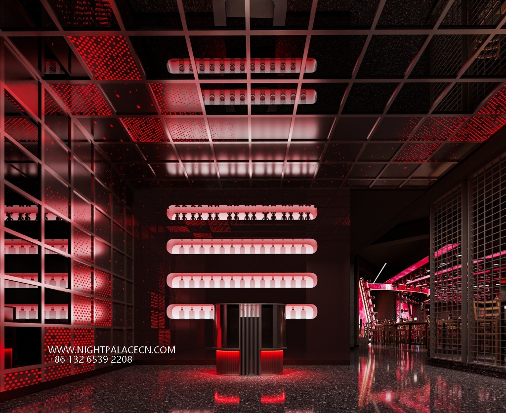 The exterior of Qingba is based on a dark building body, with red linear lighting outlining the outline, and a transparent glass curtain wall introduces the city night scene. The interior space is more layered: the main hall is dominated by black, the red light band at the bottom of the central bar forms a visual focus with the multi-layer wine rack at the back, and the top square ceiling is embedded with red dot light sources, such as starry sky flickering. The stage area is set against the background of a red giant screen, which is combined with radial lighting equipment to create a dynamic atmosphere. The details highlight the trend genes: the wall 20-grid trendy play display cabinets, red hollow partitions and metal mesh guardrails inject smart fun into the tough industrial style.