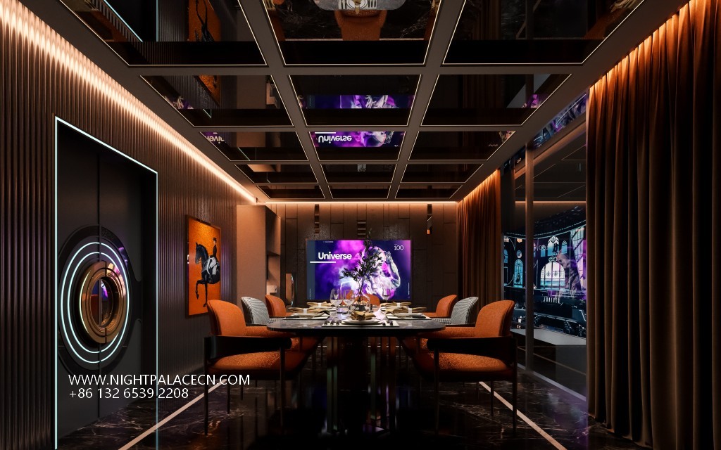 The space covers the party area of the main hall, the sci-fi corridor, the booth group and the art lounge area. The central dance floor is equipped with state-of-the-art sound and lighting systems, and the starry sky top can switch modes - from deep blue interstellar roaming to blazing orange energy bursts; the corridor area extends infinite depth with geometric light frames and mirrored floors, and the orange seats and art paintings in the booth area balance the technology. Technology is hidden in the details: the intelligent light control system is linked with multiple screens to enhance the sense of spatial rhythm.