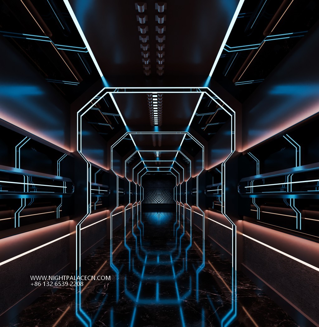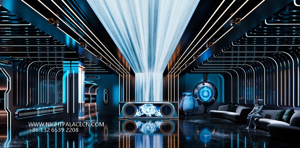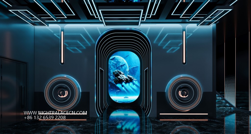 The entrance to the club is guided by the visual guidance of a space-time tunnel with blue and brown two-color light strips, and the interior space is more futuristic: the main hall is based on the concept of a cosmic dome, the ceiling simulates the effect of a starry sky, and the giant spacecraft installation is suspended in a blue halo; the background giant screen rotates the dynamic screen of the "Universe" theme, forming an interstellar dialogue with the wall planet pattern. The details highlight the sci-fi gene: the energy ball luminous device in the bar area, the silver humanoid sculpture and the circular light strip work together to create a space capsule scene intertwined with reality.
