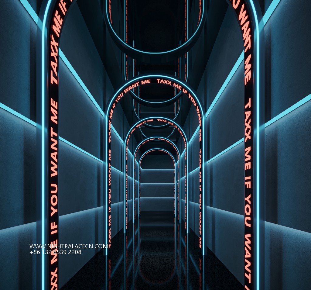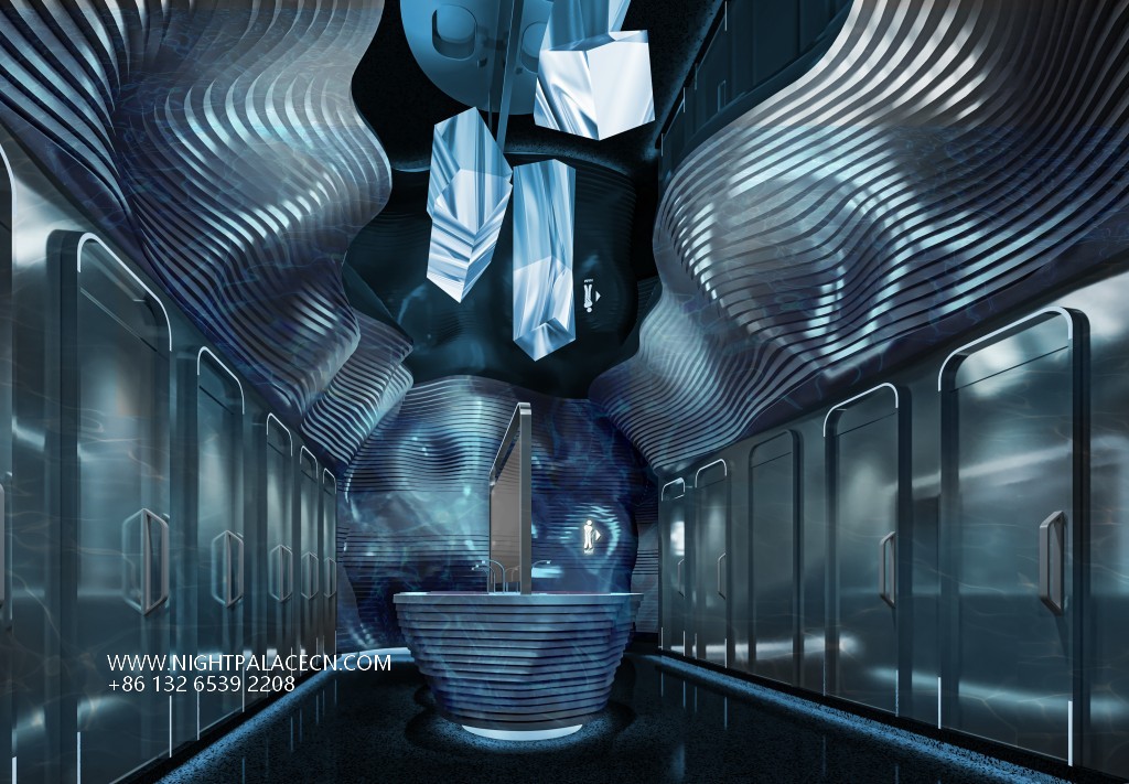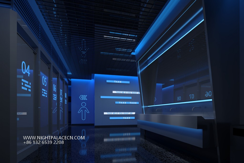 The bar entrance is built with a luminous arch and the "TAXX" logo to create a strong visual impact, and the interior space is more futuristic: the wavy metal bar in the main hall and the top suspension crystal device interweave flowing light and shadow; the channel area is extended in depth by an array of red and blue arches, and the interactive slogan "IF YOU WANT ME TAXX ME" is displayed in a loop on the wall to strengthen the brand symbol. The details highlight the sci-fi genes: the cave-themed box creates an interstellar illusion with the texture of the rock wall and the giant screen of the planet; the bathroom area breaks the tradition with disco balls and corrugated walls to create a blurry light and shadow game.