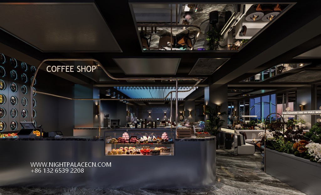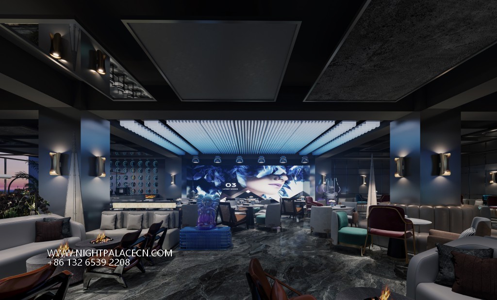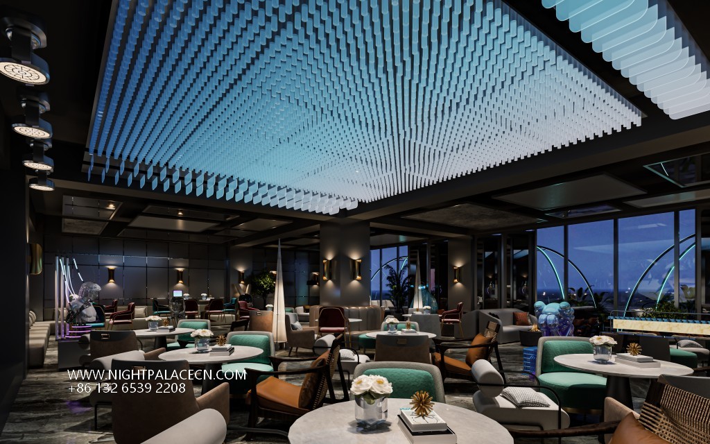 The space covers the bar area, sofa lounge area and landscape seating. The bar offers professional wine service, high stools meet wine tasting and social needs; the sofa area creates a reading corner with comfortable seats and warm table lamps; the floor-to-ceiling windows introduce natural light, and the blue-purple sky outside the window forms a poetic dialogue with the indoor atmosphere. Technology is hidden in the details: the intelligent lighting system can switch modes, from the warmth of the evening to the stillness of the night, enhancing the sense of space rhythm.