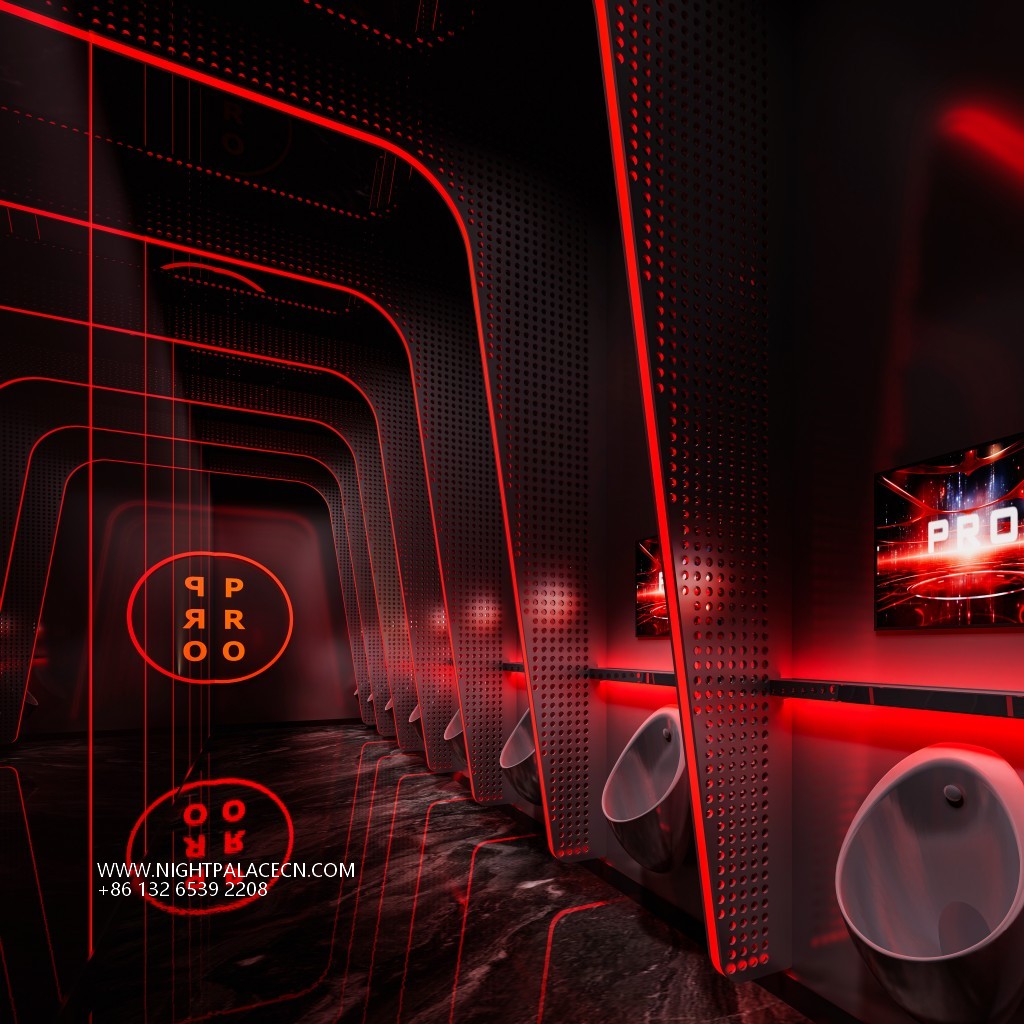 The exterior of the club is visually contrasted with the "SUPER CLUB" luminous logo and pink flower wall, and the silver aircraft installation on the roof and green plants accentuate the tropical style. The interior space is more layered: the entrance is surrounded by a red and black light box corridor to create a sense of mystery, the main hall dome is simulated with a star light array and a ring metal structure to simulate a cosmic fantasy; the background giant screen rotates the "PRO" dynamic vision, forming a cultural dialogue with the Thai carved elements on the wall. The details highlight the crossover gene: the bathroom area is made of perforated panel walls and red and blue light bands to create a cyberspace, and the open-air area is balanced by palm trees and orange parasols.