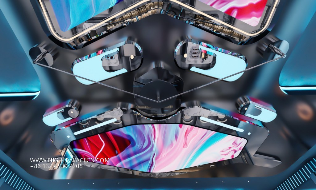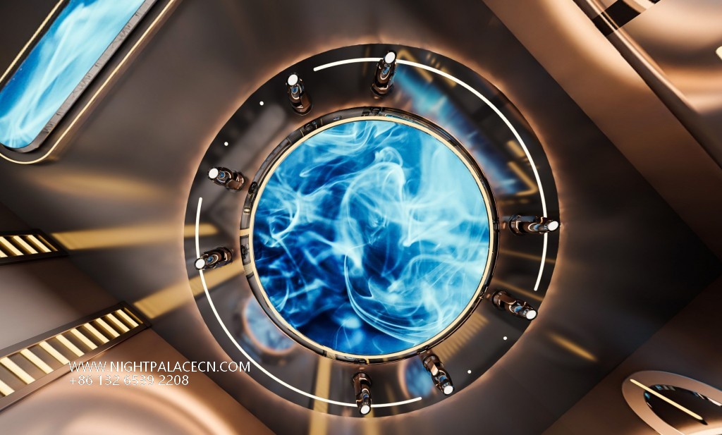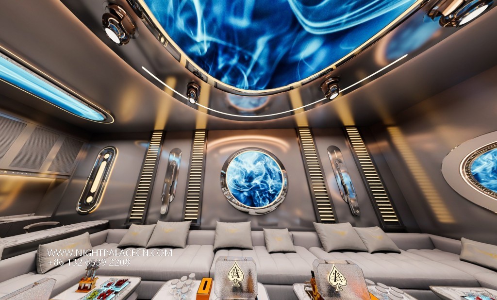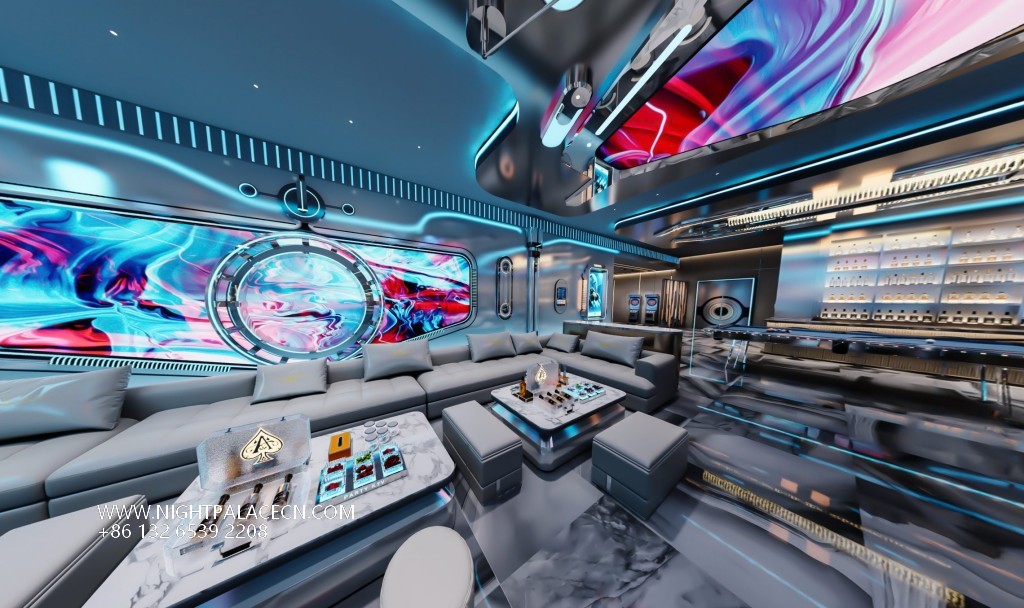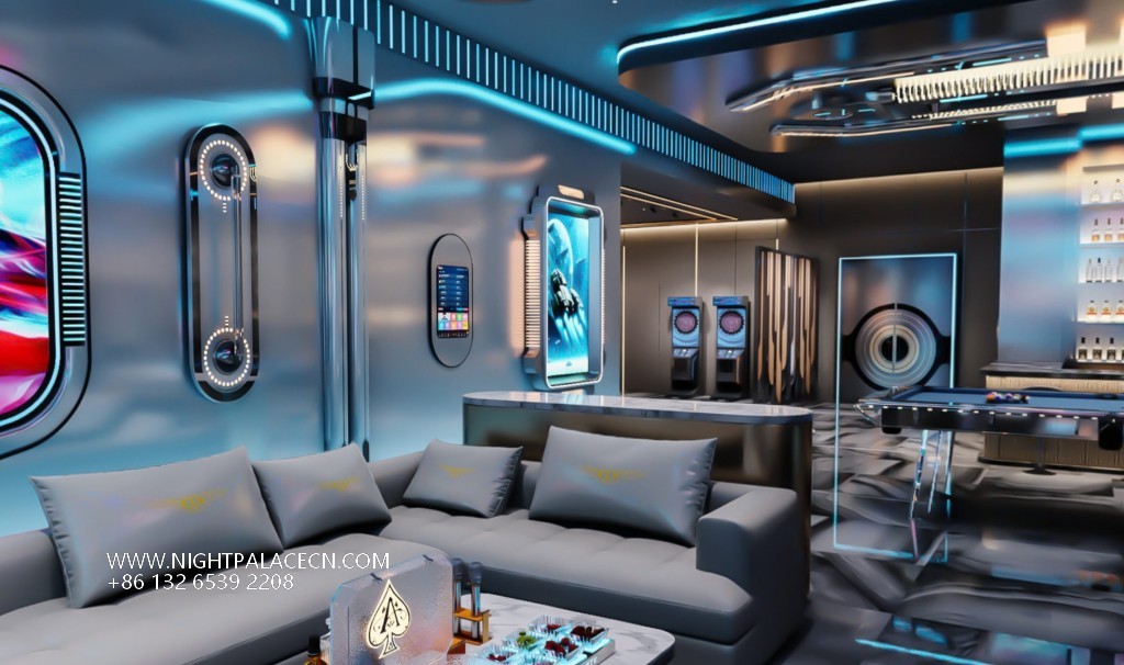 The space is equipped with a separate KTV box, an open billiard area and a bar social area. The KTV box creates a private atmosphere with L-shaped light gray sofa, marble coffee table and circular starry sky ceiling lights. The background giant screen rotates the dynamic screen of "PARTY K" theme, and is matched with a round porthole lighting installation on the wall to enhance the immersion of interstellar exploration. The billiard area is equipped with a professional ball table, adjacent to the whole wall wine cabinet and blue and purple light effect display screen, to meet the needs of competition and wine tasting. The details show ingenuity: bar stools, smart song-ordering screens, hidden linear light strips and "WOW!" welcome signs, together to create an entertainment line with a balance of function and aesthetics.