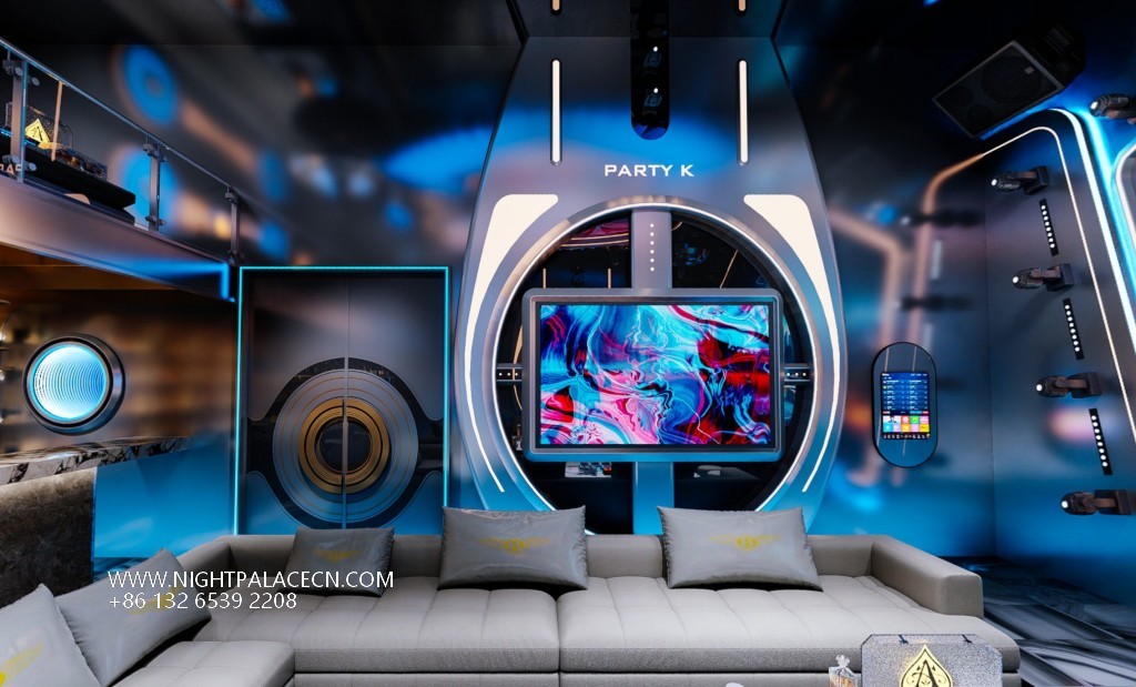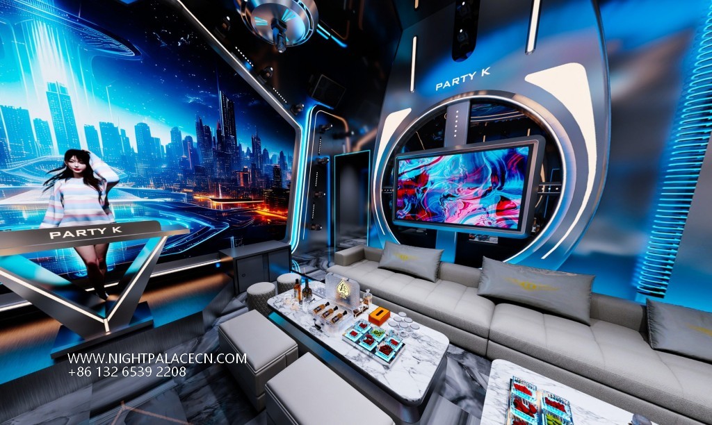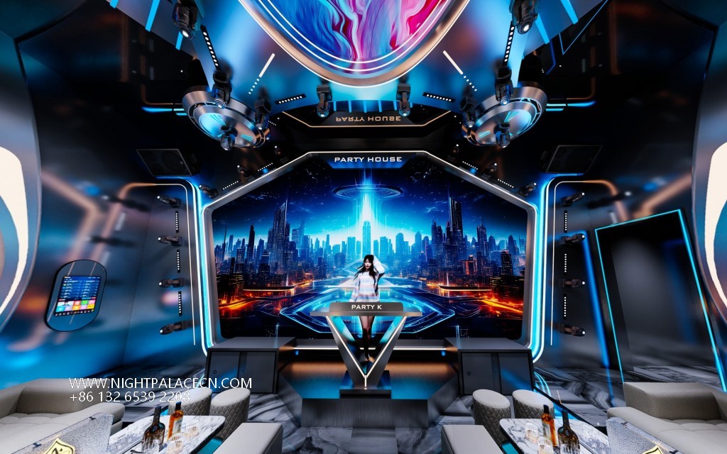 The space uses dark blue and dazzling purple as the main colors to create a future scene full of tension. The luminous logo and circular light strip at the entrance of "PARTY HOUSE" set the technical tone, and the interior is more visual: the main box uses a curved giant screen as the core, rotating dynamic pictures such as urban night scenes and abstract particles, and interweaves with the starry sky light array at the top and the auxiliary screen on the wall to form a multi-dimensional fantasy. The details show ingenuity: L-shaped light gray sofa with marble coffee table, transparent wine cabinet display in the bar area, round sound installation and "PARTY K" logo to strengthen the trend gene. Background wall blue and purple light band extends in depth, specular reflection expands the sense of space.