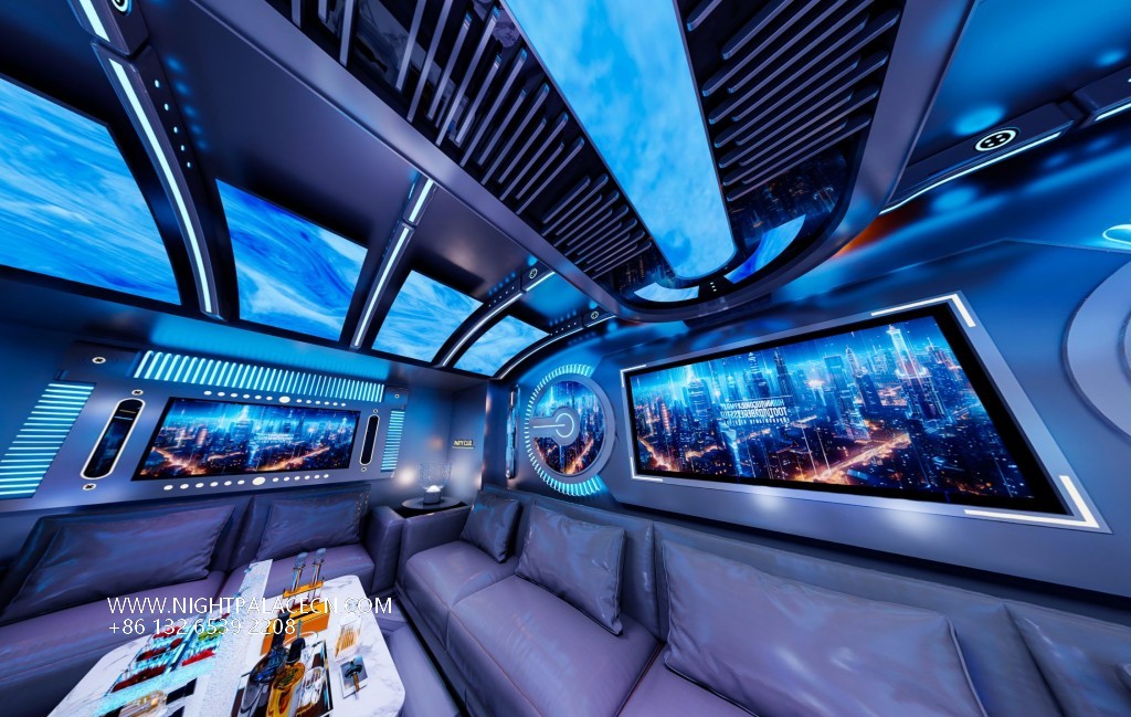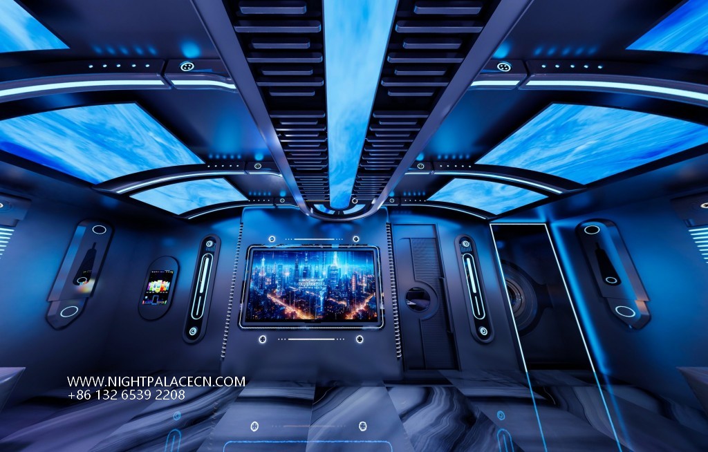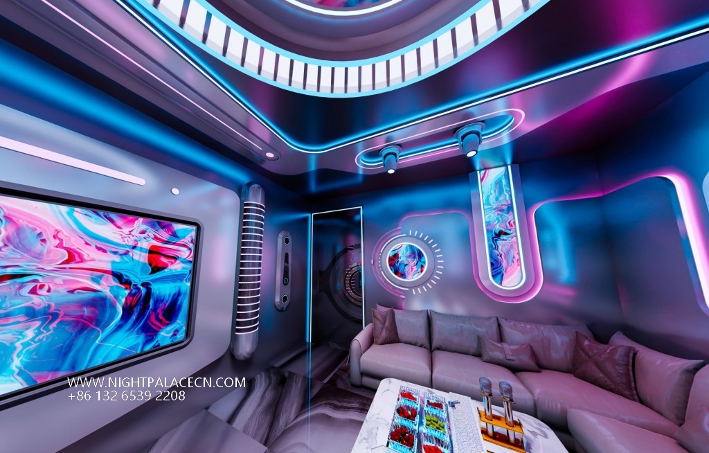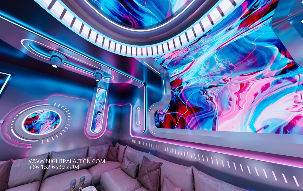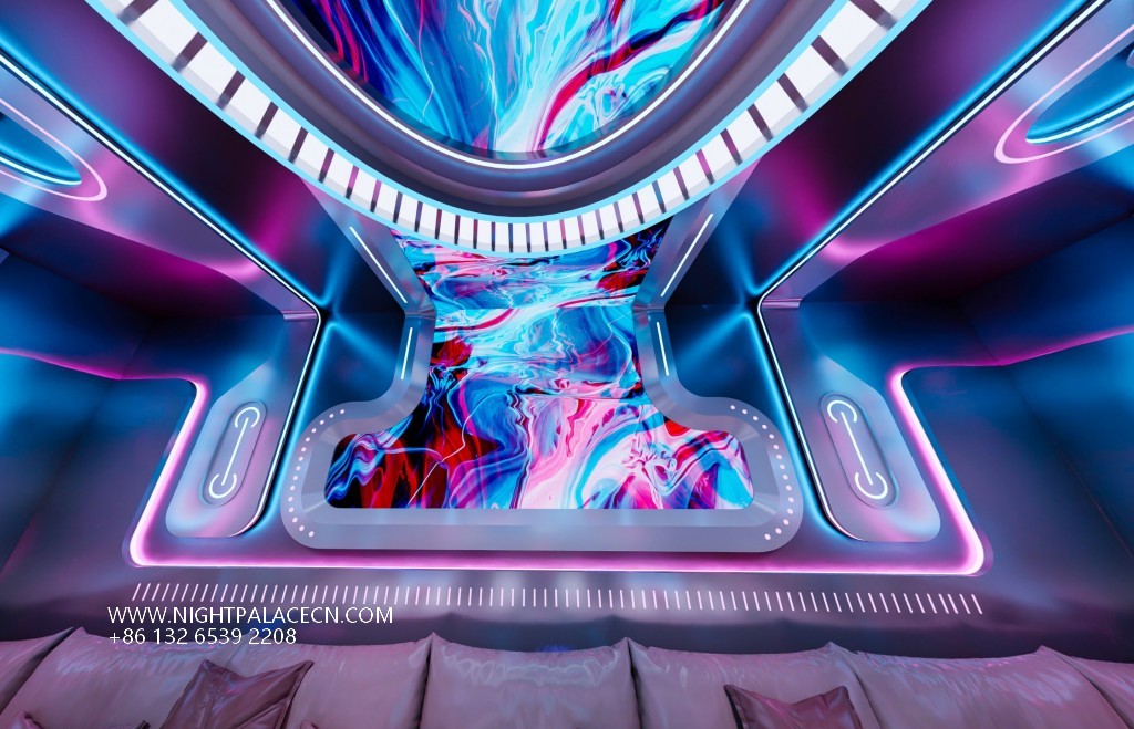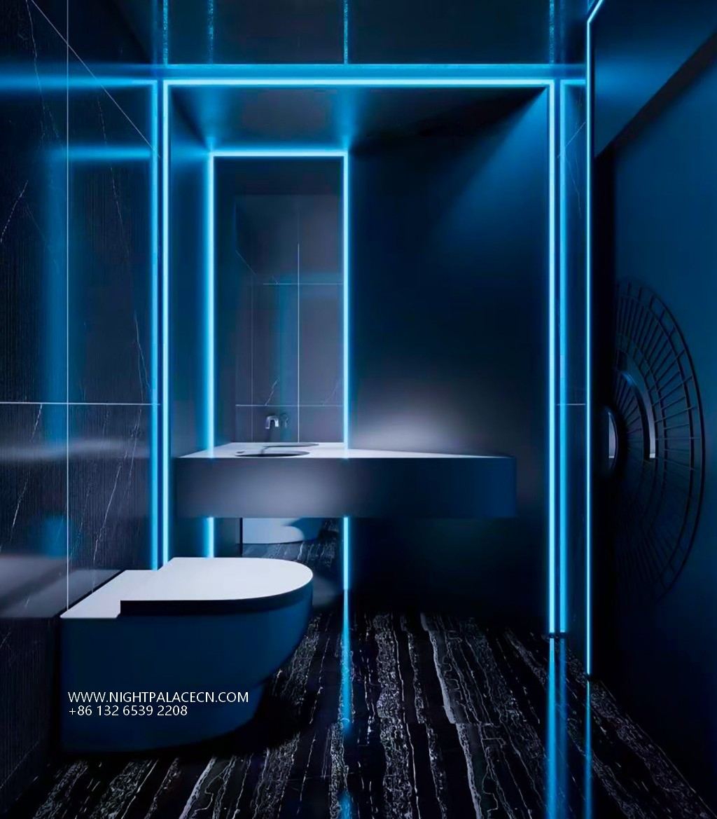 KTV is based on dark colors to create a private and avant-garde atmosphere. The curved sofa in the box surrounds the marble coffee table, and the giant screen on the background wall rotates the city night scene, abstract particles and other dynamic pictures, and interweaves with the top ring light array to form a starry sky fantasy. The wall design is original: the symmetrical geometric frame is embedded with blue powder gradual change light bands, which extends the space level like a "Jiugongge" matrix; the bathroom area is outlined with dark blue neon lines, and the circular art installation and metal texture highlight the cybergene. The details show the technical narrative: the song-ordering screen is integrated with the "WWW.NIGHTPALACEN.COM" smart interface, and the microphone stand and hidden sound system are both beautiful and functional.