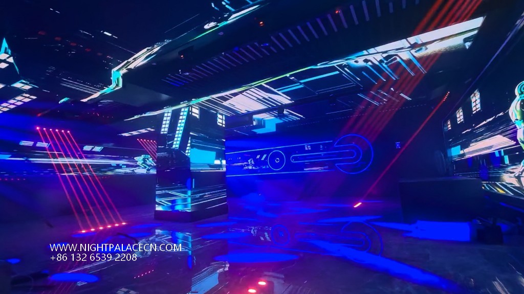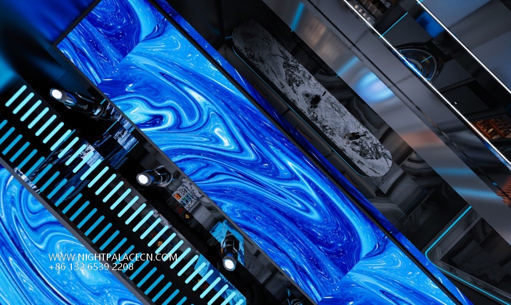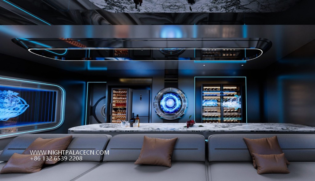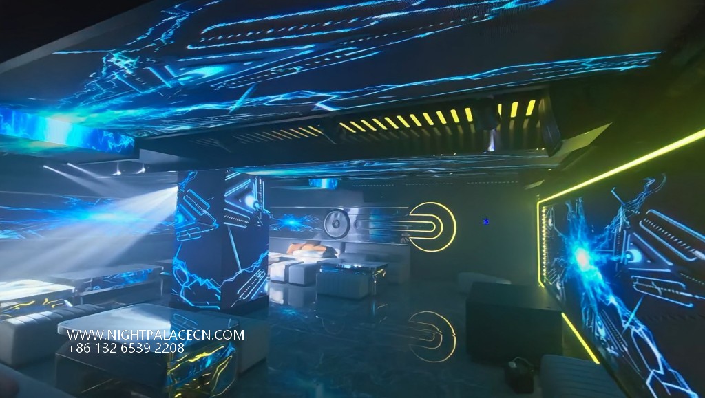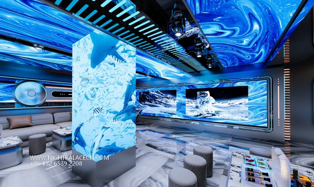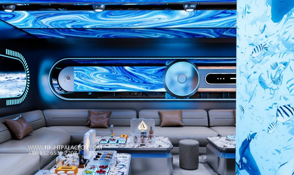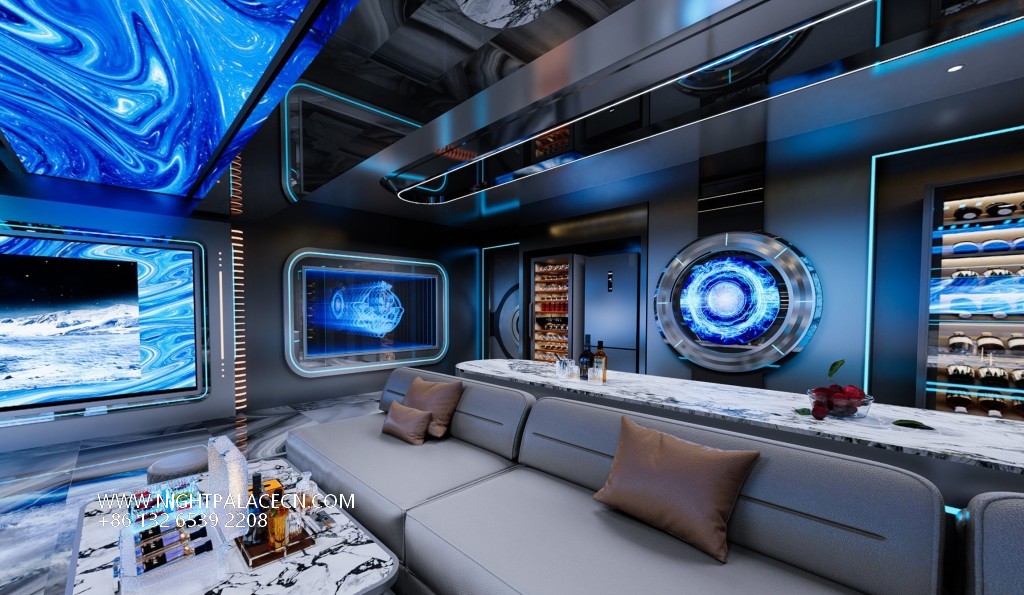 The space is dominated by dark colors, creating a private and avant-garde atmosphere. The luminous logo and circular light strip at the entrance of "PARTY HOUSE" set the technical tone; the interior of the box is more visually impactful: the curved giant screen rotates dynamic pictures such as cosmic galaxies and snow-capped mountain auroras, interweaving with the top starry sky light array and wall auxiliary screen into a multi-dimensional fantasy. The details show ingenuity: L-shaped light gray sofa with marble coffee table, transparent wine cabinet in the bar area displays beautiful wine; the blue-purple light belt of the background wall extends in depth, and the circular porthole device strengthens the theme of "Star Cruise". Technological genes penetrate every corner: the song screen is integrated with a smart interface, and the hidden sound system ensures that the sound field is surrounded and shocked.