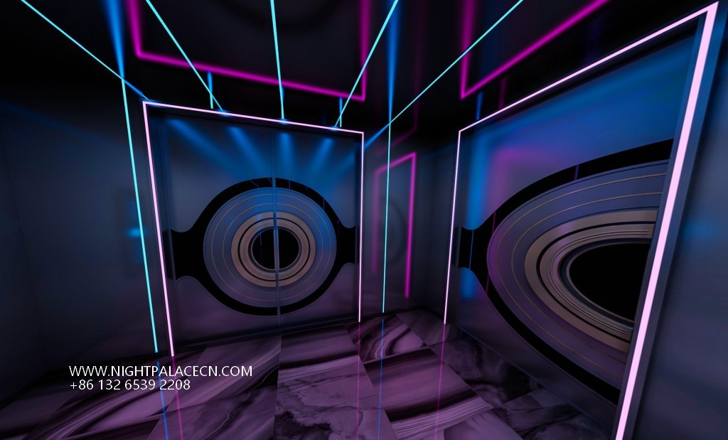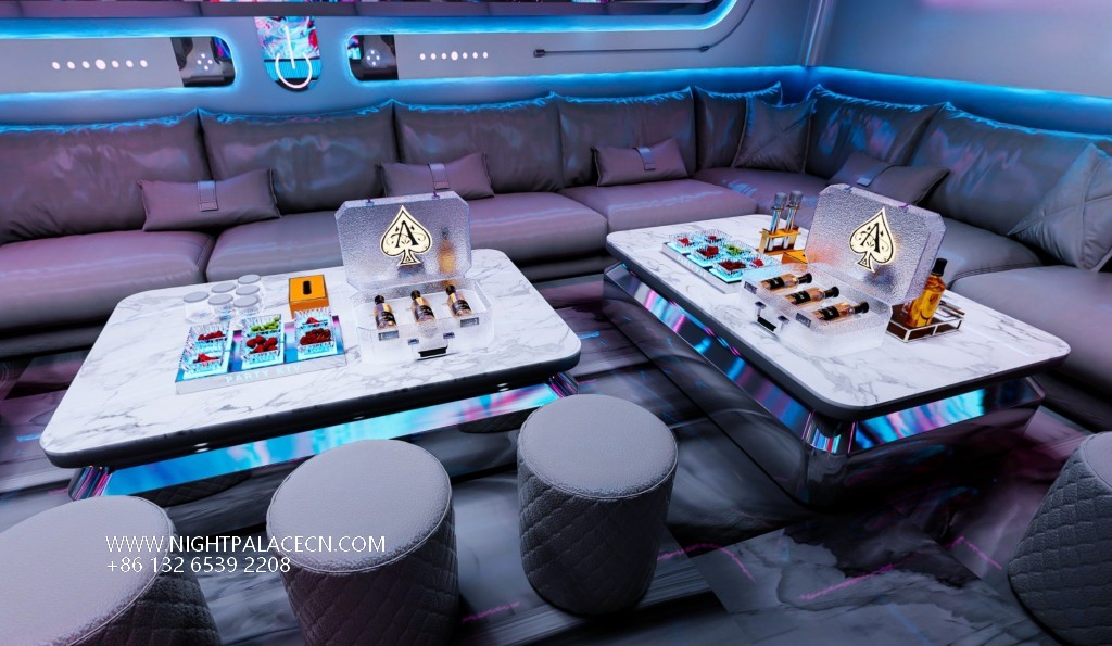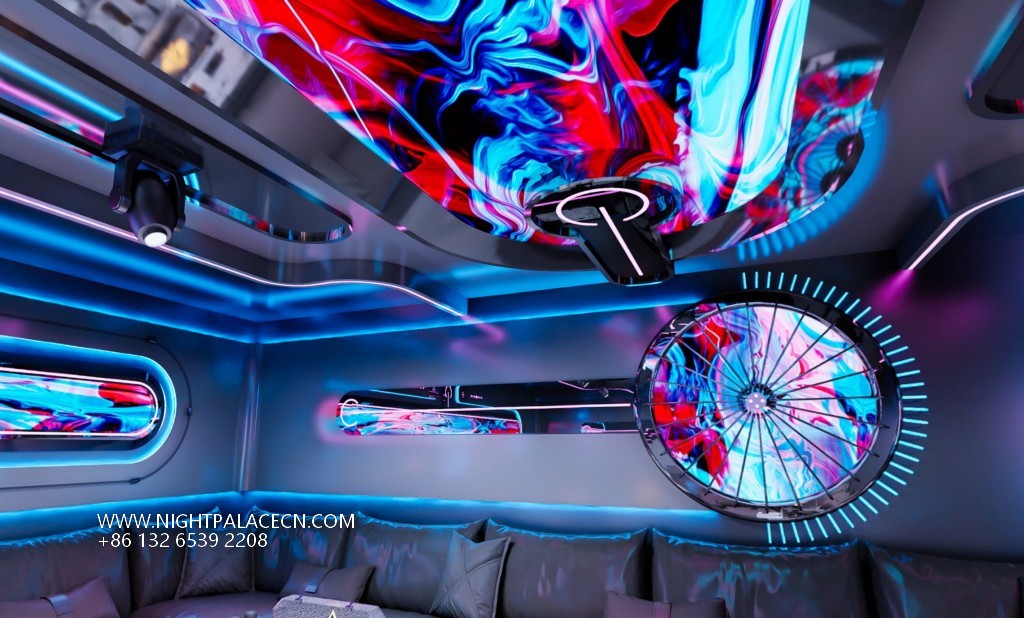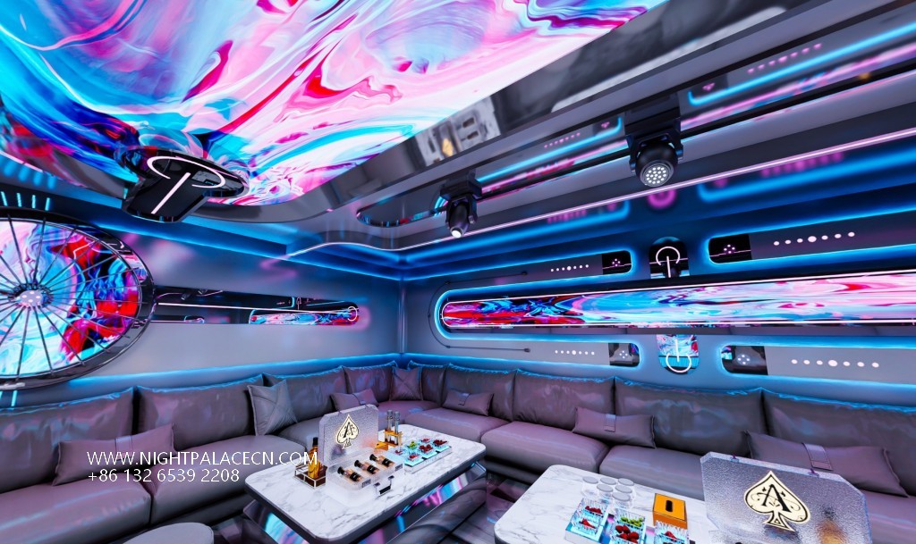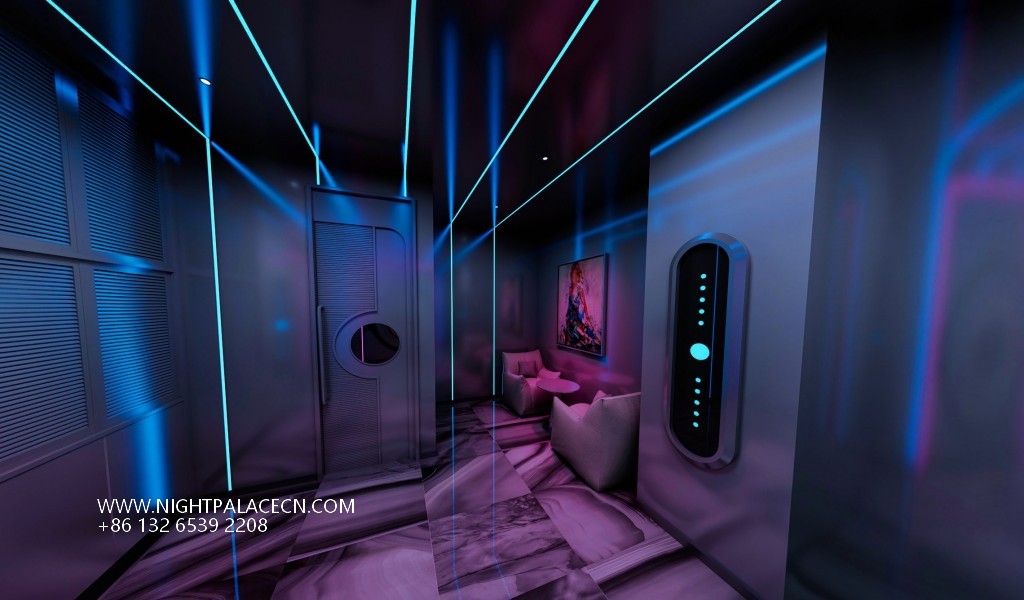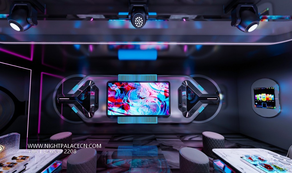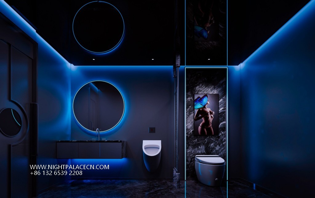 KTV is dominated by dark colors, creating a private and avant-garde atmosphere. The L-shaped gray leather sofa in the box surrounds the marble coffee table, and the background giant screen rotates abstract particles, cosmic galaxies and other dynamic pictures, interweaving with the top ring light array and wall auxiliary screen to create a multi-dimensional fantasy. The details show ingenuity: the ceiling flowing color light strips are like liquid neon, and the wall round decoration is embedded with blue and purple halos. The vinyl record-shaped door decoration enhances the music gene. The bathroom area features dark blue marble walls, circular luminous mirrors, and art paintings to create a collision between science fiction and light luxury.