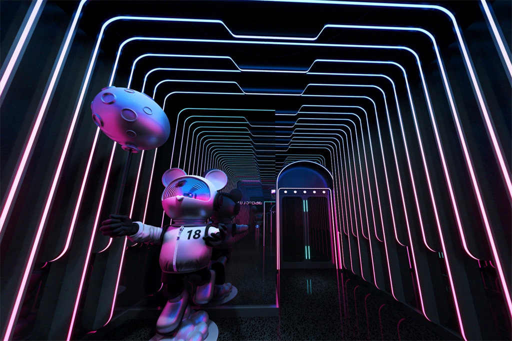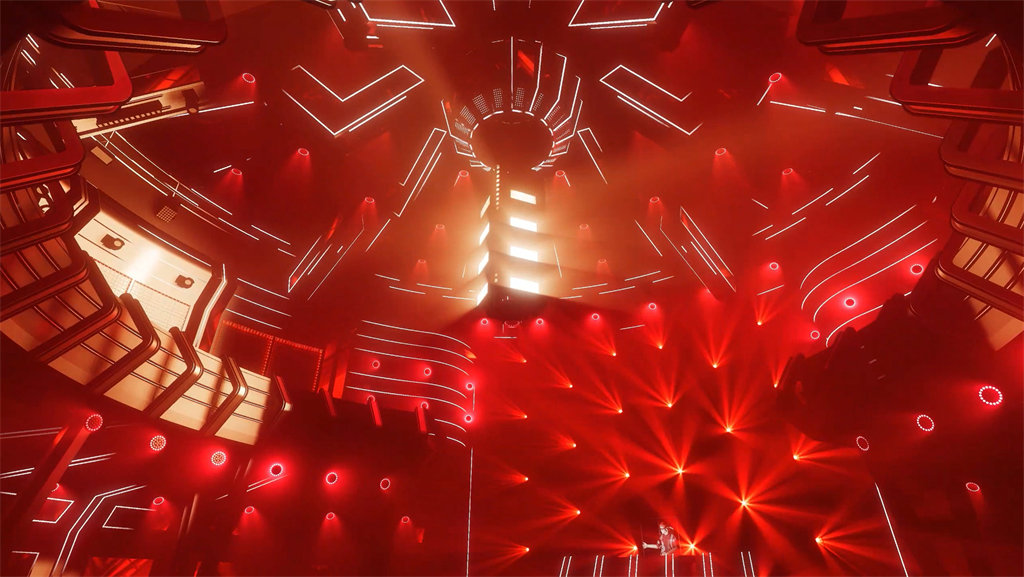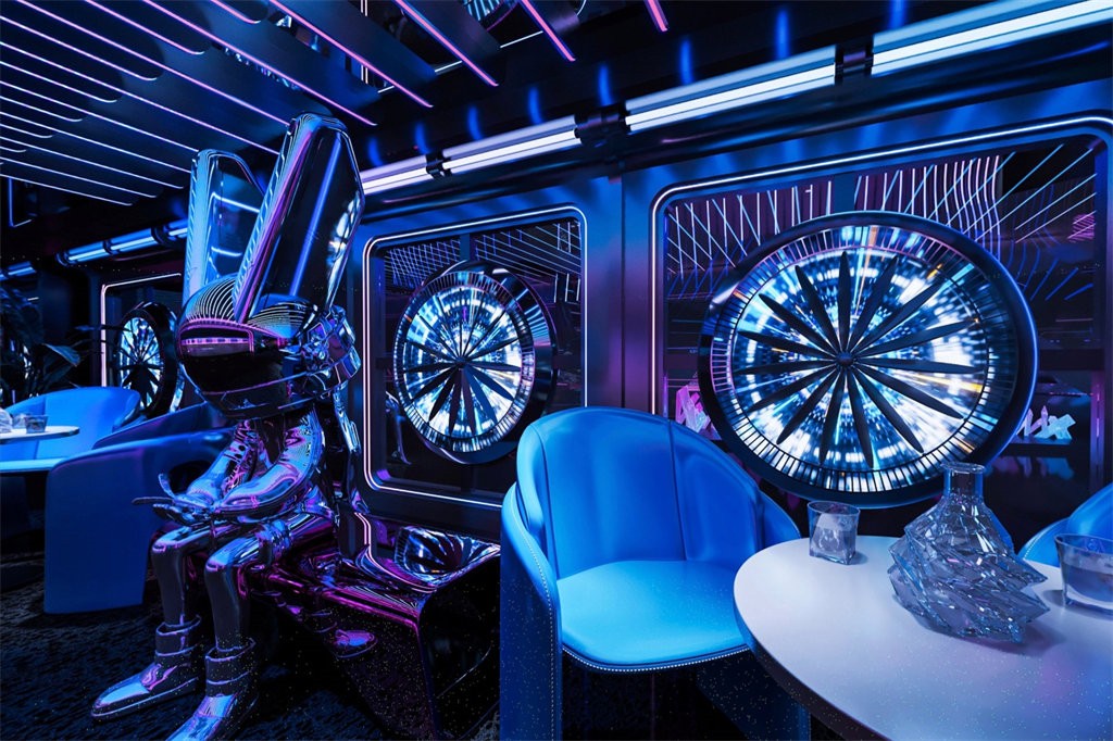 The core area of the bar is a rotunda with an overall height of 9 meters. The high-rise design makes the space more open and creates a magnificent and atmospheric scene. At the center of the hall is a highly technological ** mechanical lifting stage light stand **, which is the visual and functional focus of the entire space. This installation can not only lift and change according to the needs of music and activities, but also give the space a strong sense of futurism and dynamic beauty through the combination of dynamic lighting, projection and mechanical movement. Whether it is a DJ performance, a live show or a theme party, this mechanical device can become an absolute highlight of the audience, bringing a shocking visual impact to the guests.