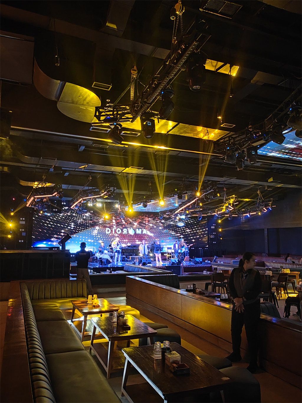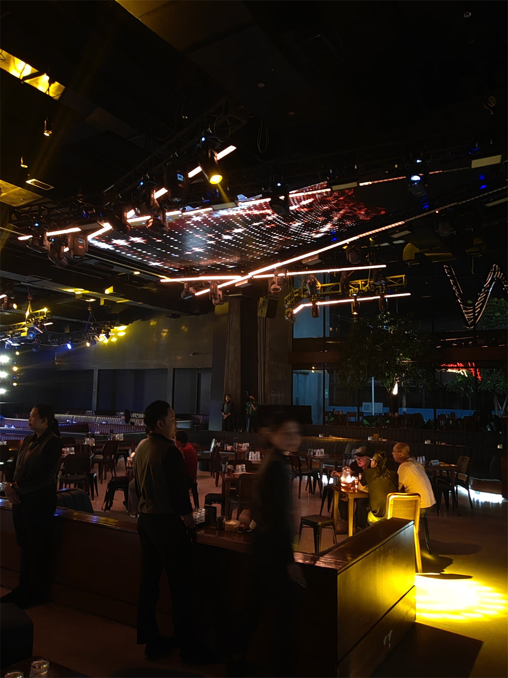As the core of the ** Livehouse ** bar, the design of the large stage is one of the highlights of the whole project. The stage adopts the layout of the ** large choreography table **. The spacious space is not only able to accommodate bands and performers, but also provides an excellent visual experience for the audience. The stage background wall is made up of multiple LED screens. The distribution of the screens has been carefully designed to present a variety of visual effects according to different event needs. From live concerts to theme parties, LED screens can display dynamic pictures, video content or lighting special effects, which are perfectly synchronized with music and performances, creating a strong audio-visual impact.