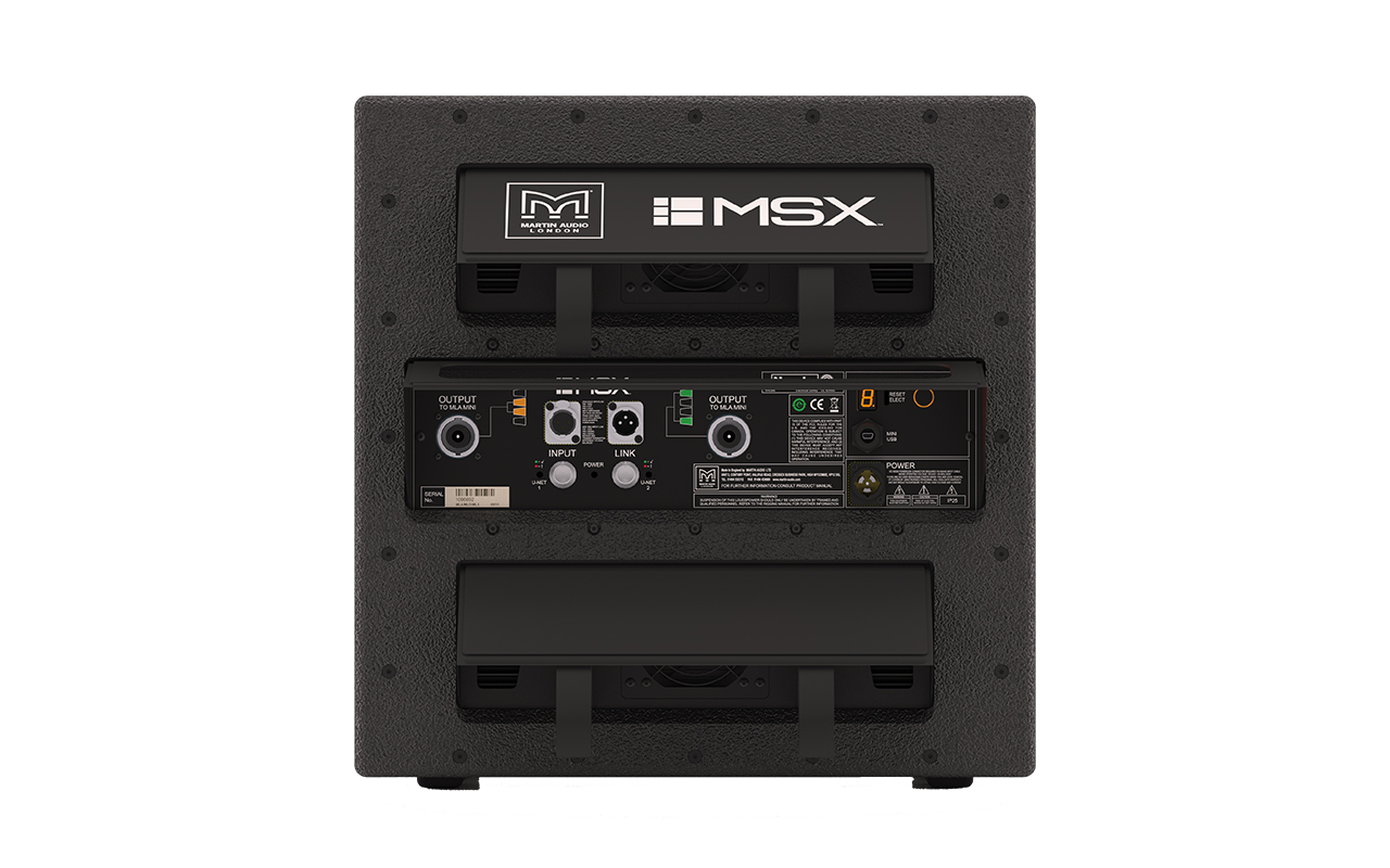 The MLA Mini full-range line array and MSX can be controlled remotely over a U-NET ™ network. Small systems (e.g. configurations of 4 MLA Minis and 1 MSX) can be set up to plug and play without external controls and call on-board presets via a rear skin selector switch. The MSX is the same width as the MLA Mini and can be integrated into a hanging array or stacked separately. It features a 15 " (380 mm)/4" (100 mm) voice coil with a reflective drive unit mounted in a very compact housing. For full installation versatility, its subwoofer amplifier channel can be used to power the MSX or the alternative Martin Audio 4Ω passive subwoofer. For optimal bass performance, the MLA Mini/MSX combination is available for use with an active DSX subwoofer.