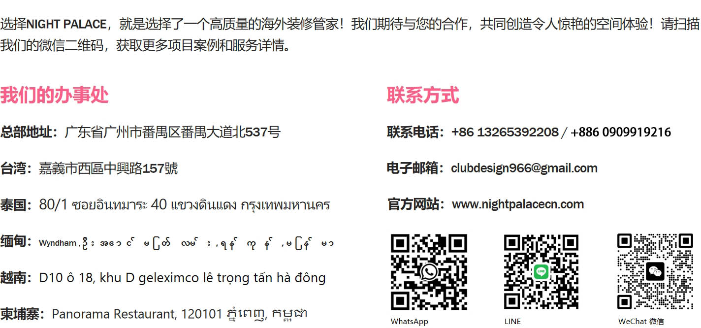 The mission of NIGHT PALACE is to create high-quality decoration spaces for the world, providing one-stop comprehensive services from design to decoration. Strict quality control system ensures that every detail is meticulously crafted to create a competitive commercial space in the local area.