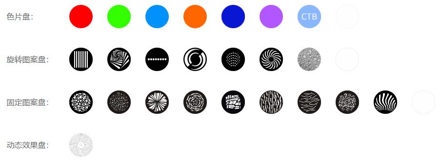 1 rotating pattern disc: 7 plug-in rotating pattern pieces + white circles, with pattern dithering and pattern arbitrary positioning functions